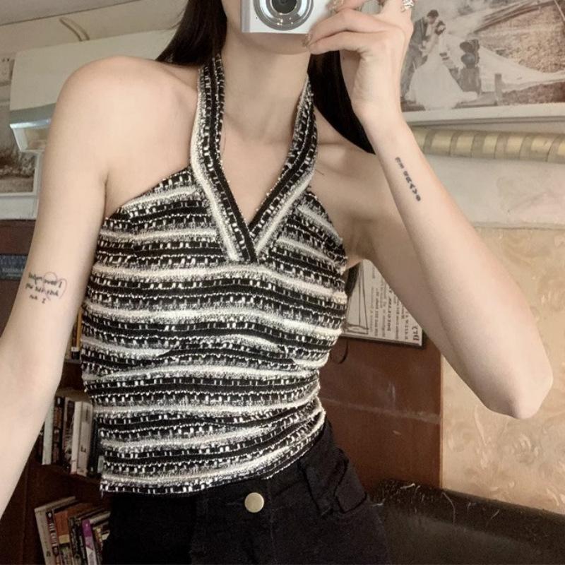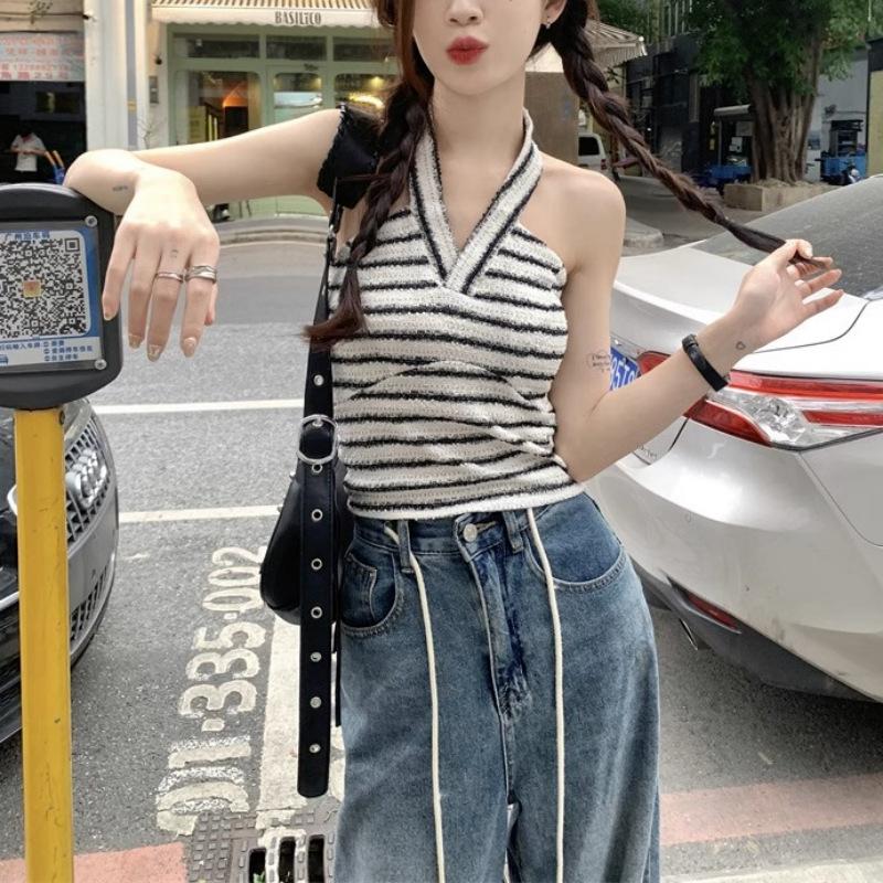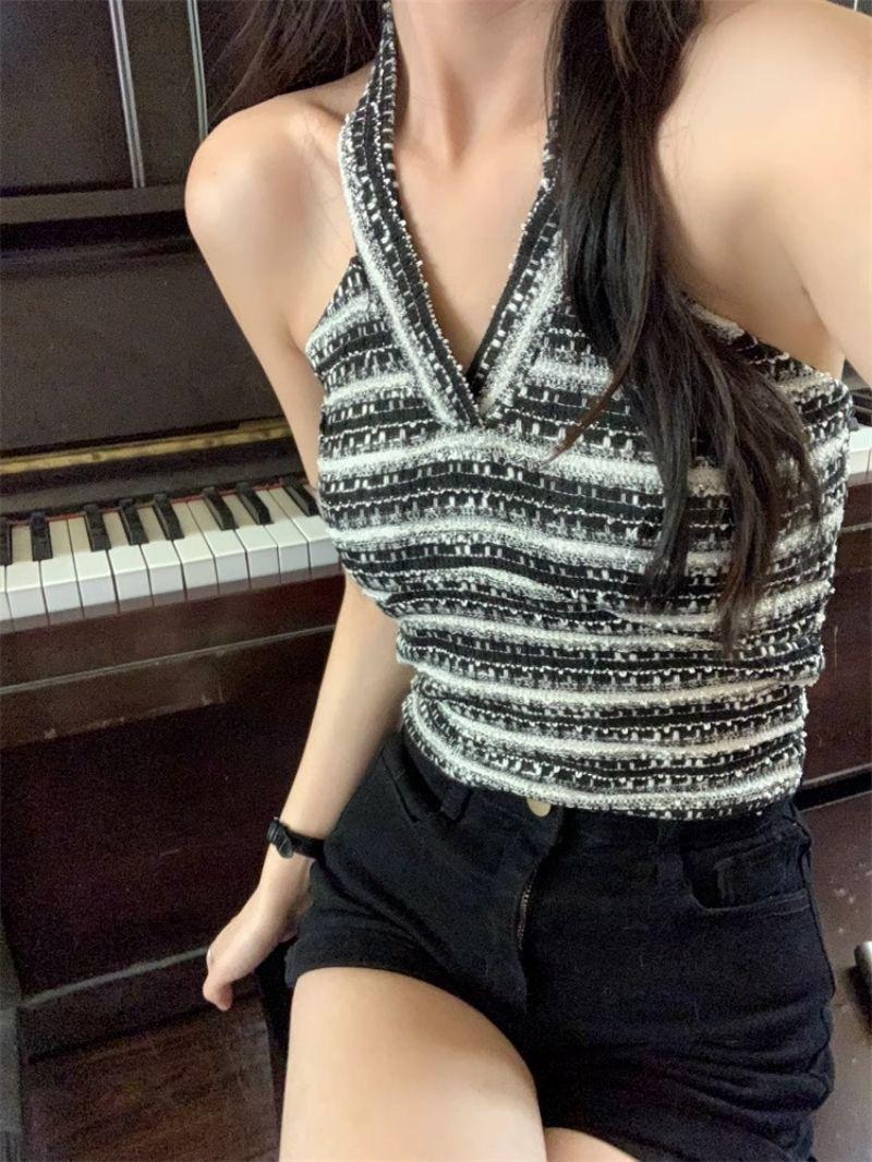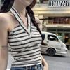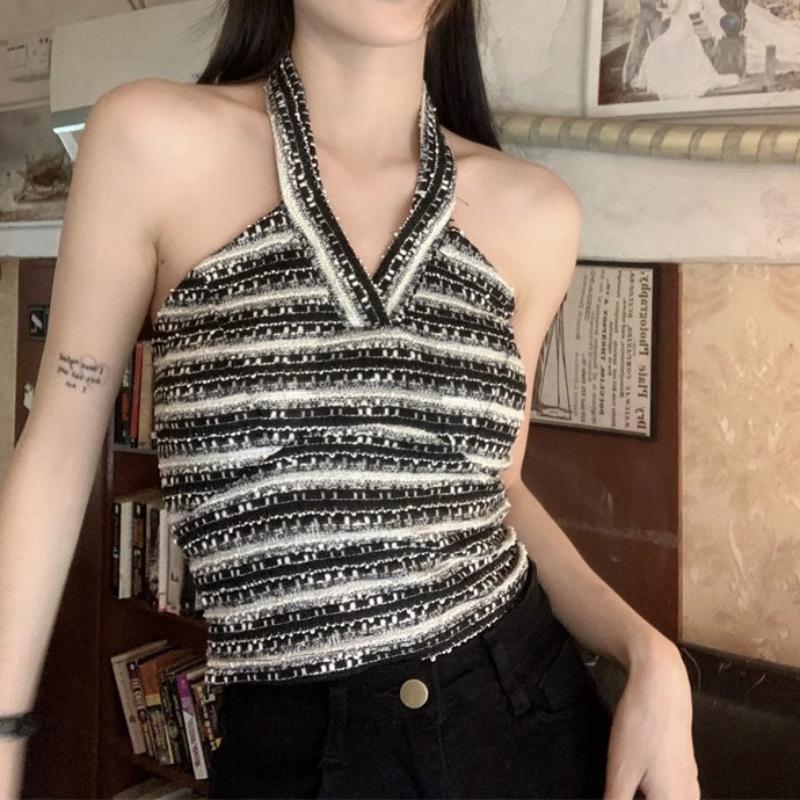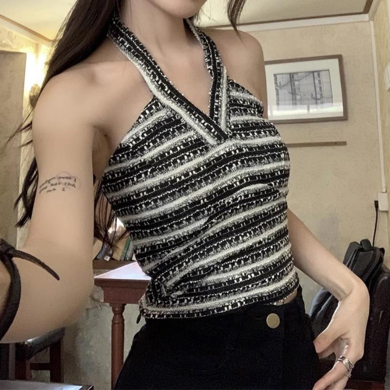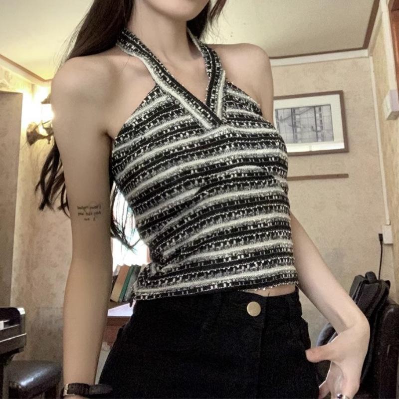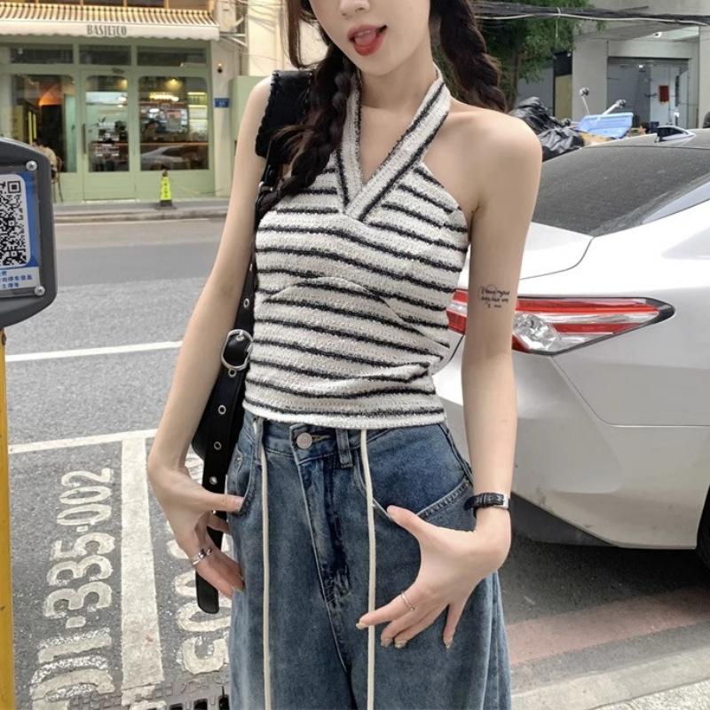 Chaleco de cuello a rayas para chica sexy, tirantes pequeños, ropa interior de verano para mujer, top francés corto ajustado con hombros descubiertos