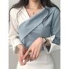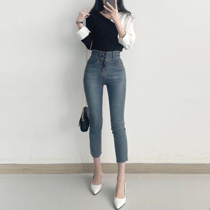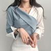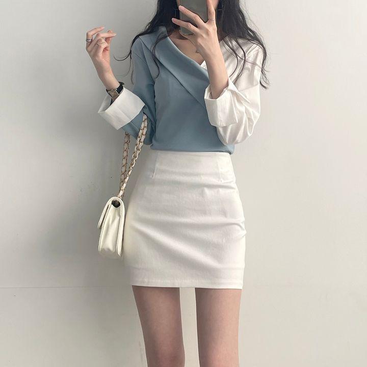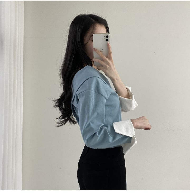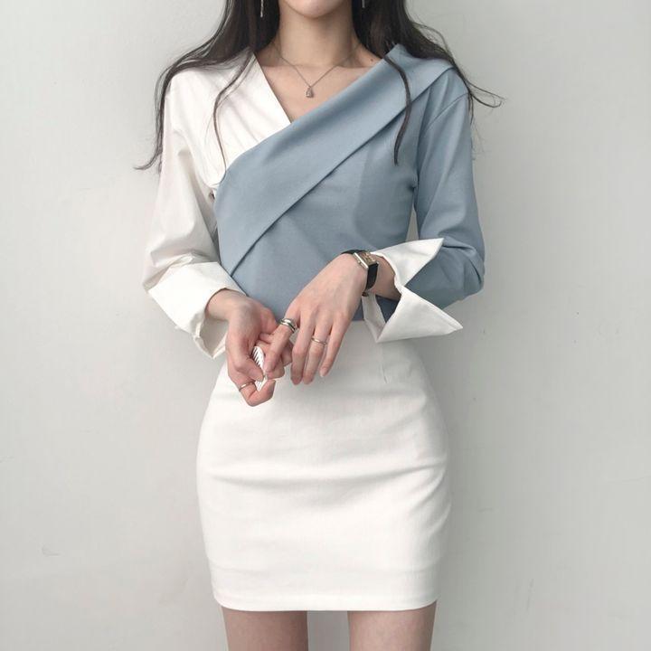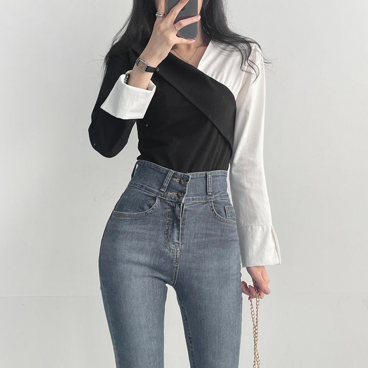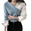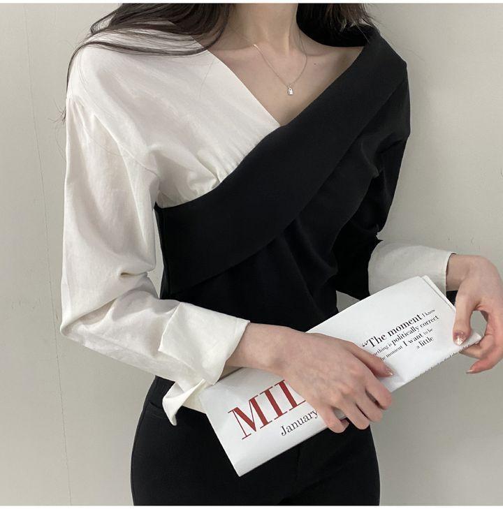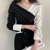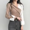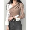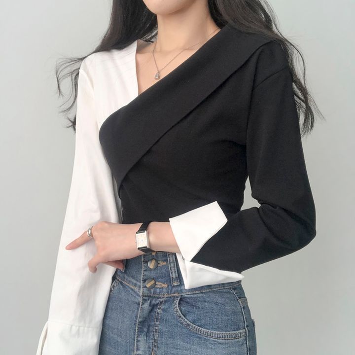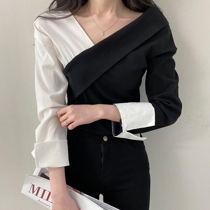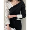 Blusa con hombros descubiertos para mujer, estilo coreano chic, estilo retro, elegante, con costuras en contraste de colores y diseño de nicho.
