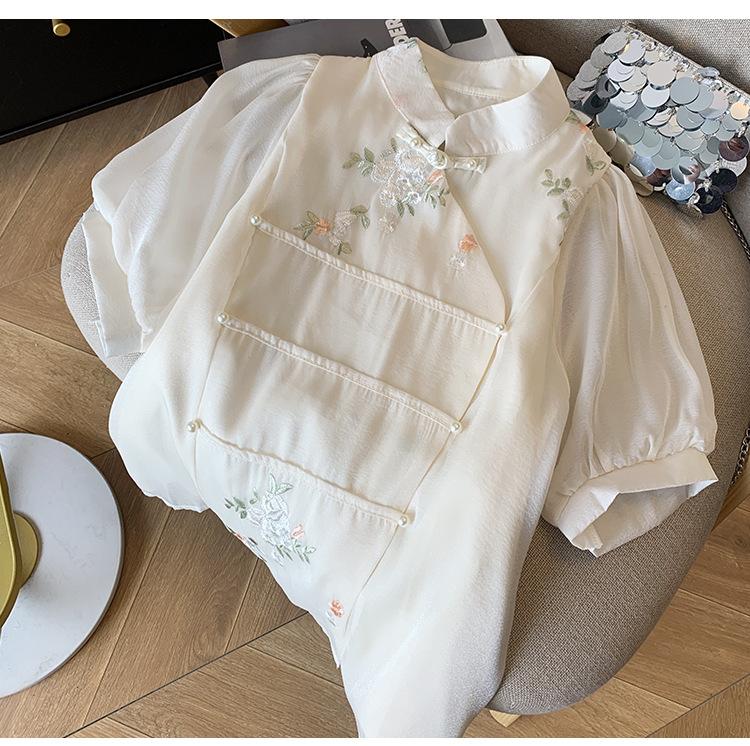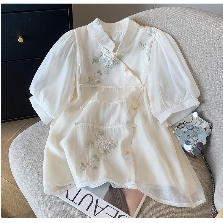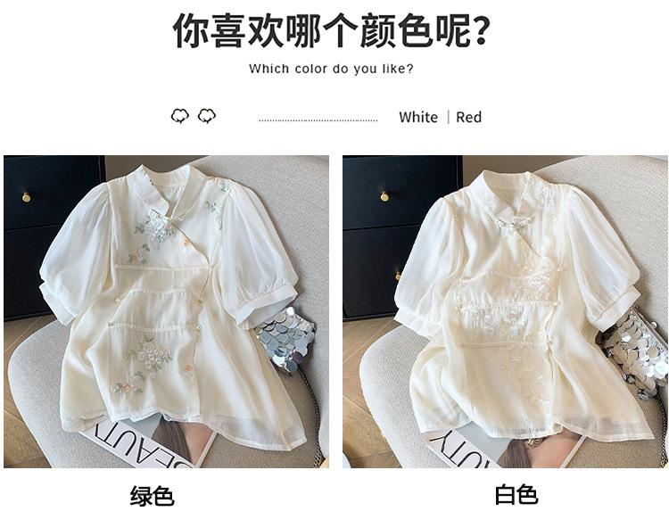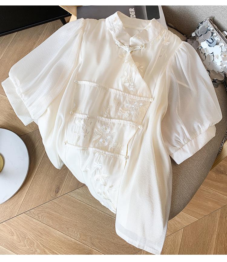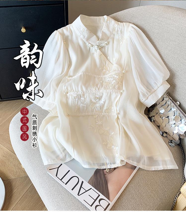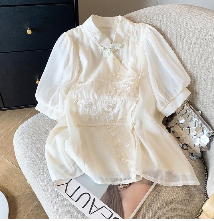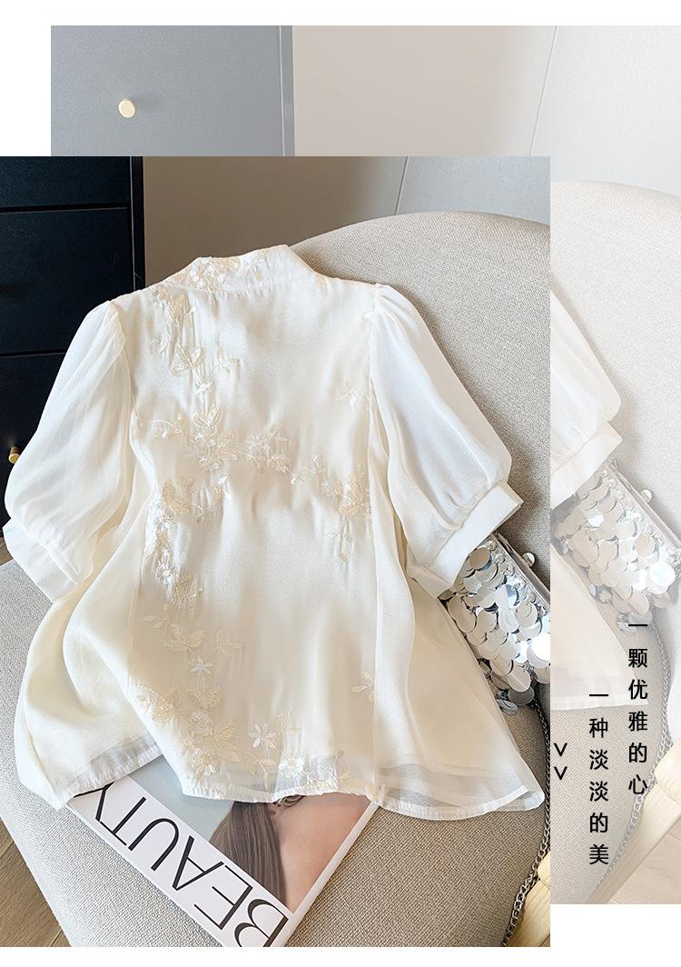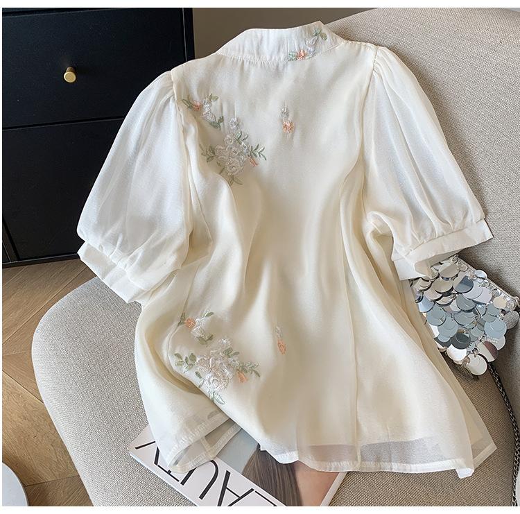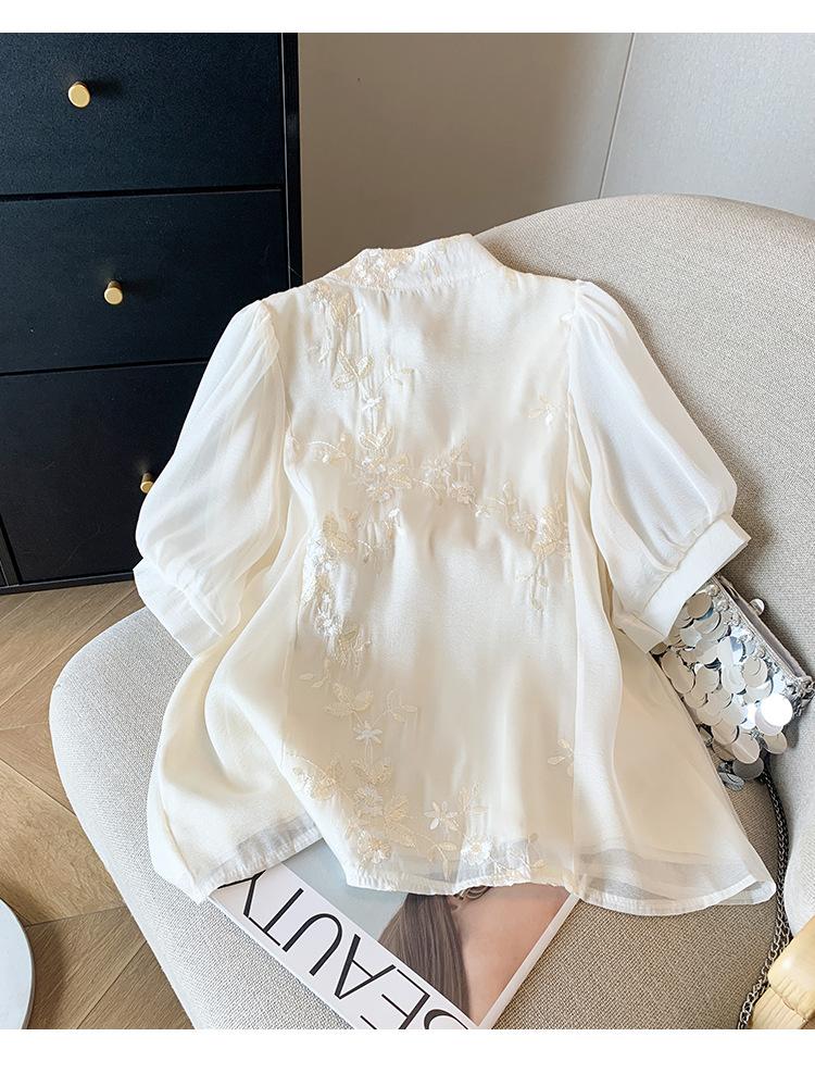 Foto real de tops nuevos de verano para mujer, estilo chino moderno, cuello alto, camisa bordada con botones, versátil, blusa de gasa que reduce la edad