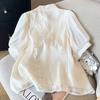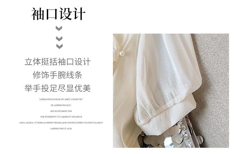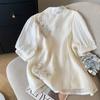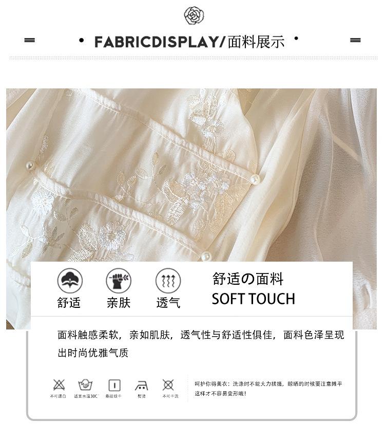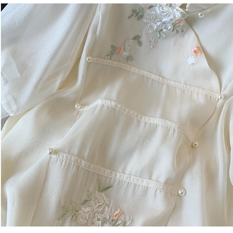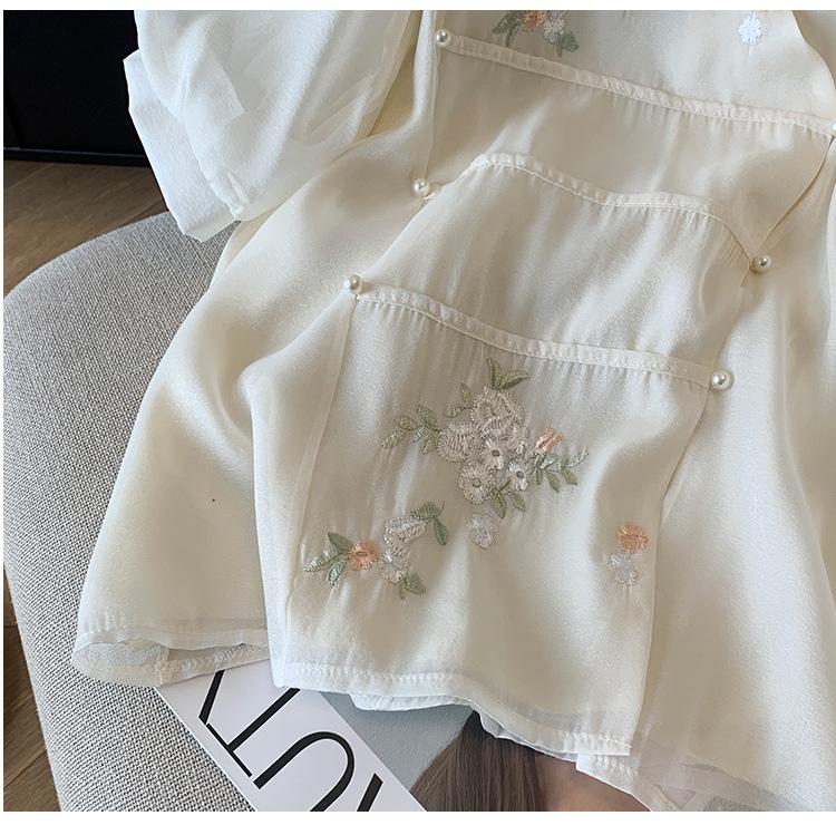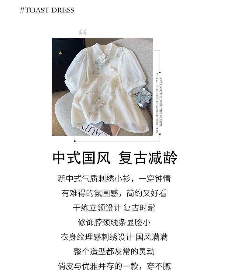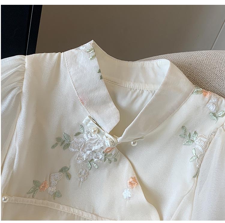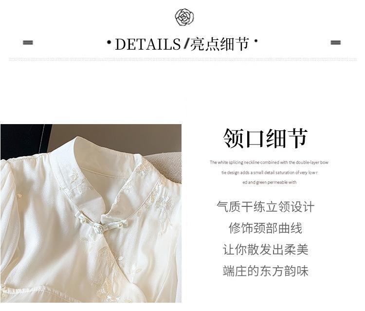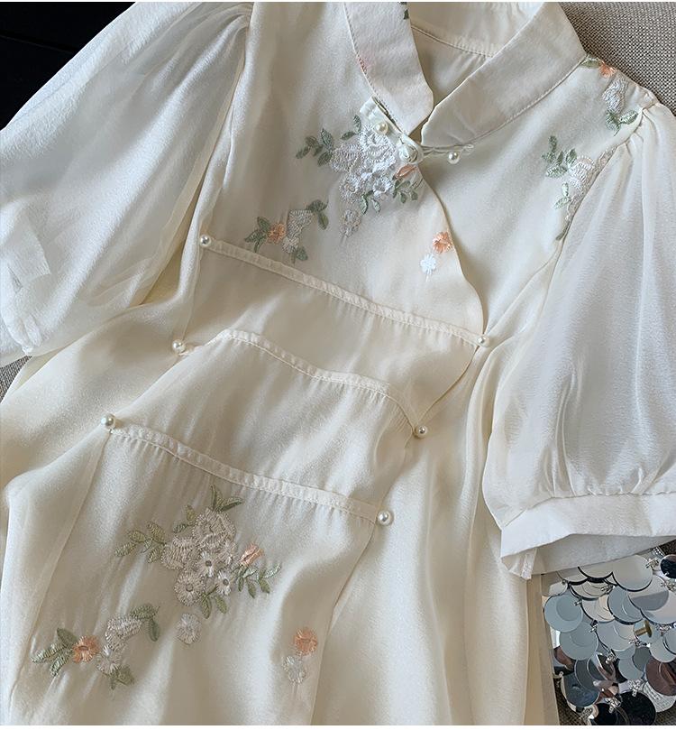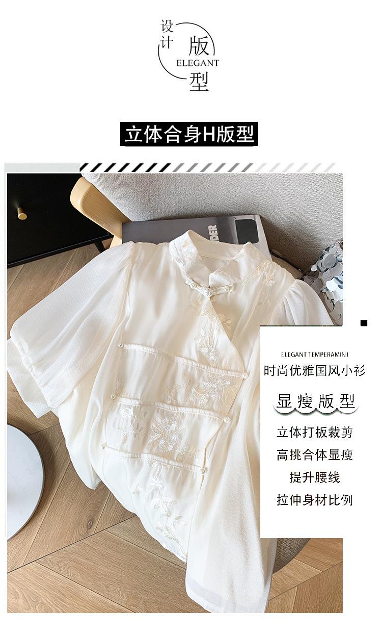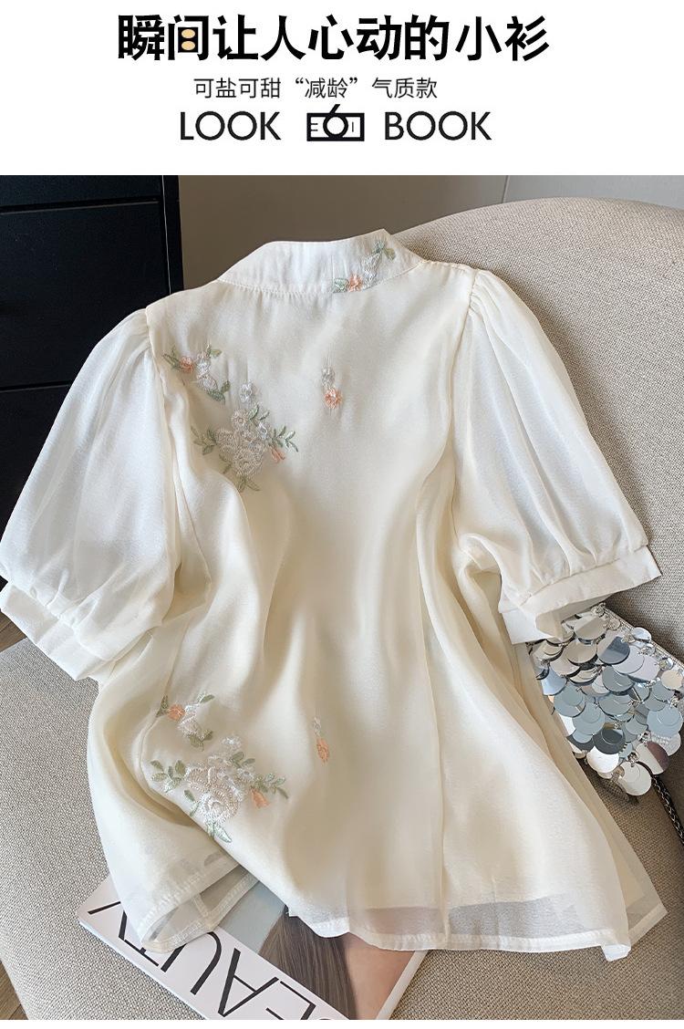 Foto real de tops nuevos de verano para mujer, estilo chino moderno, cuello alto, camisa bordada con botones, versátil, blusa de gasa que reduce la edad