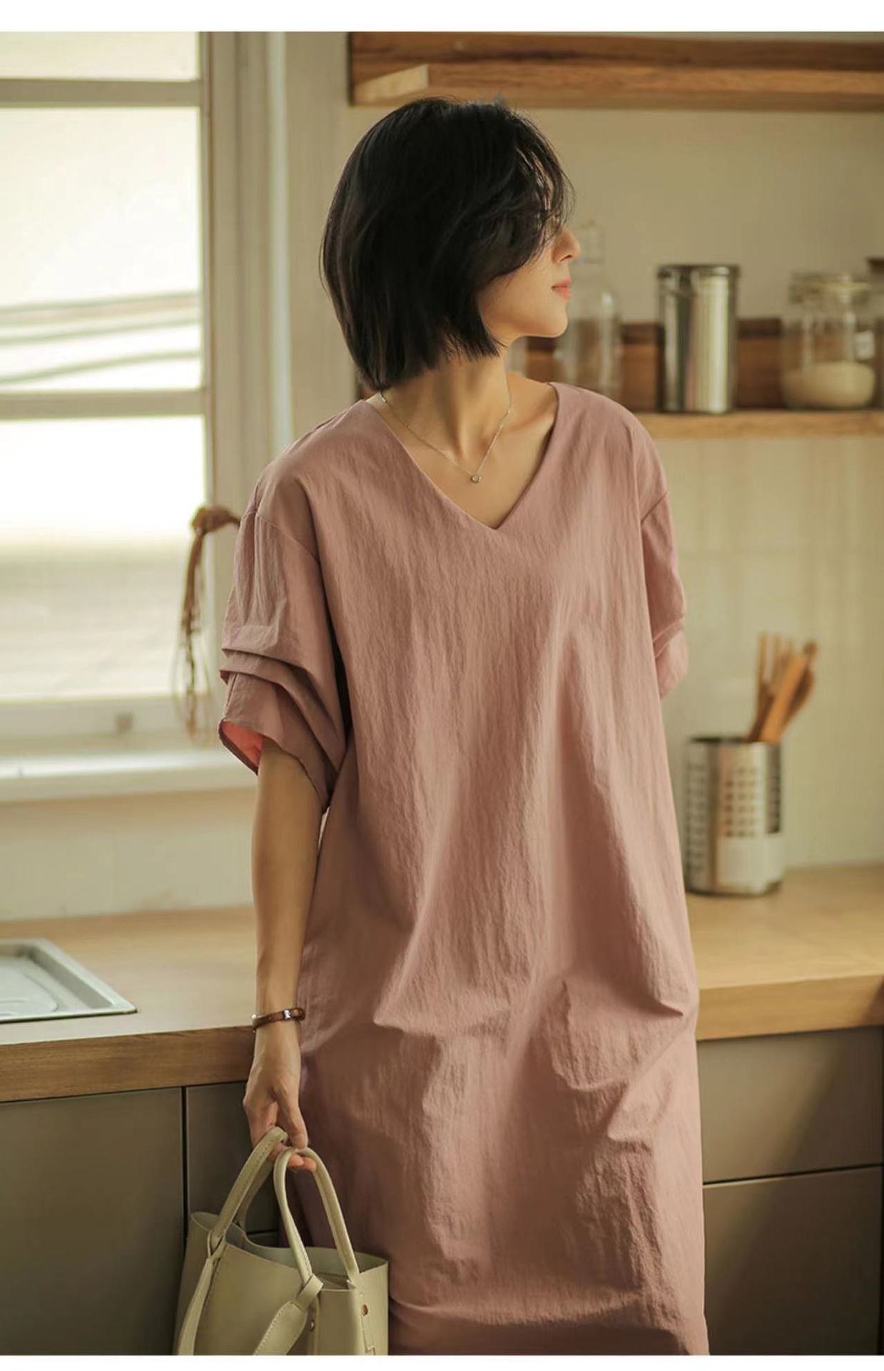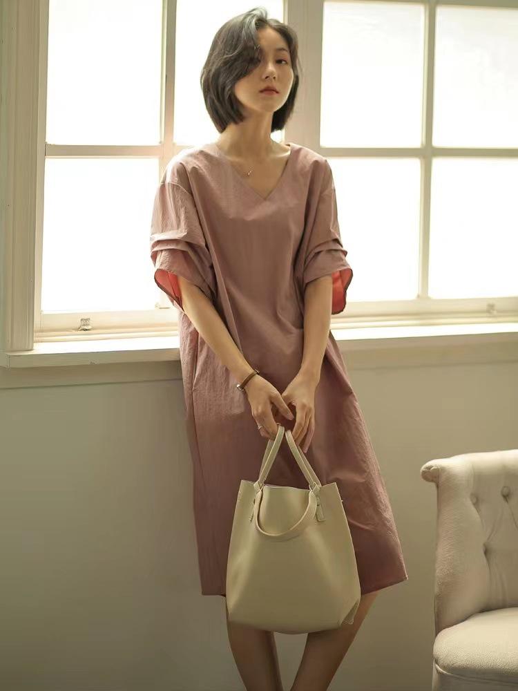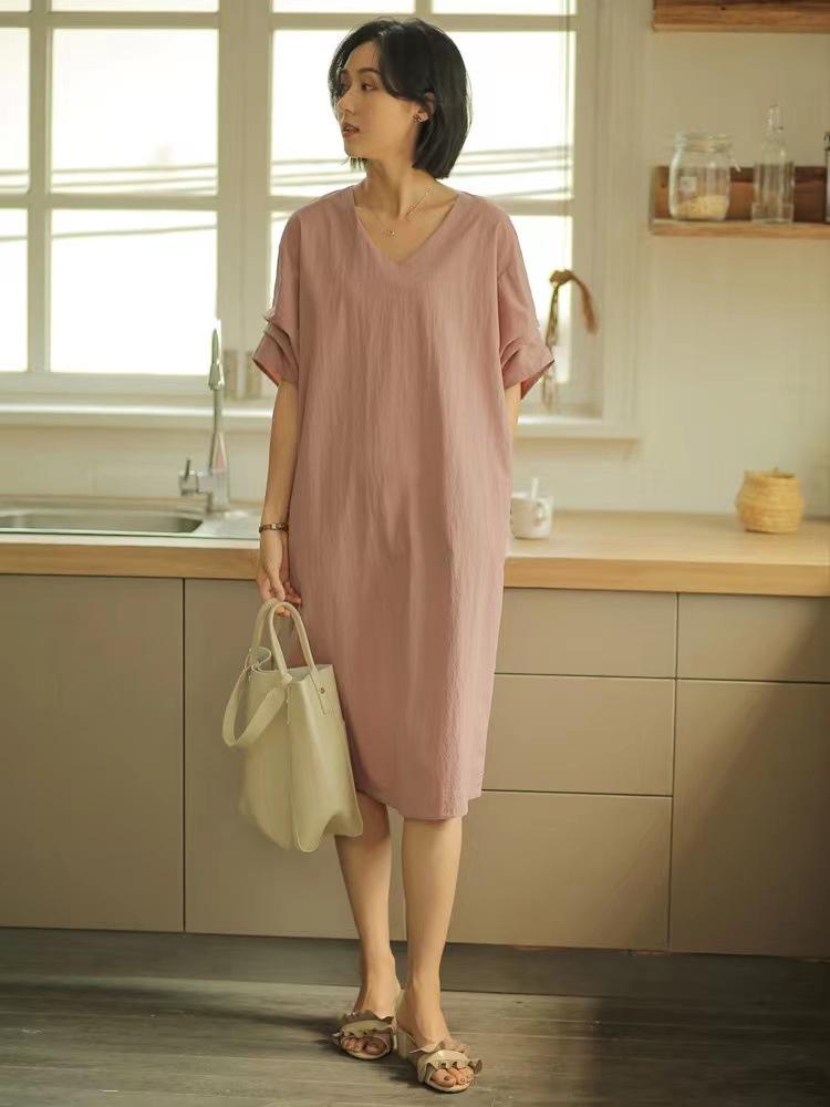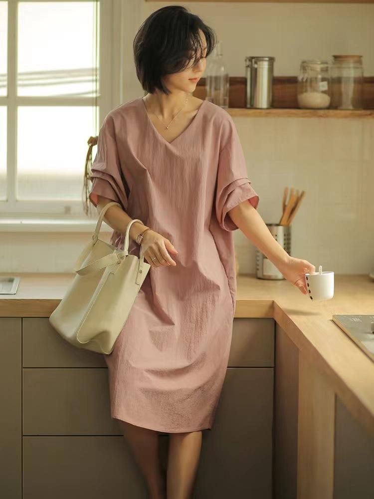 Compra Ropa de Mujer Verano 2025 Nueva Holgada Adelgazante Cuello en V Media Manga Elegante Manga Boca de Pez Vestido Recto para Mujer al por mayor en Joom.pro