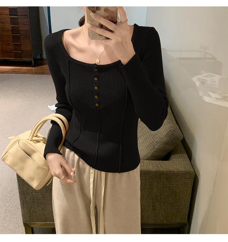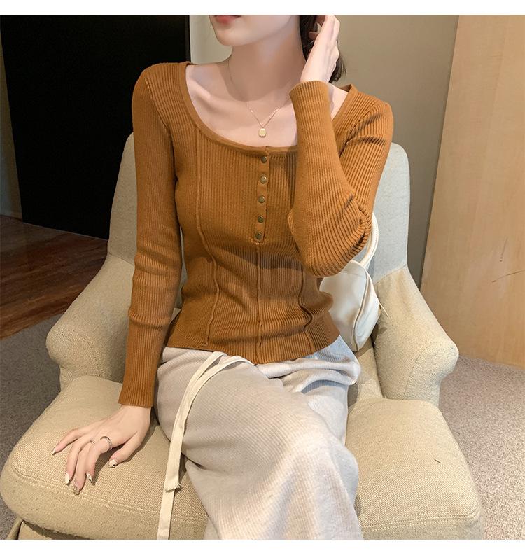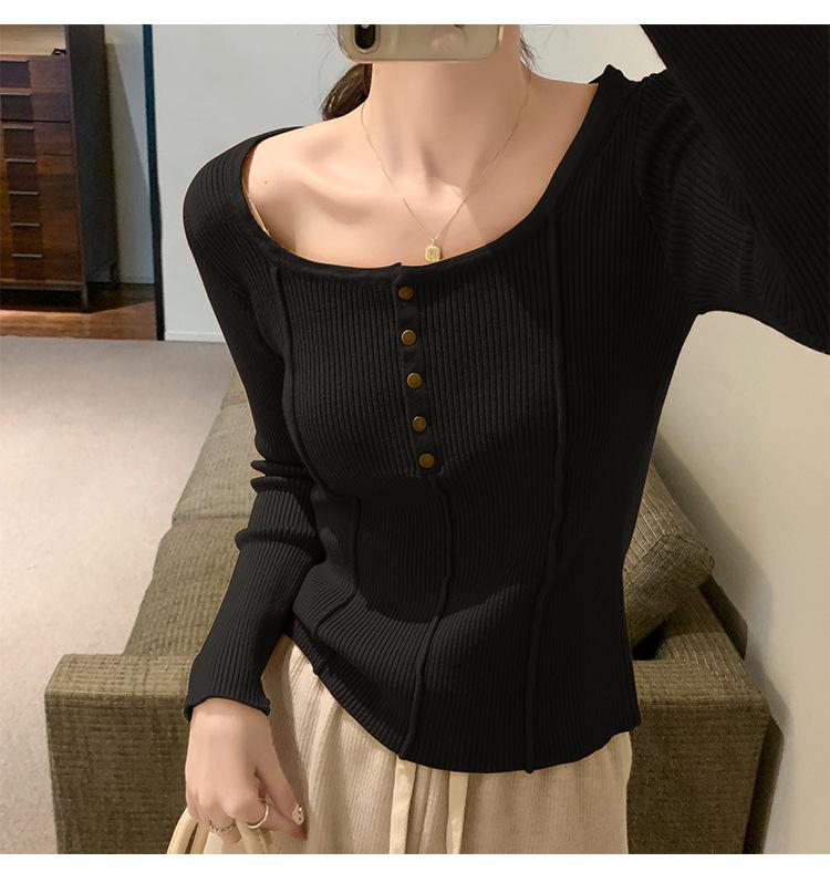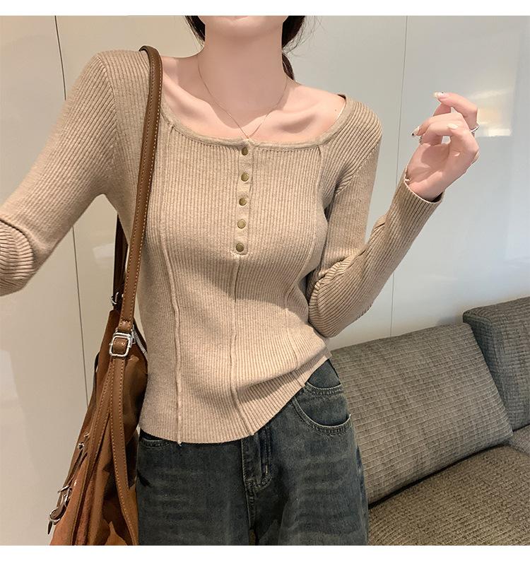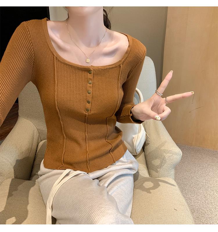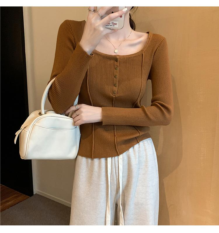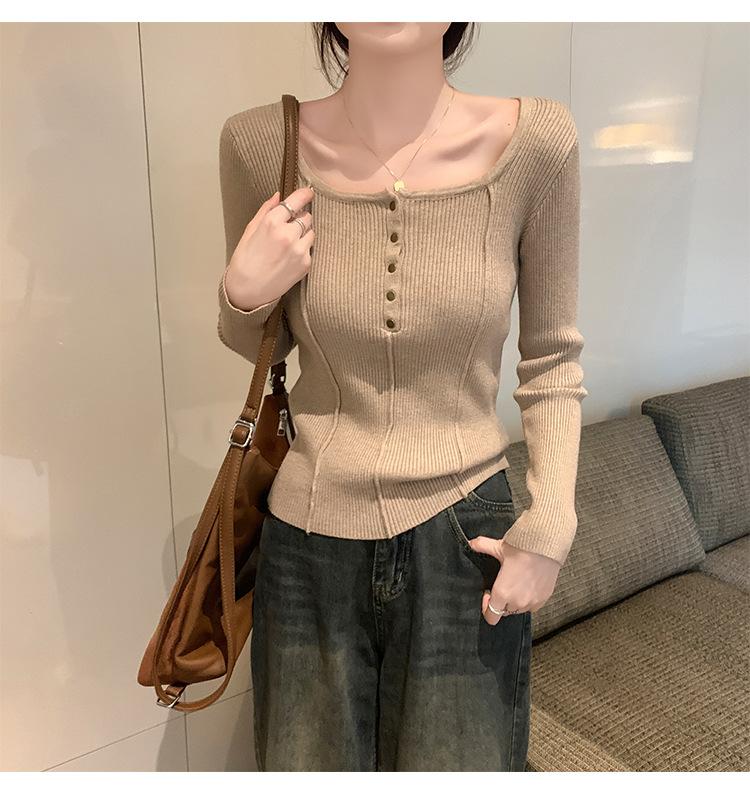 Suéter adelgazante ajustado con cuello cuadrado y manga larga, diseño de clavícula, 2023