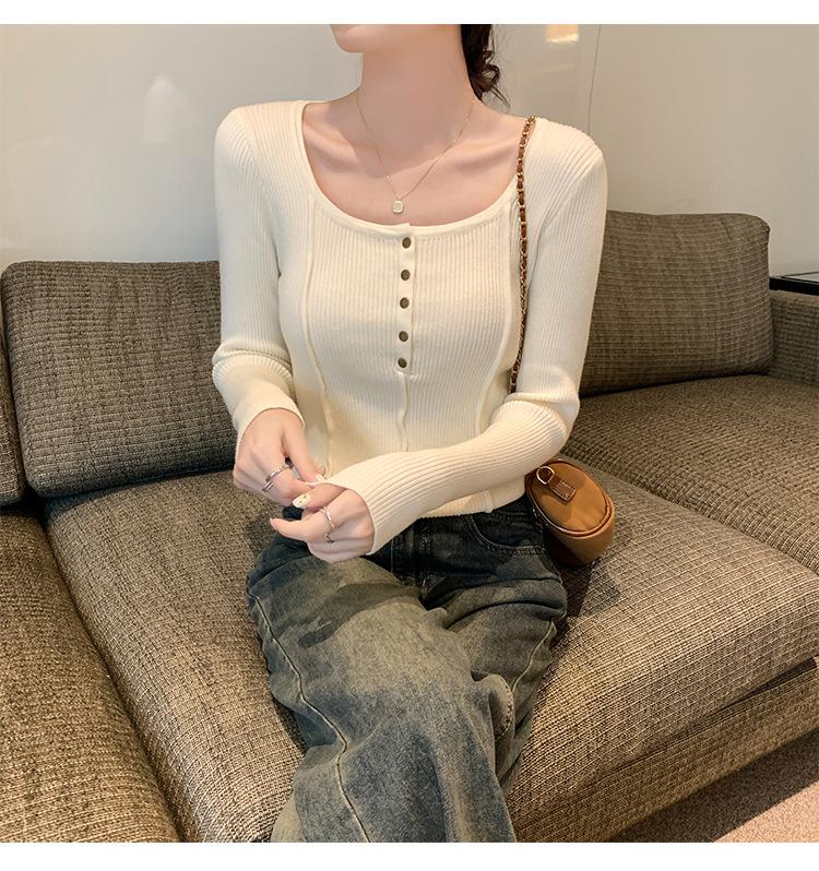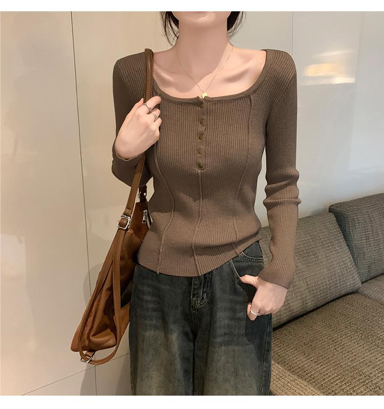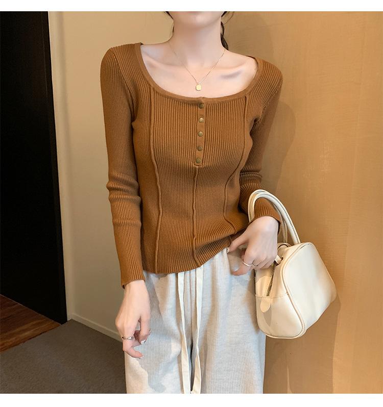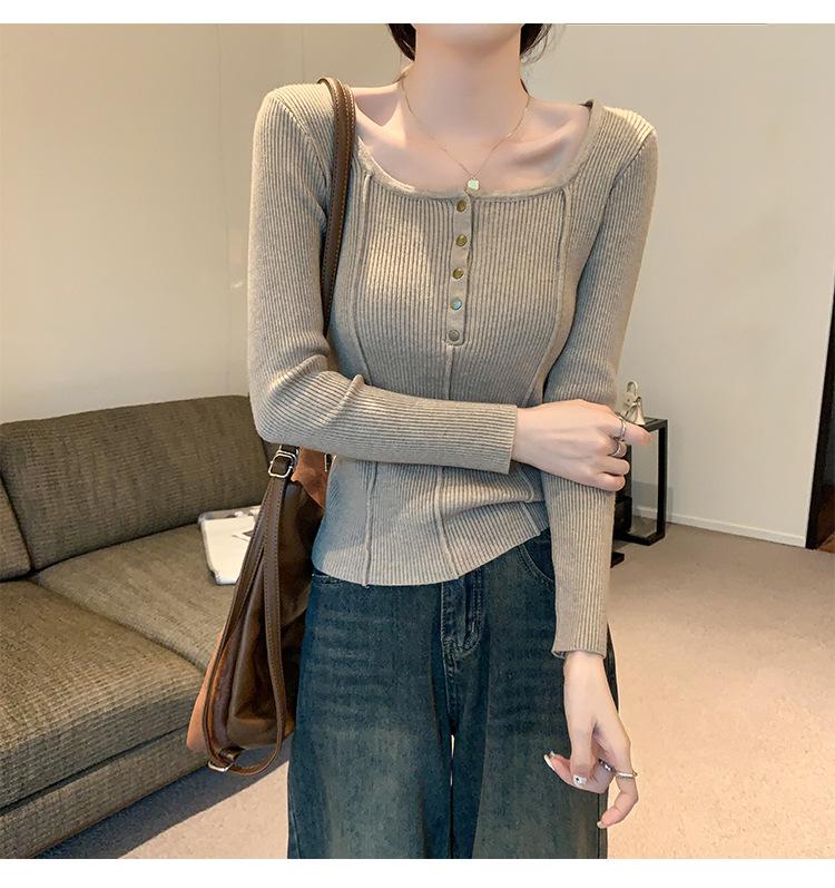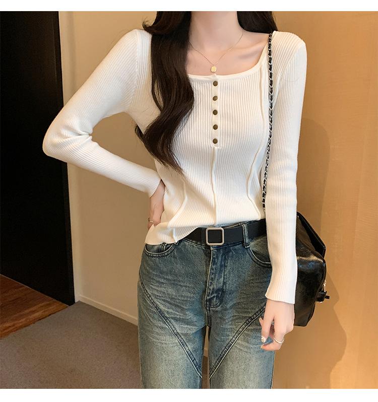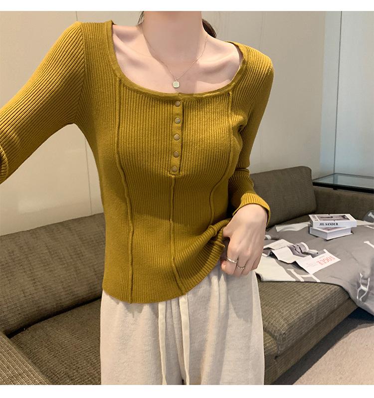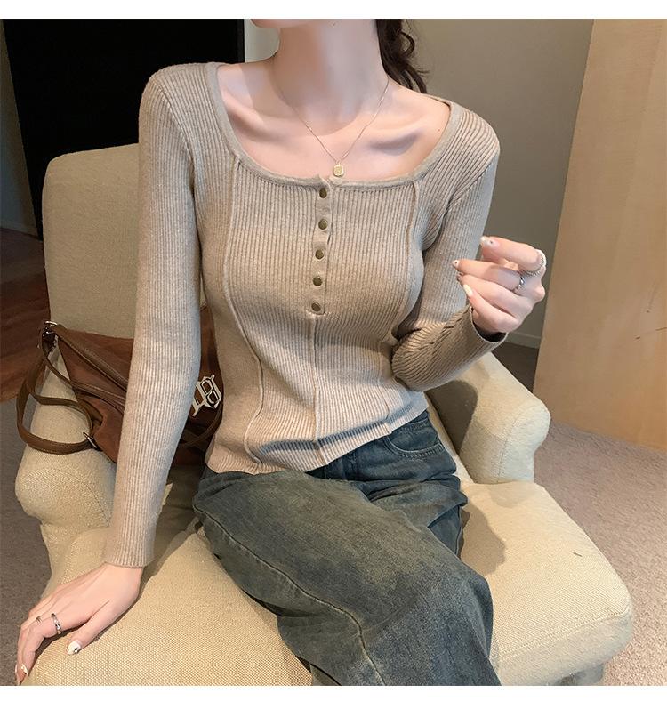 Suéter adelgazante ajustado con cuello cuadrado y manga larga, diseño de clavícula, 2023