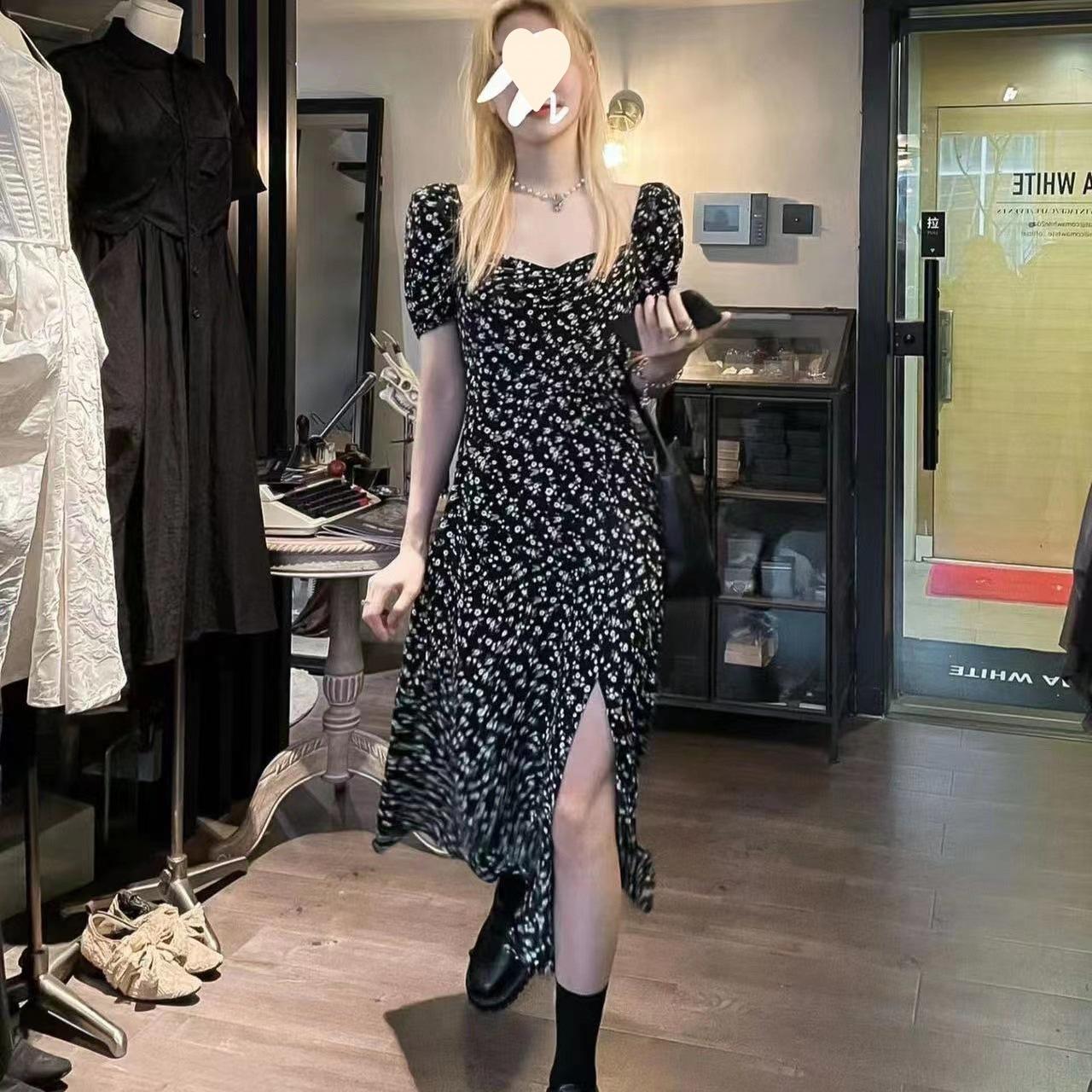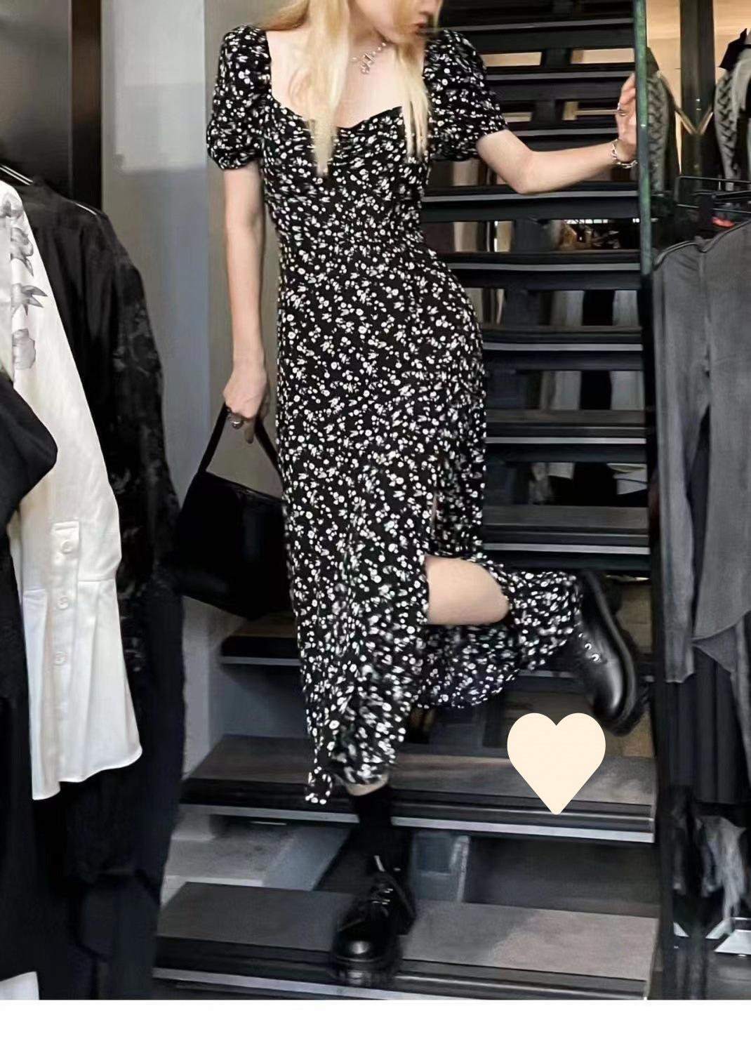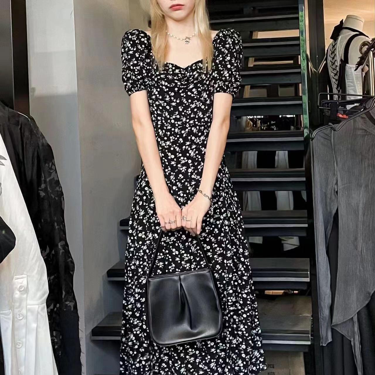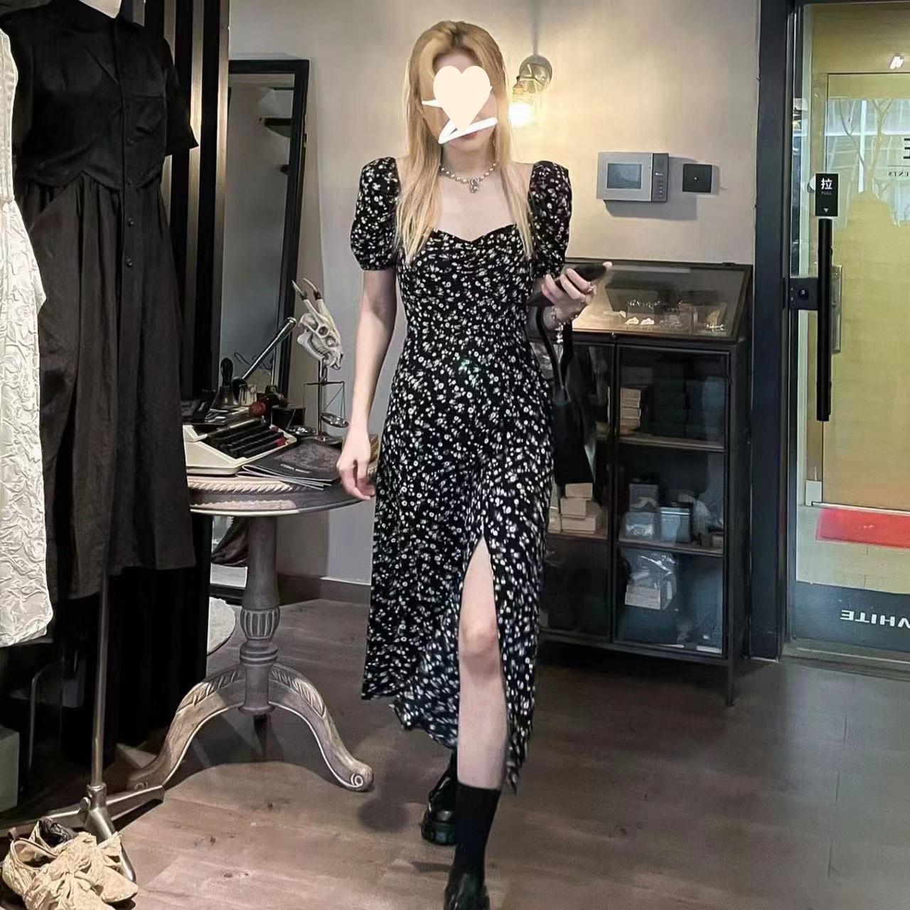 Compra Vestido Negro Floral de Verano 2025 con Cuello Cuadrado Francés y Abertura, Cintura Entallada, Sexy Vestido Largo para la Hora del Té para Mujer al por mayor en Joom.pro