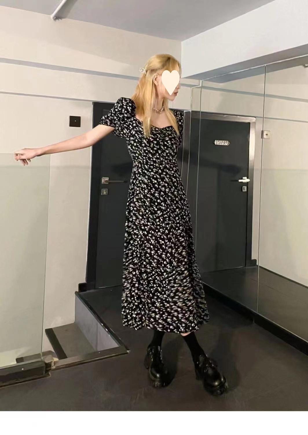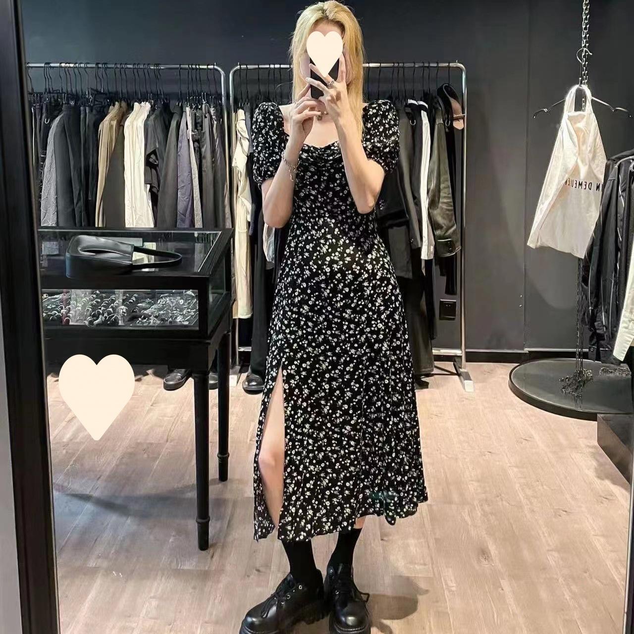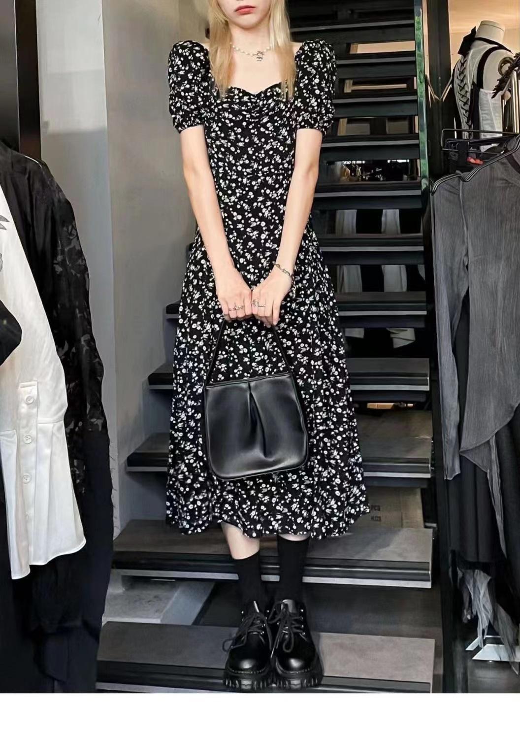 Compra Vestido Negro Floral de Verano 2025 con Cuello Cuadrado Francés y Abertura, Cintura Entallada, Sexy Vestido Largo para la Hora del Té para Mujer al por mayor en Joom.pro