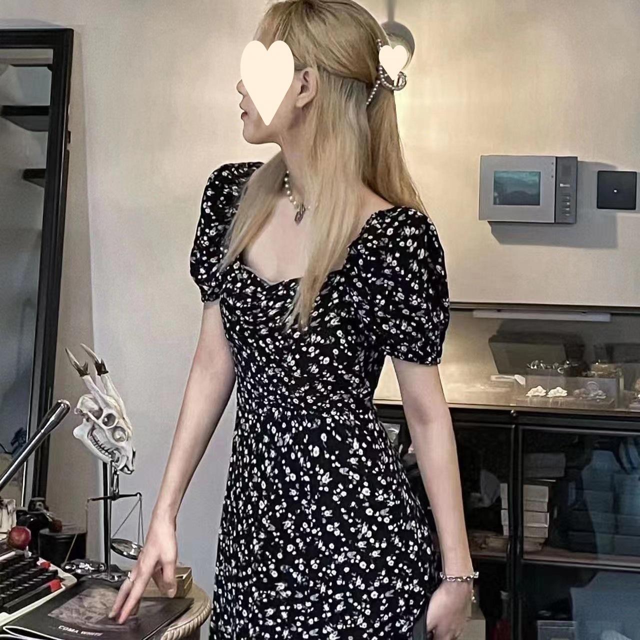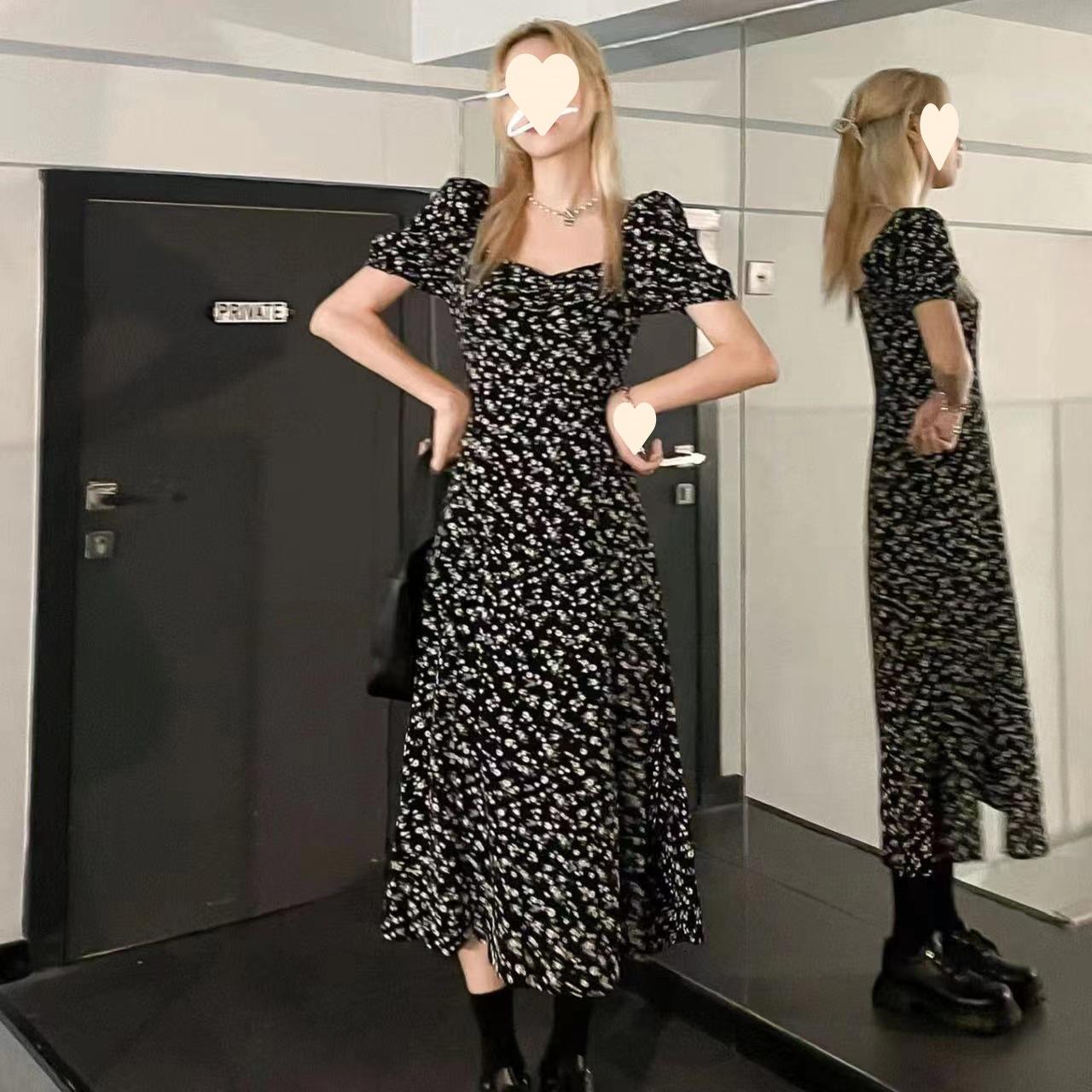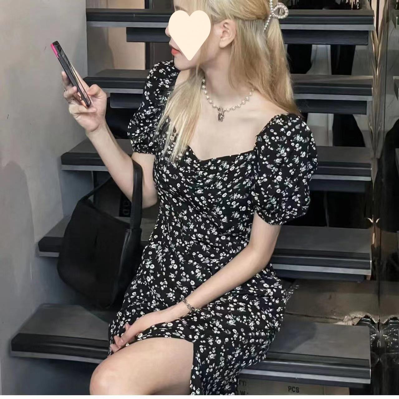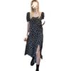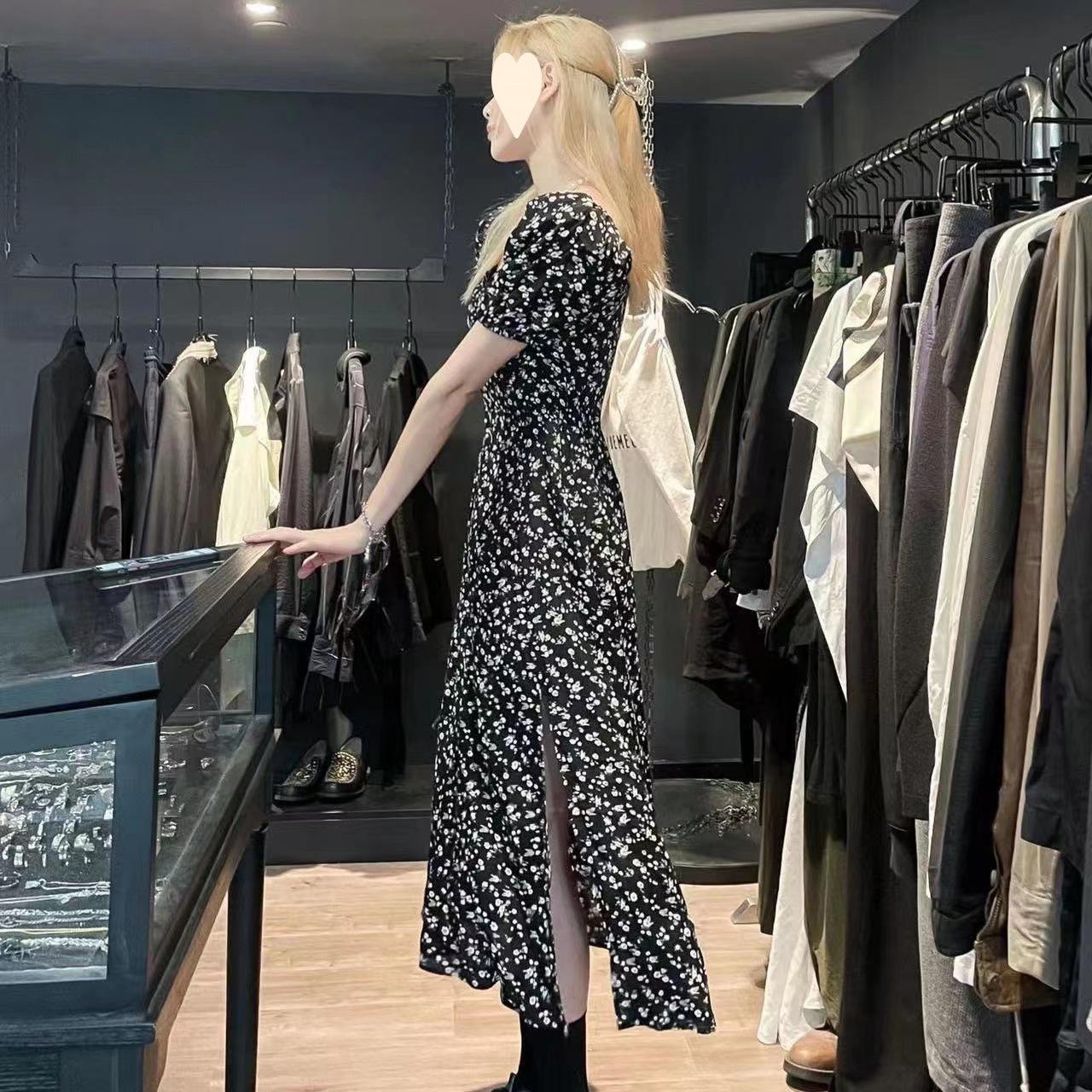 Compra Vestido Negro Floral de Verano 2025 con Cuello Cuadrado Francés y Abertura, Cintura Entallada, Sexy Vestido Largo para la Hora del Té para Mujer al por mayor en Joom.pro