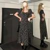 Vestido Negro Floral de Verano 2025 con Cuello Cuadrado Francés y Abertura, Cintura Entallada, Sexy Vestido Largo para la Hora del Té para Mujer
