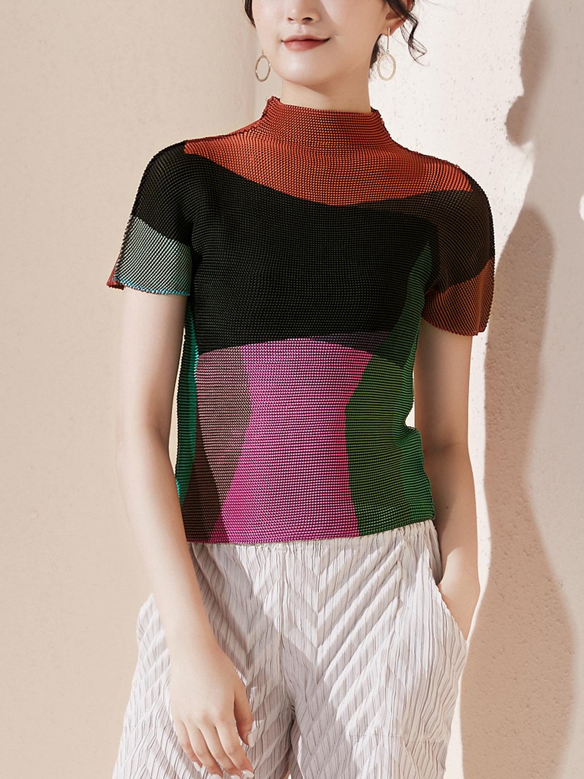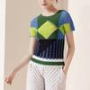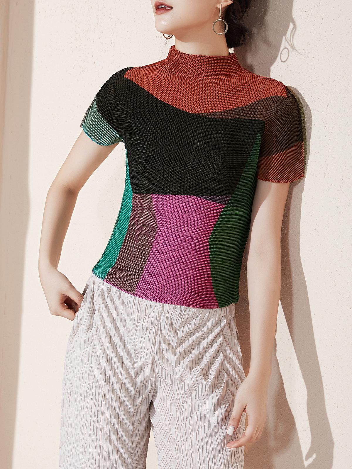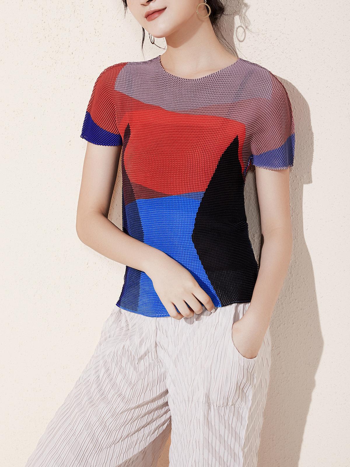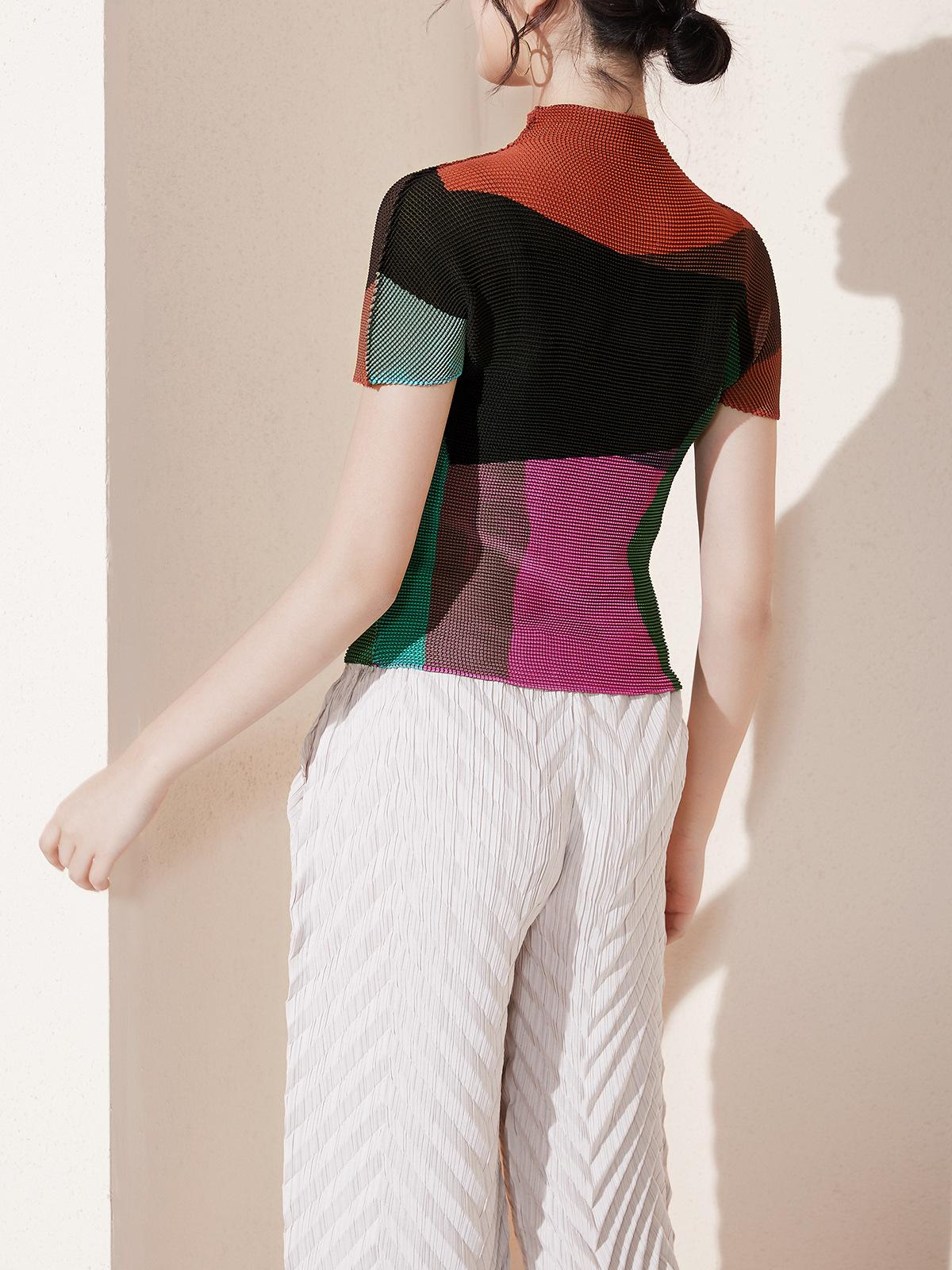 Camiseta de manga corta Miyake de alta gama para mujer, diseño de verano para mujer, estilo nicho, con contraste de colores, a la moda, combinable, tipo jersey, top tipo camisa.