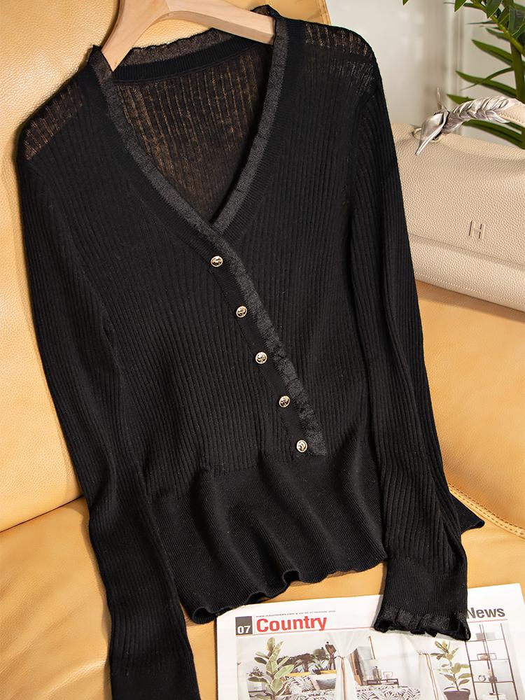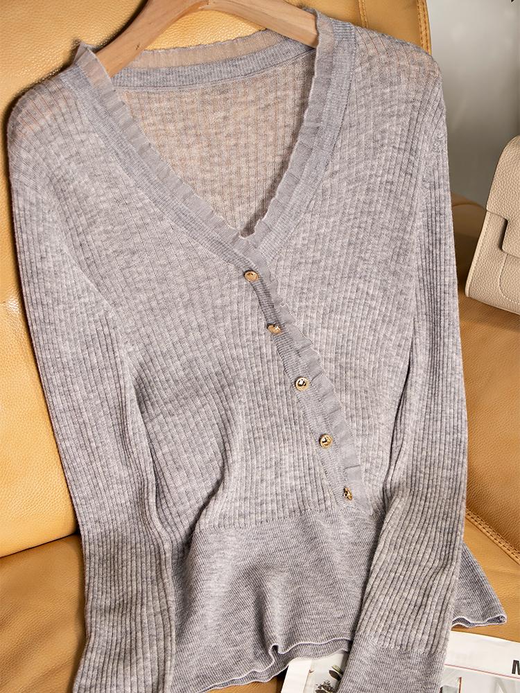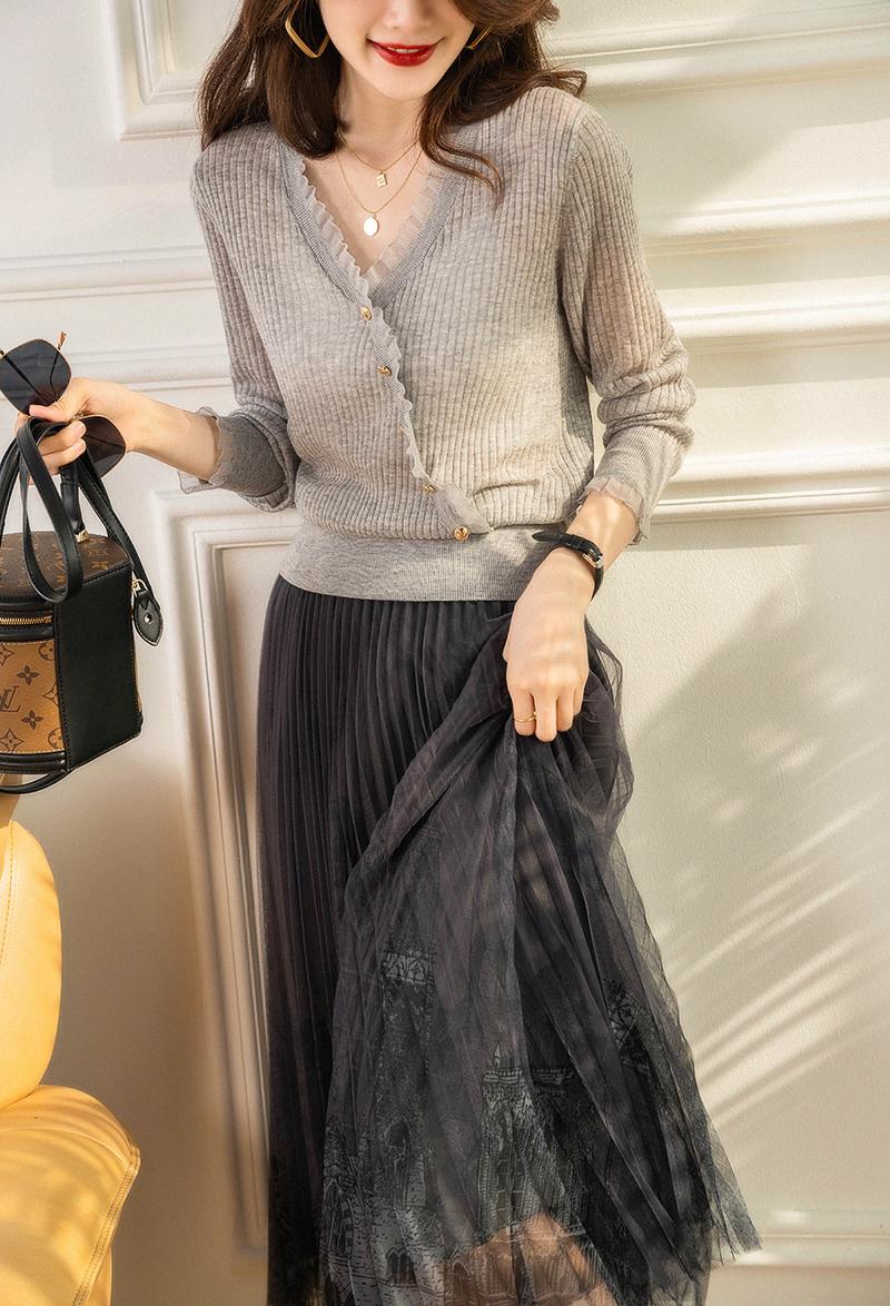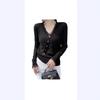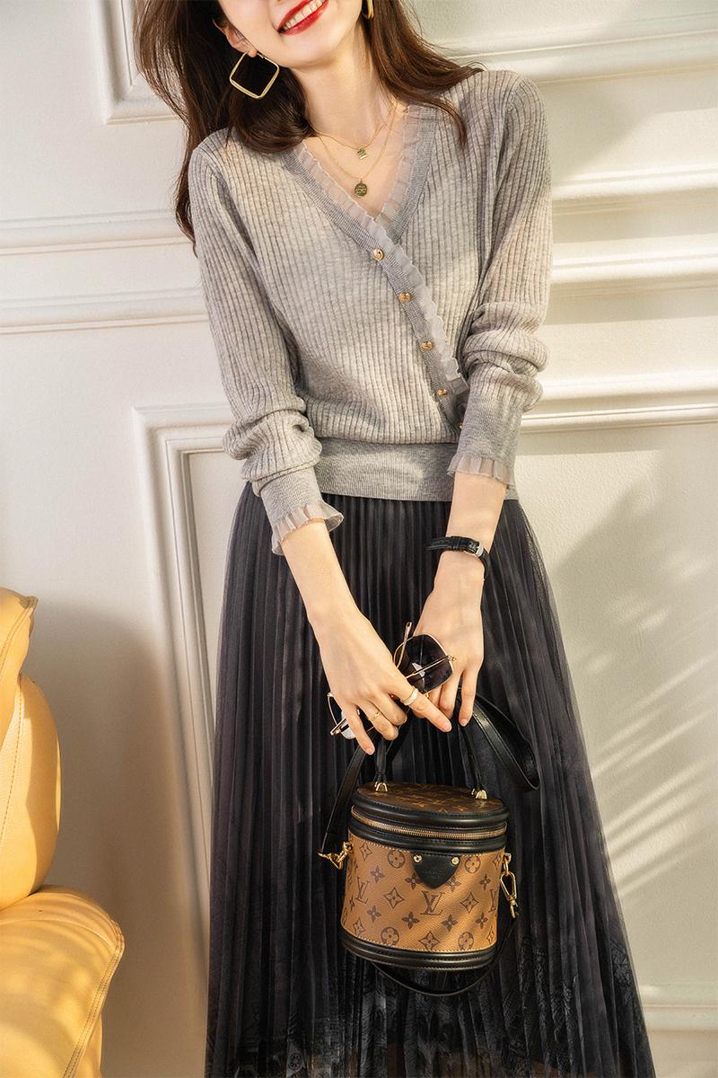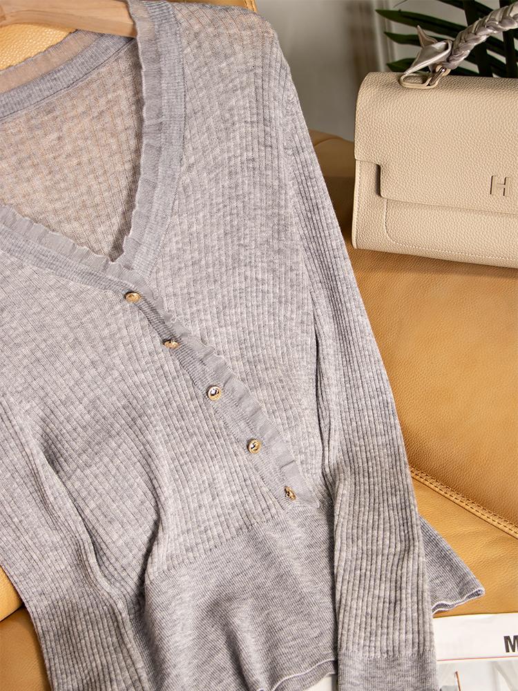 Top de punto de manga larga con escote en V, romántico, llamativo y suave, con borde en las orejas, para mujer, principios de otoño, nuevo, con costuras de organza.