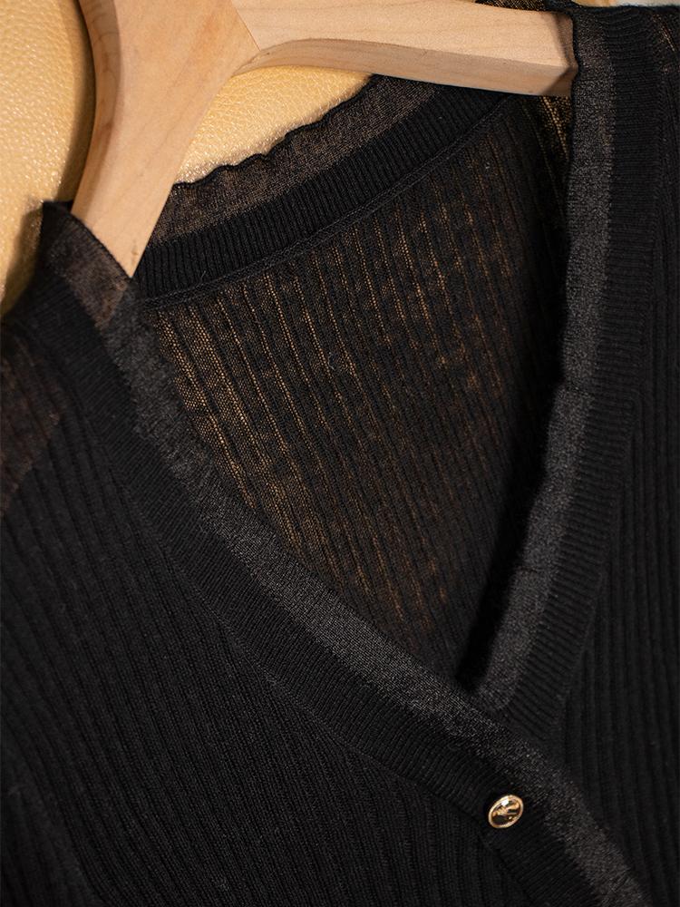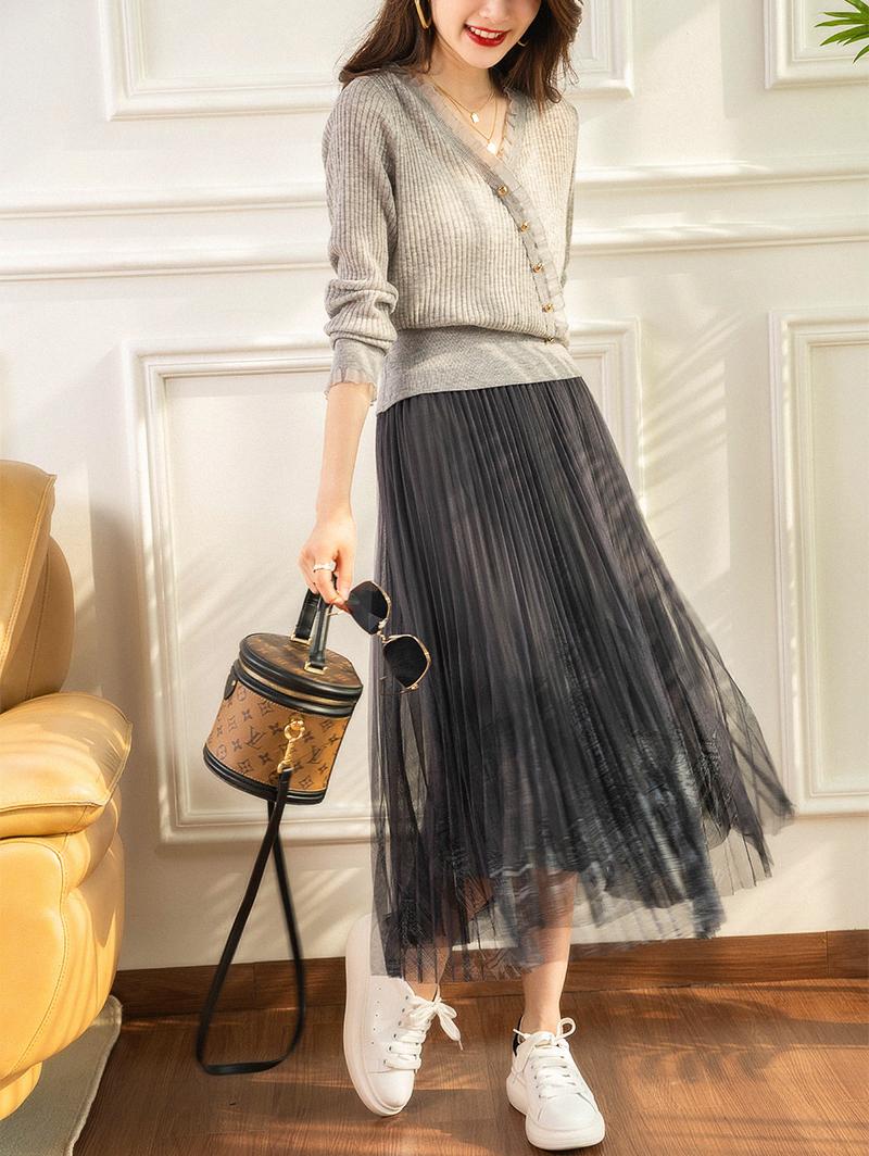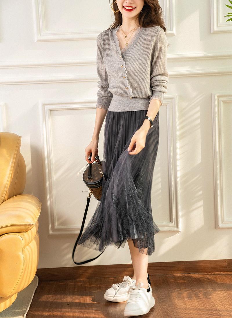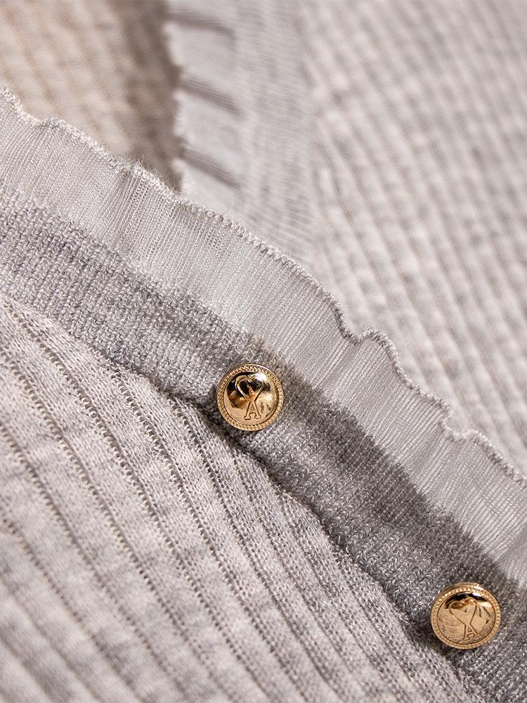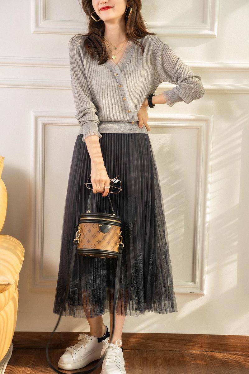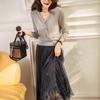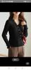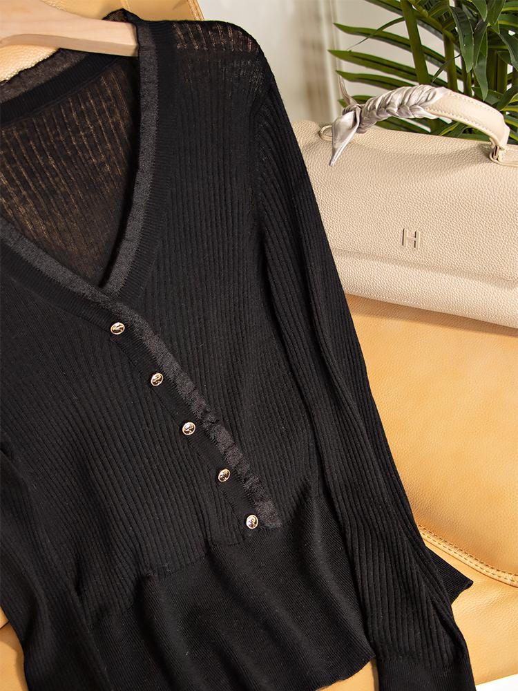 Top de punto de manga larga con escote en V, romántico, llamativo y suave, con borde en las orejas, para mujer, principios de otoño, nuevo, con costuras de organza.