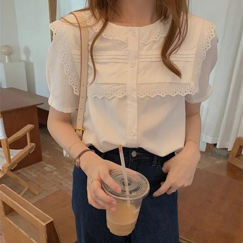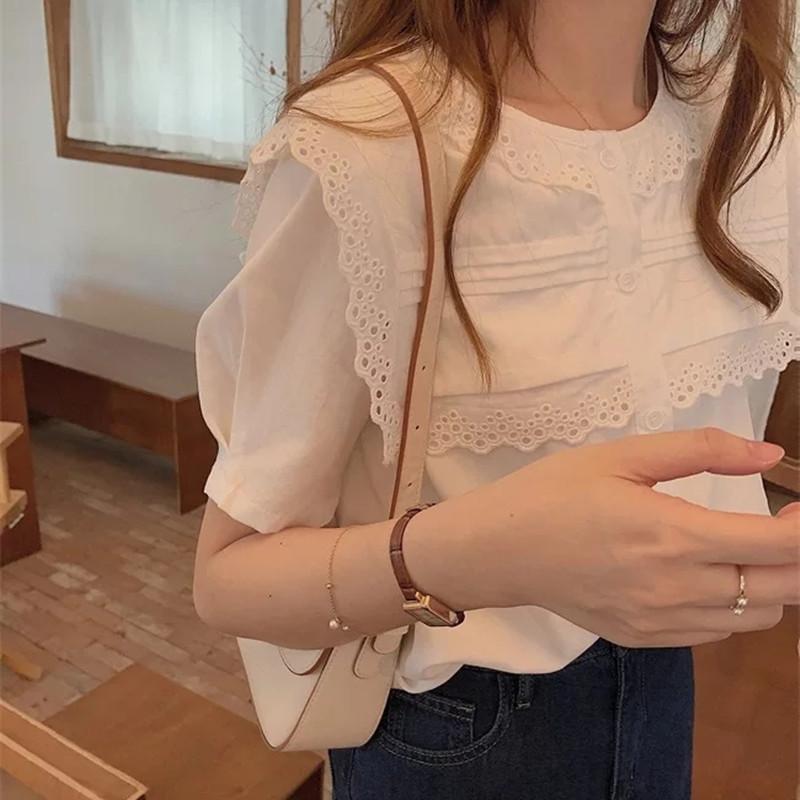 2023 Primavera y Verano Nuevo Camisa de Cuello de Encaje para Mujer Manga Corta Temperamento Diseño Suave Top Fondo Camisa Blanca