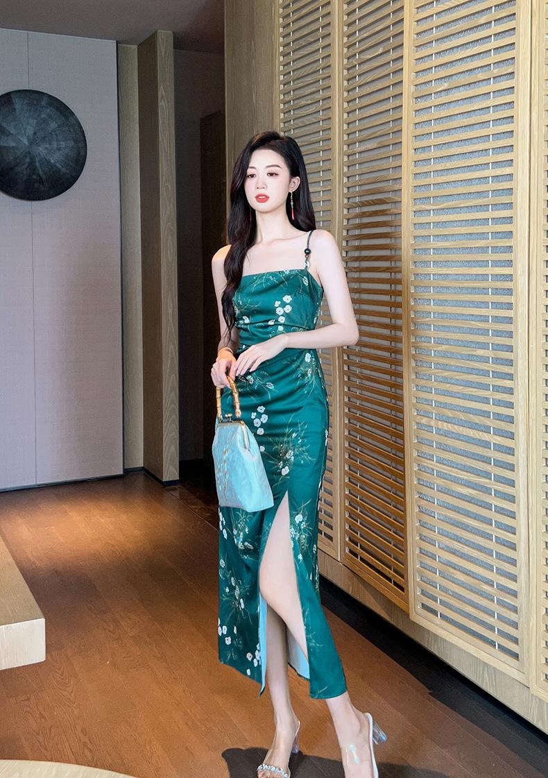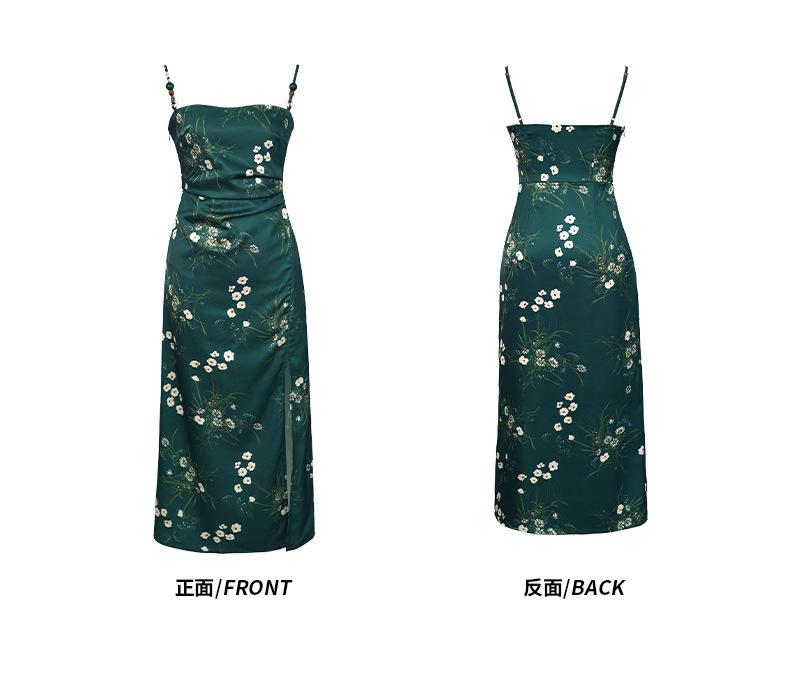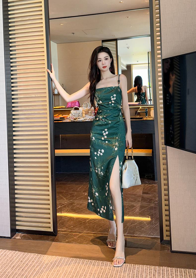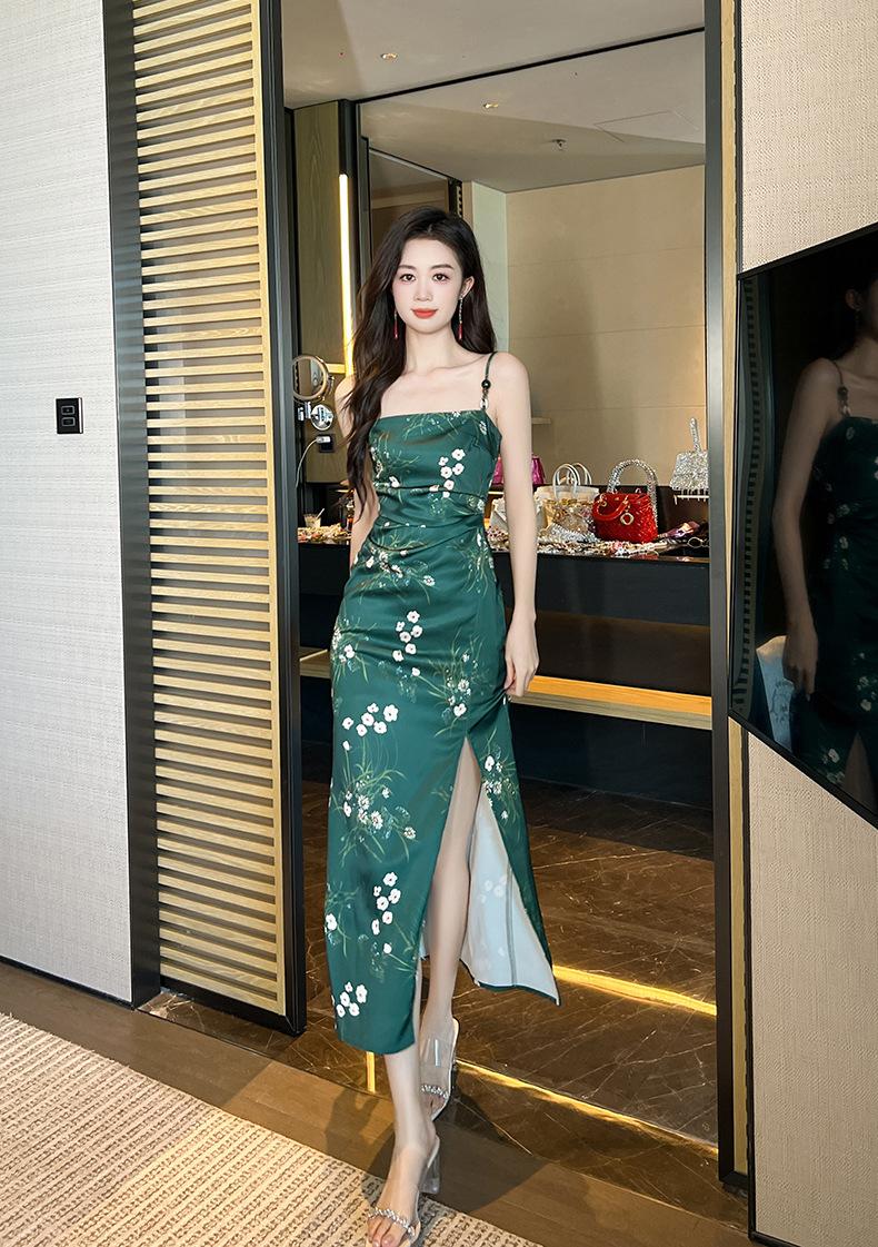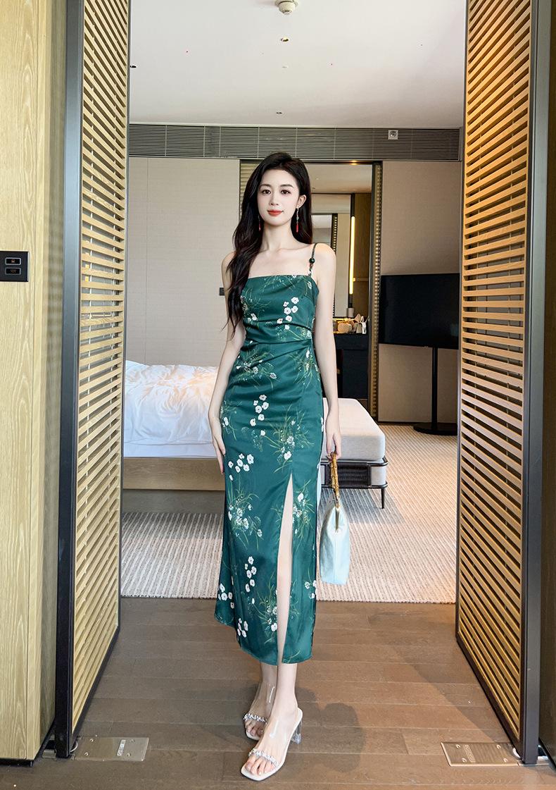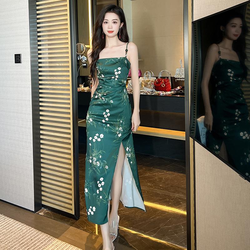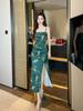 2025 Nuevo Verano para Mujer Francés Retro Estampado Verde Ajustado Blanco Sexy Vestido de Tirantes 9621