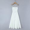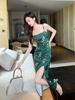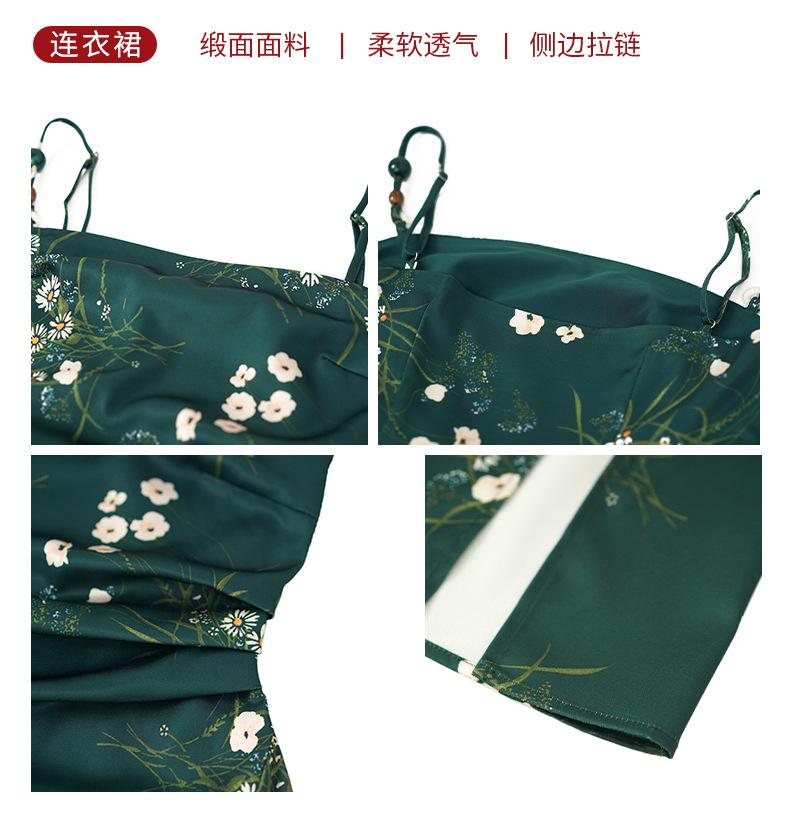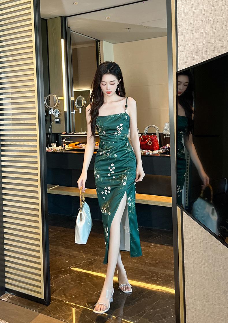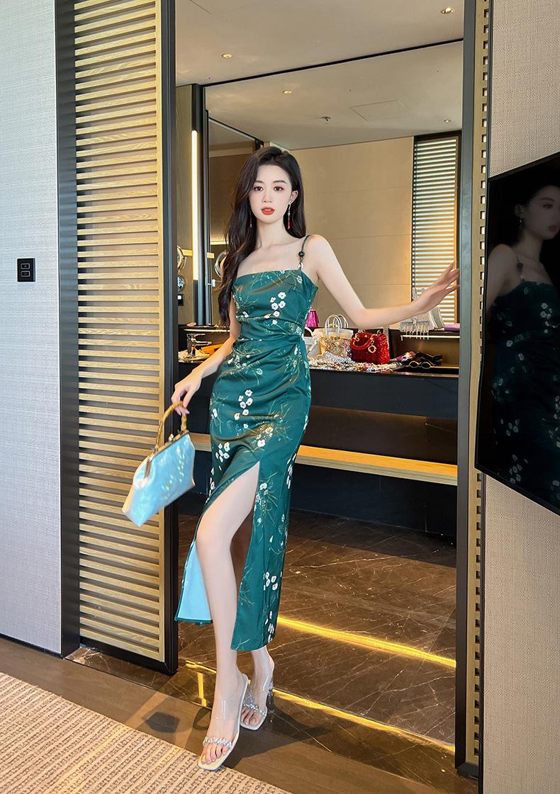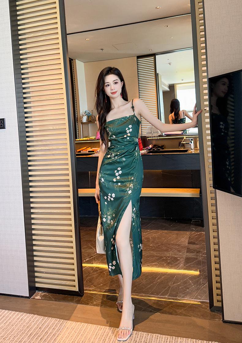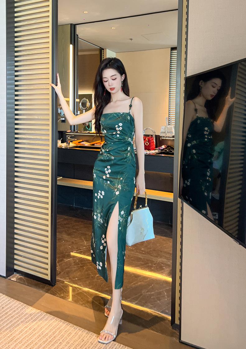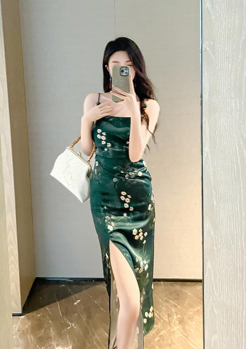 2025 Nuevo Verano para Mujer Francés Retro Estampado Verde Ajustado Blanco Sexy Vestido de Tirantes 9621