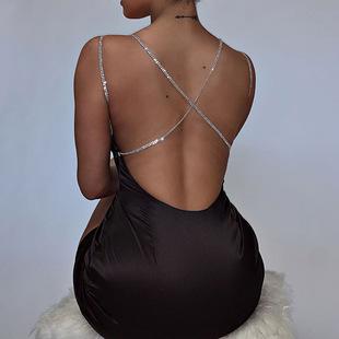 Ropa de mujer europea y americana transfronteriza nuevos productos falda de cadera con cadena de diamantes sin espalda vestido negro elástico sexy de club nocturno
