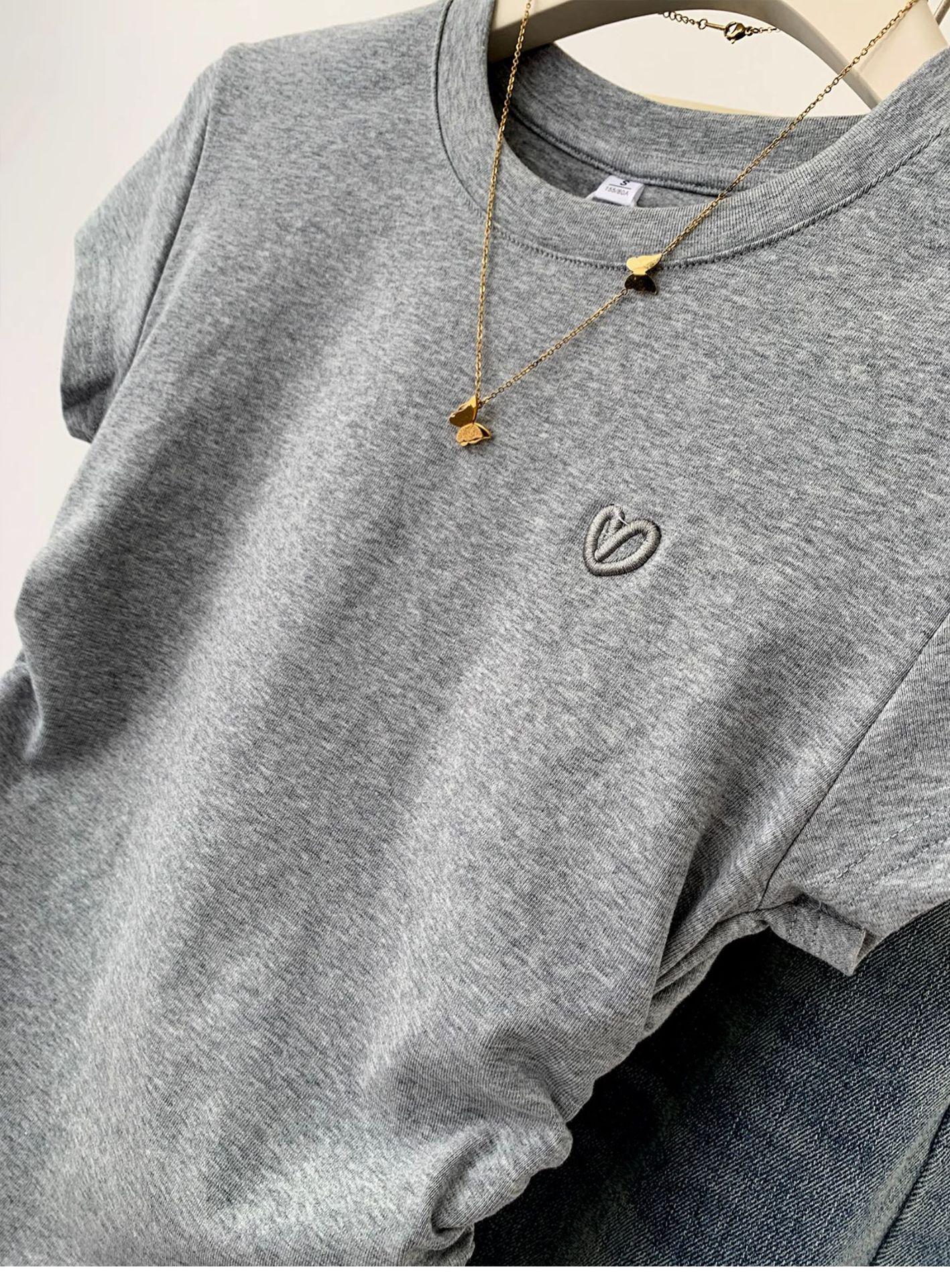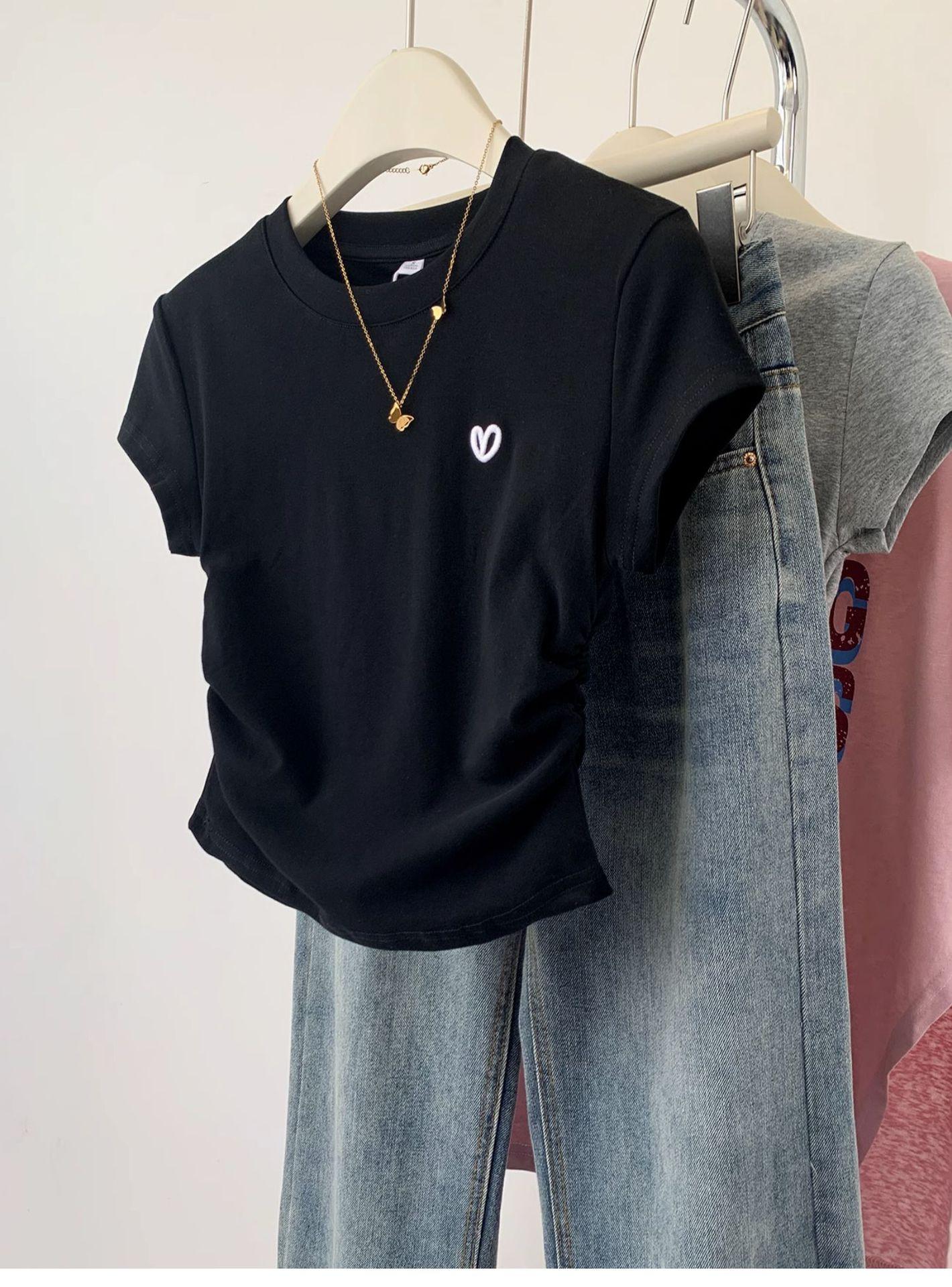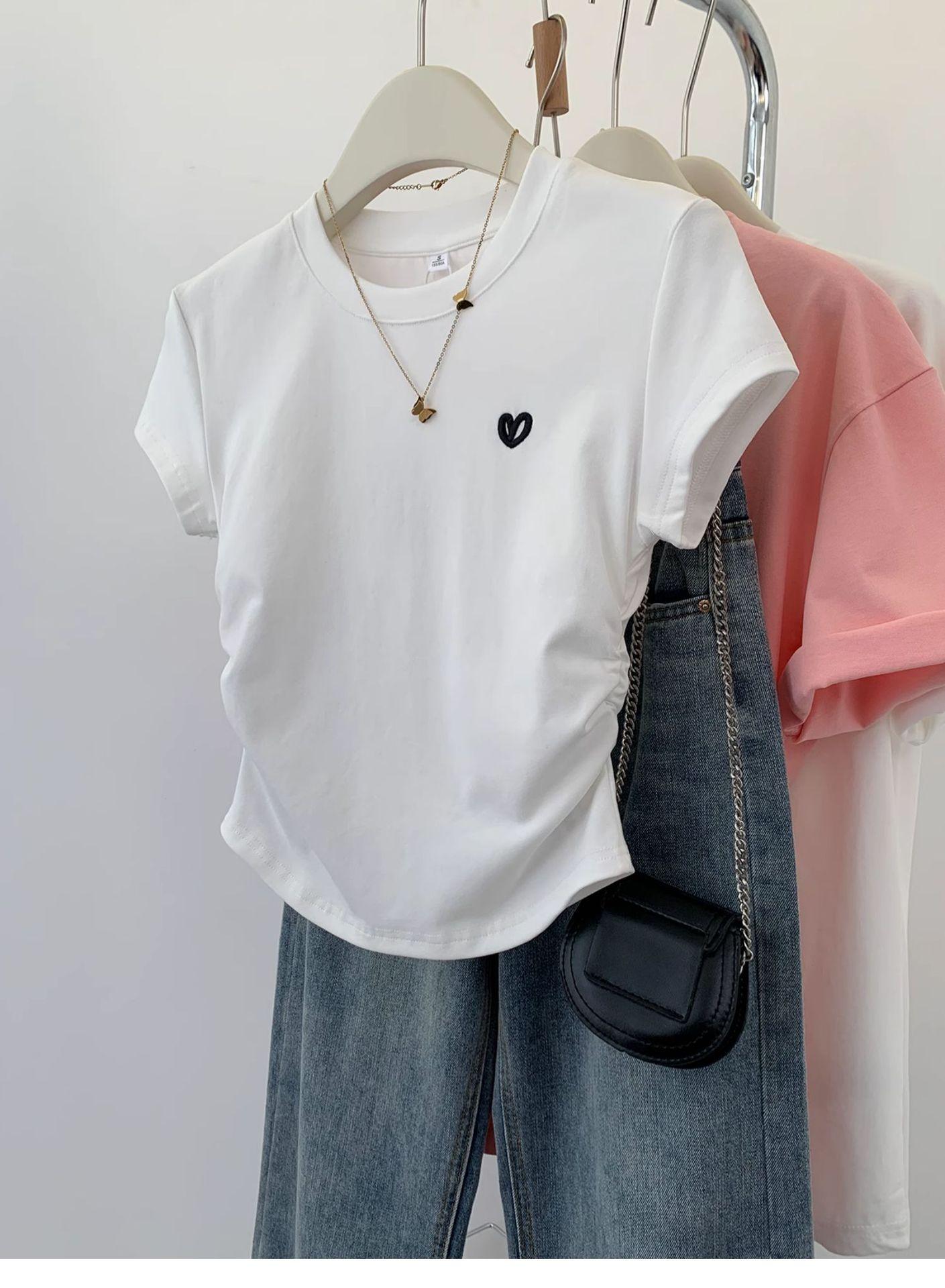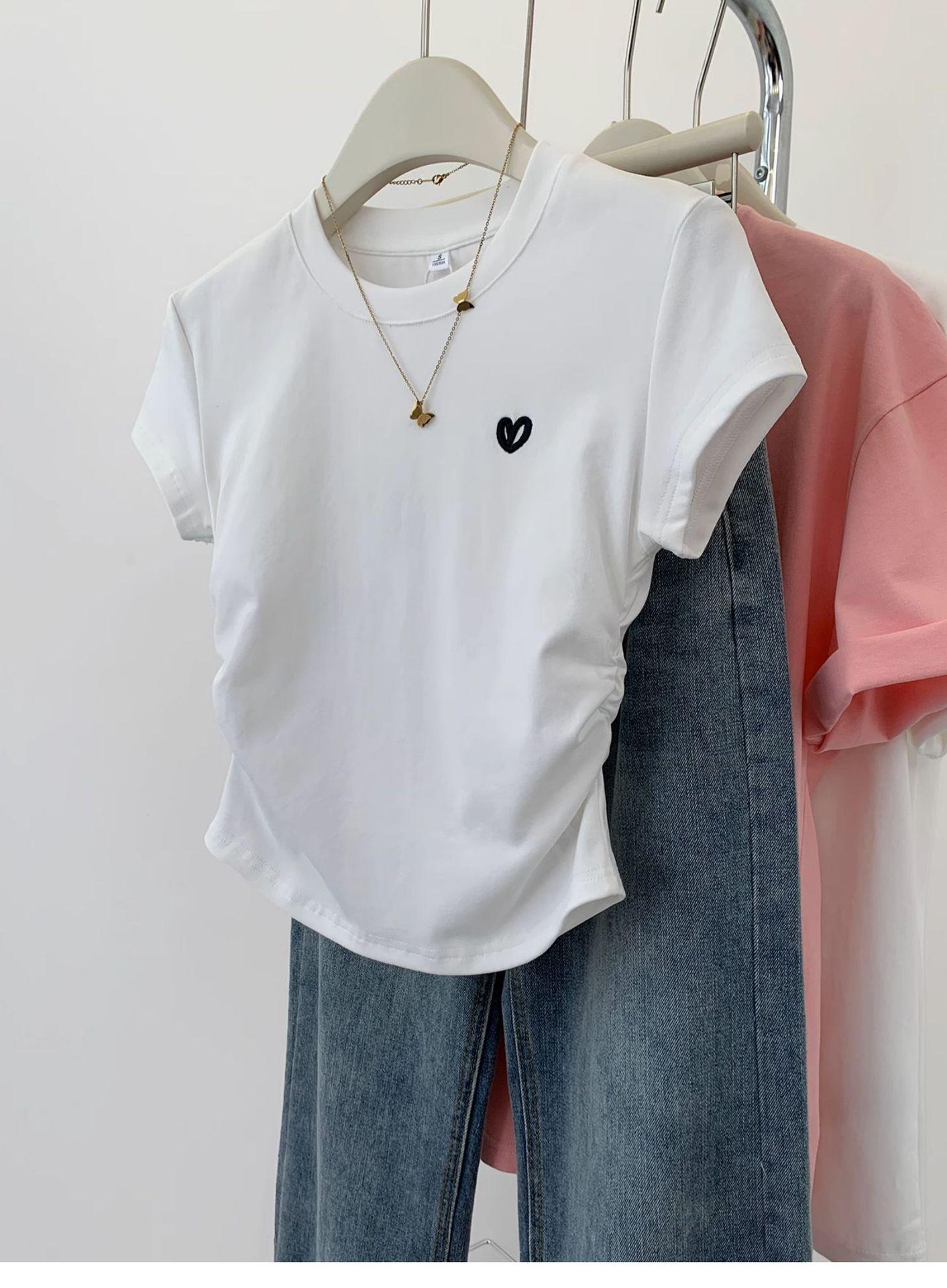 Camiseta Corta Slim de Manga Corta con Corazón Bordado para Mujer Verano Nuevo Diseño Camiseta Hombro Derecho Slim Top Americano