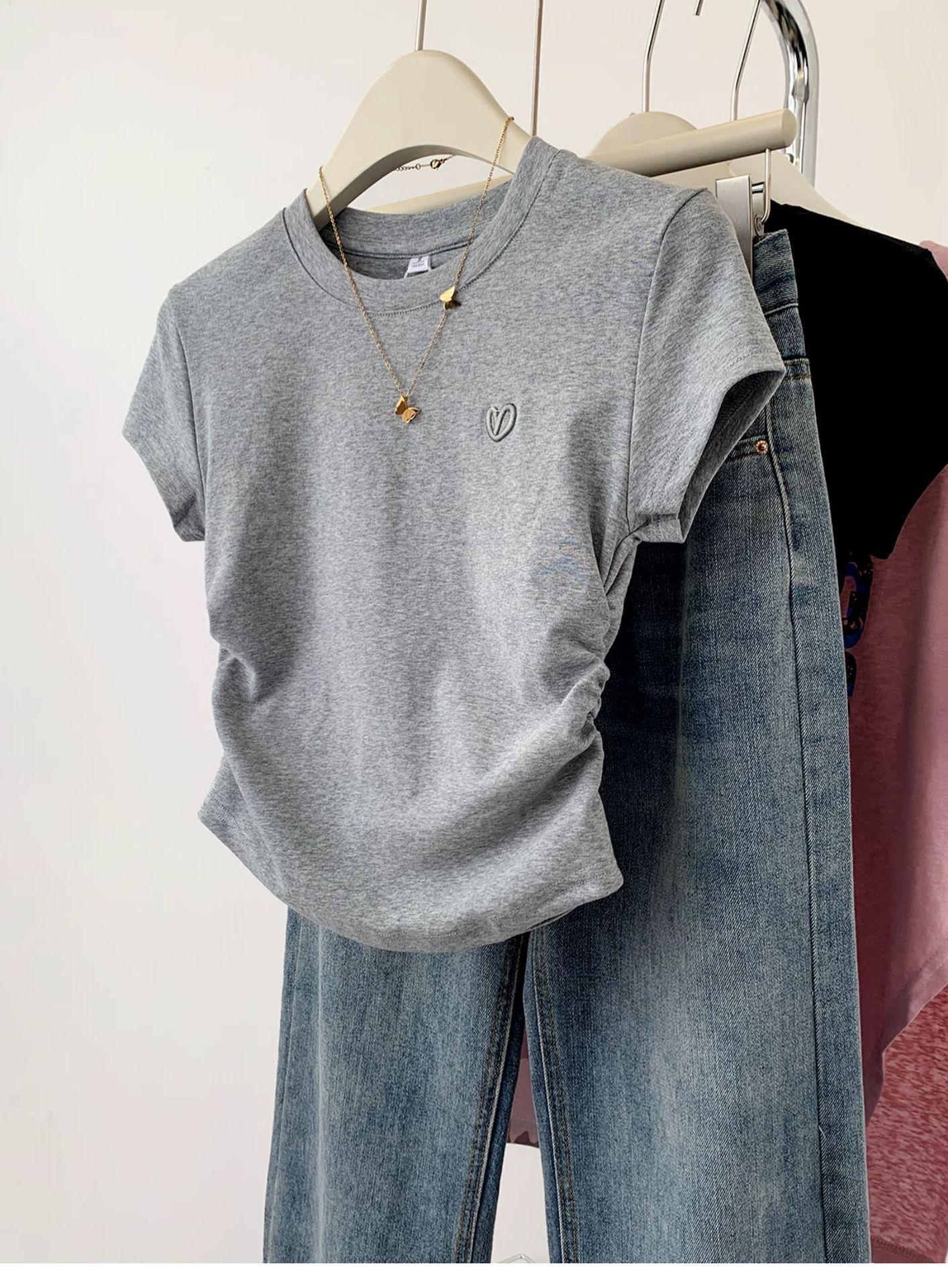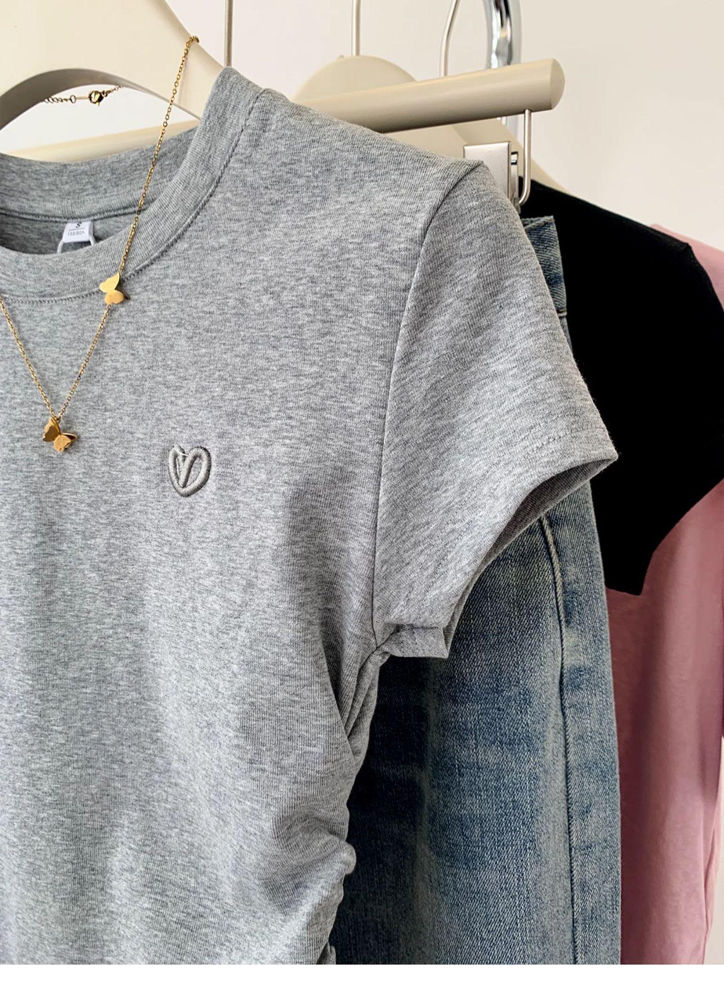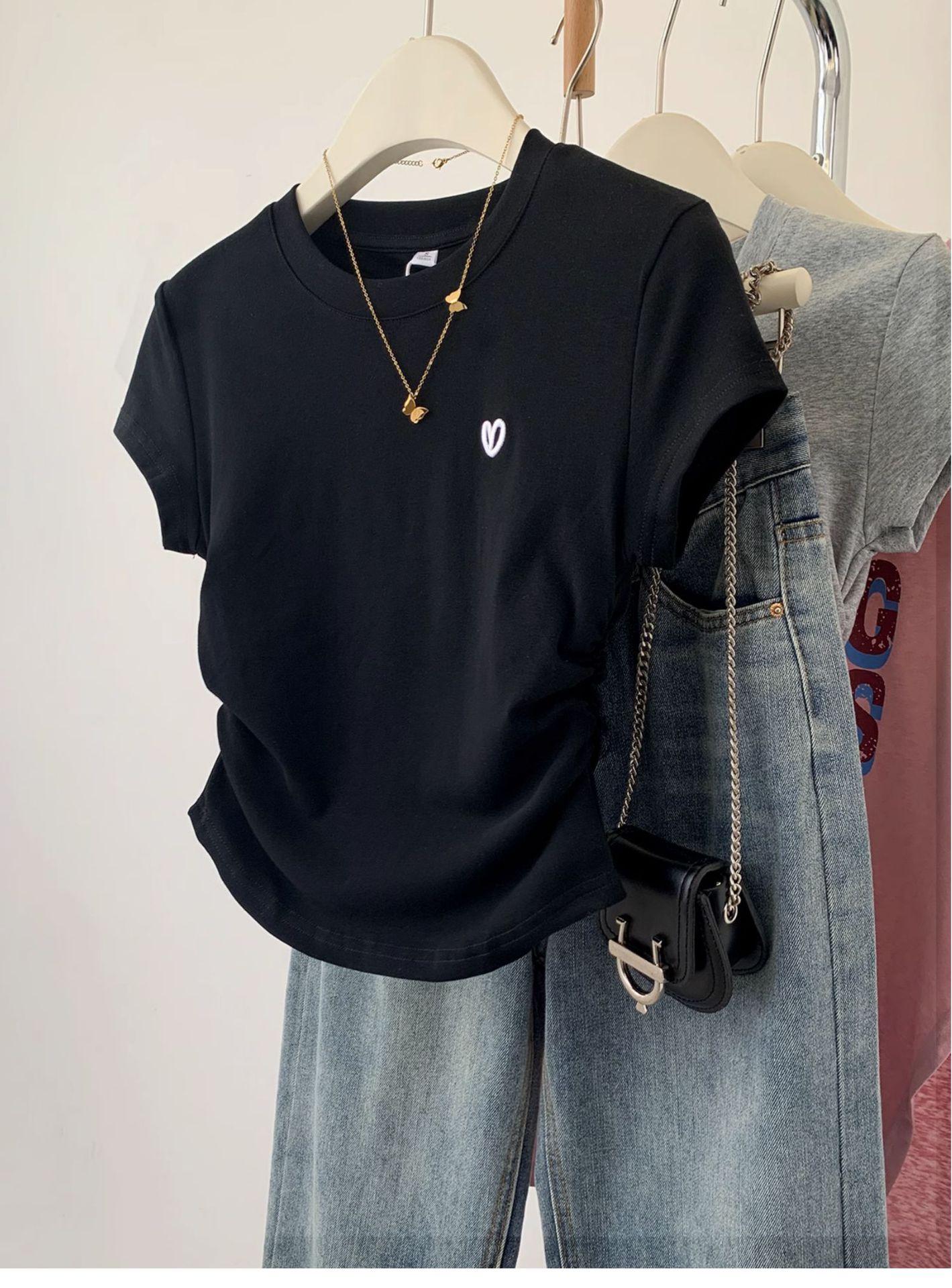 Camiseta Corta Slim de Manga Corta con Corazón Bordado para Mujer Verano Nuevo Diseño Camiseta Hombro Derecho Slim Top Americano