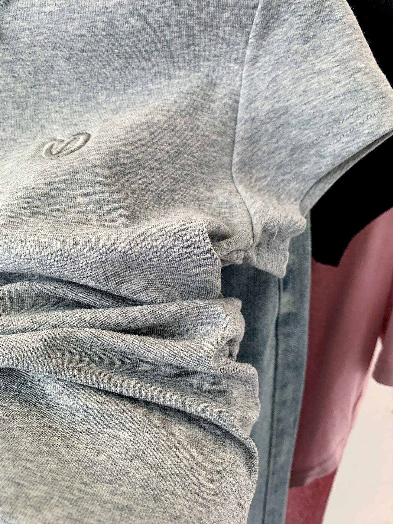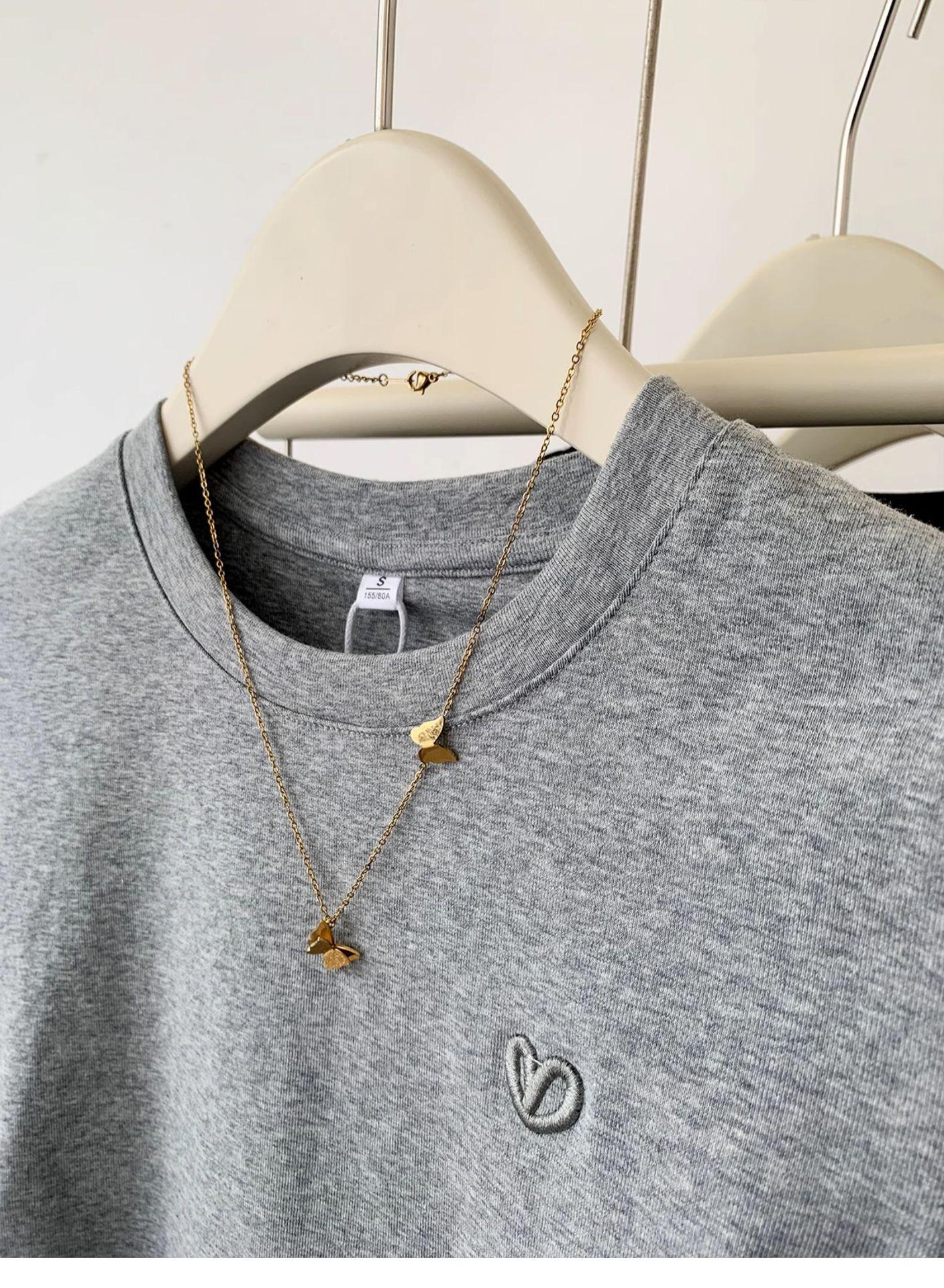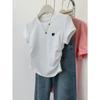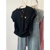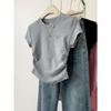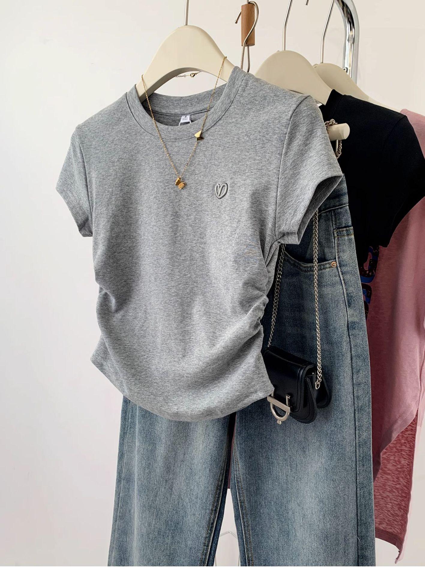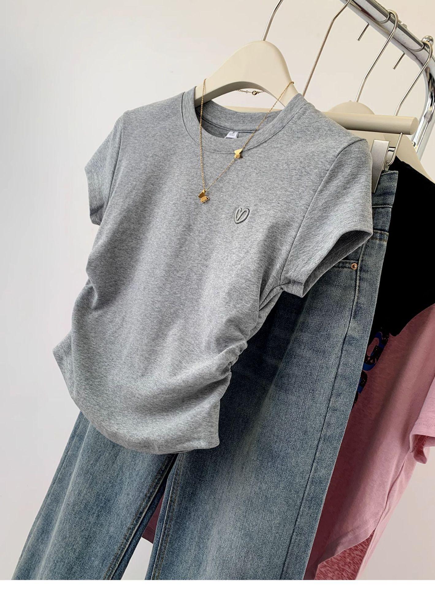 Camiseta Corta Slim de Manga Corta con Corazón Bordado para Mujer Verano Nuevo Diseño Camiseta Hombro Derecho Slim Top Americano
