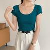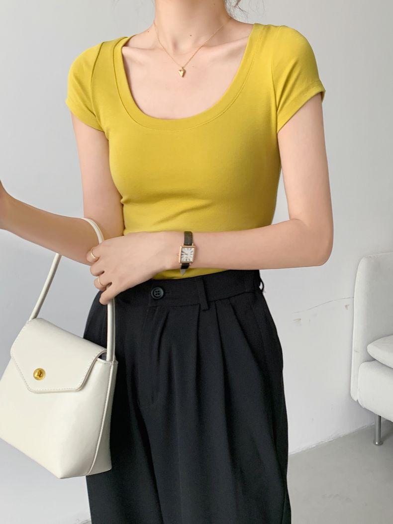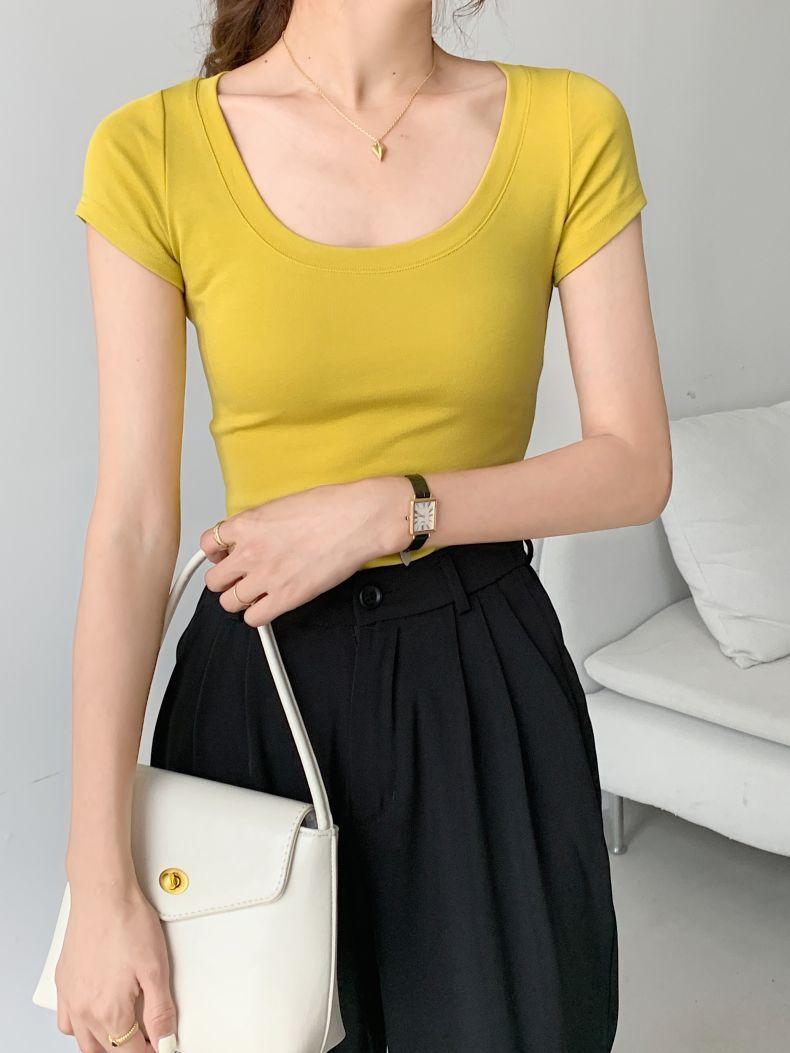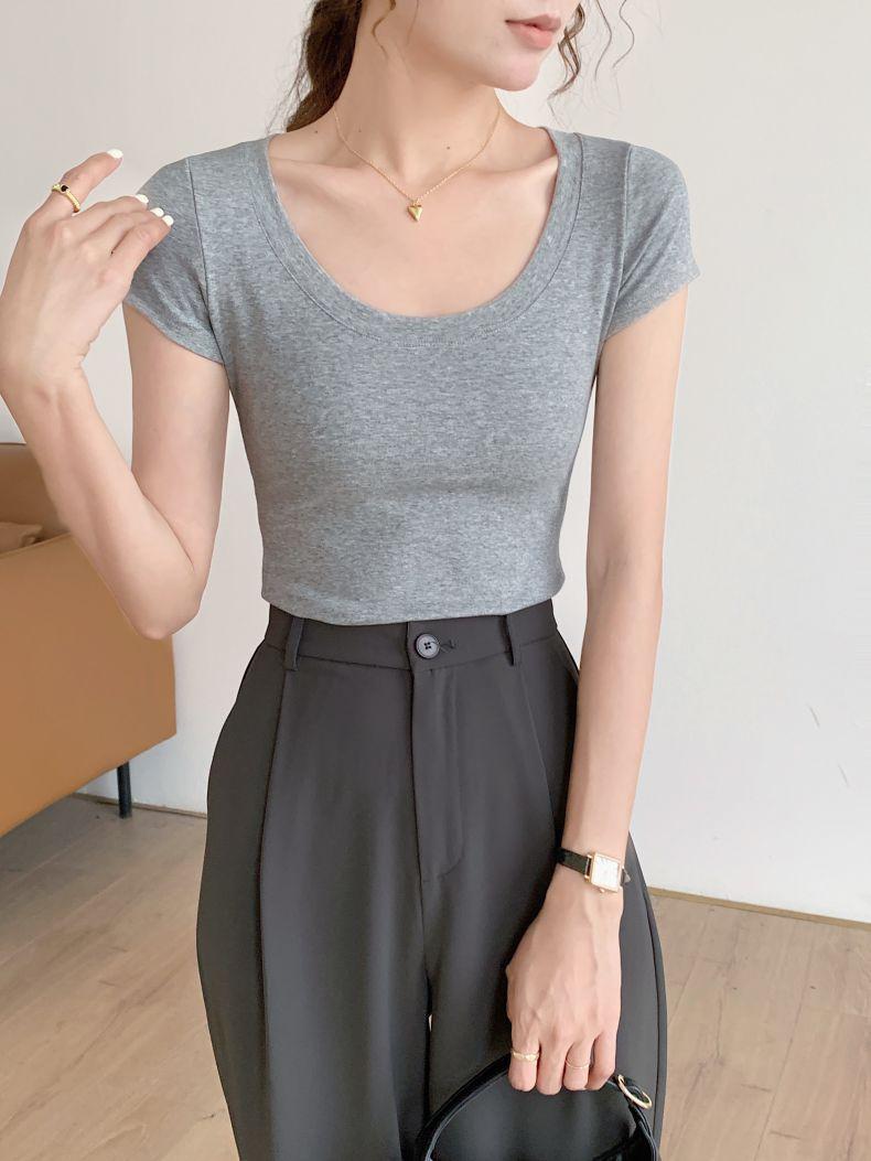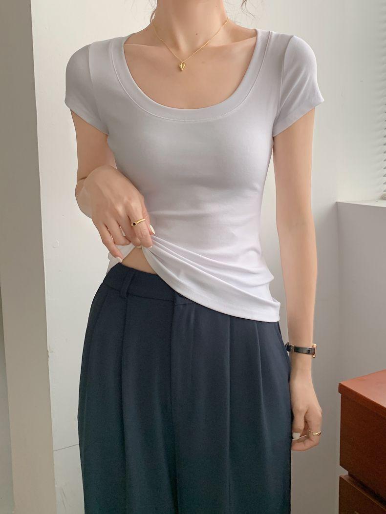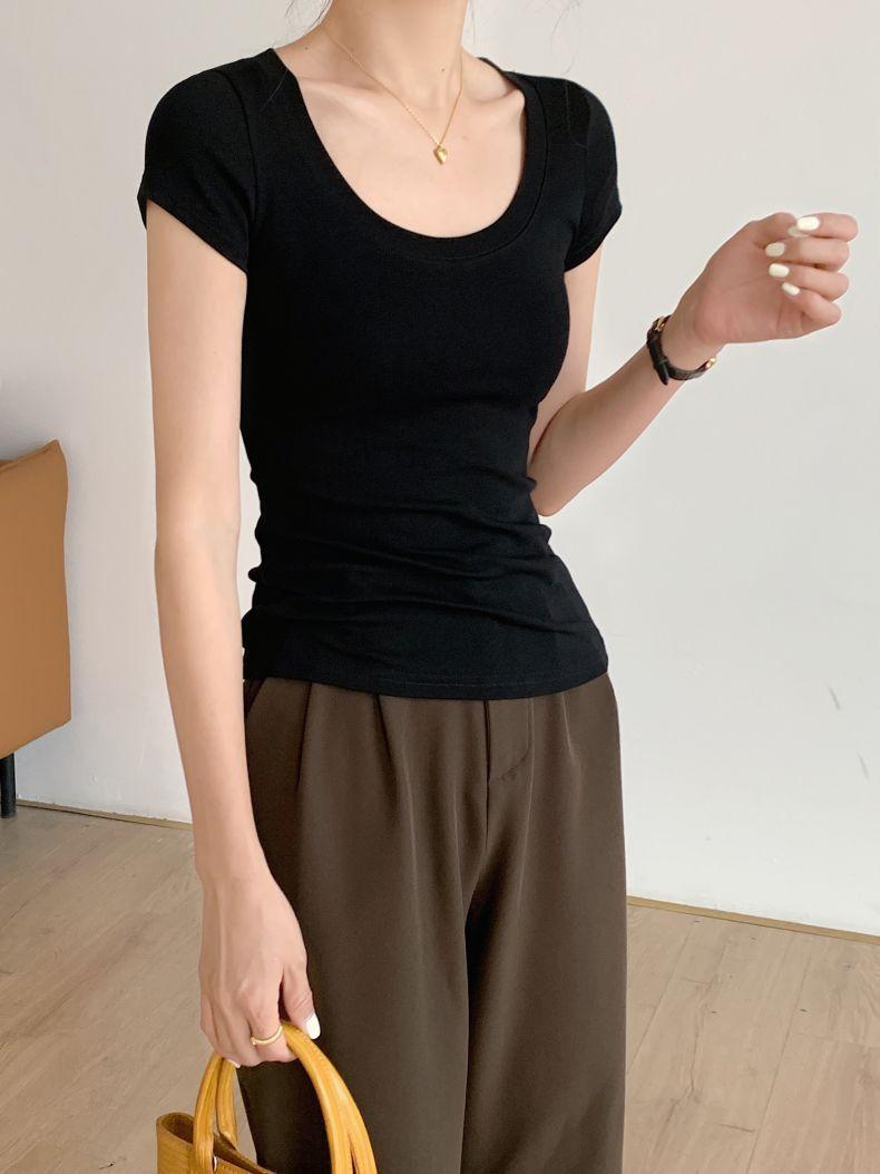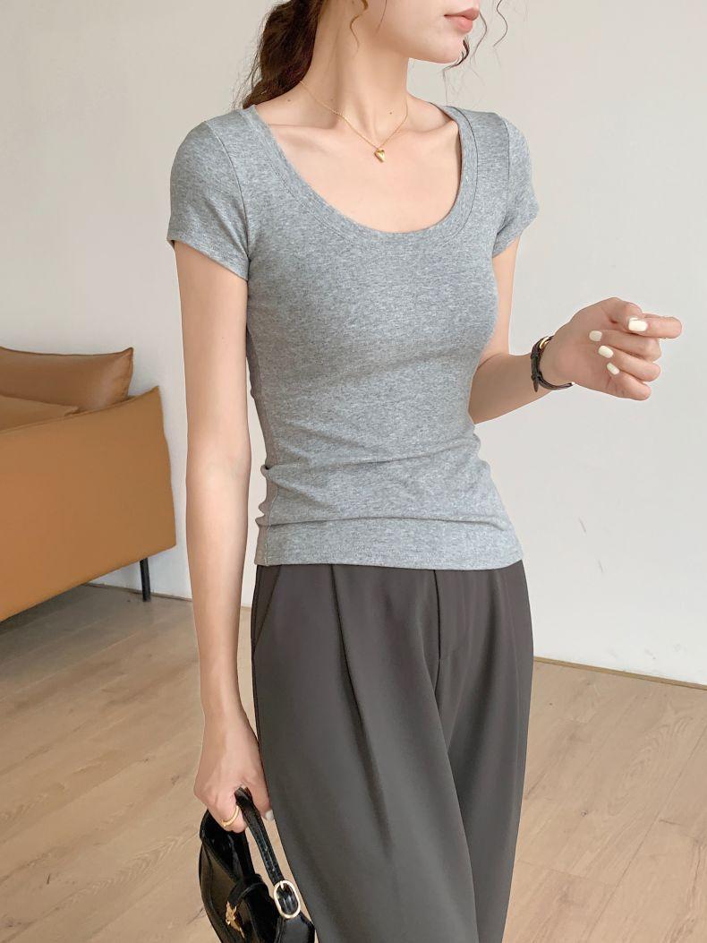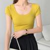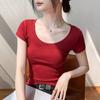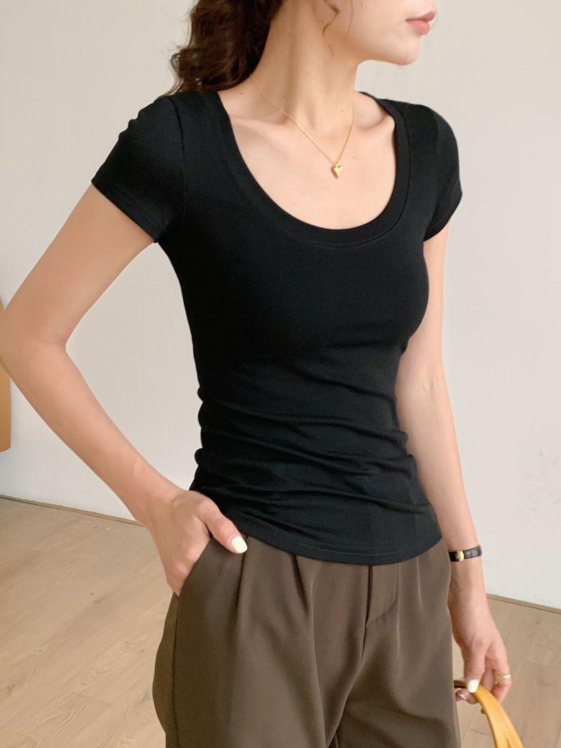 Compra Camiseta de algodón de alta calidad para mujer, de manga corta, ajustada, con cuello redondo, sexy, ajustada, nueva camiseta de verano 2025, color liso. al por mayor en Joom.pro
