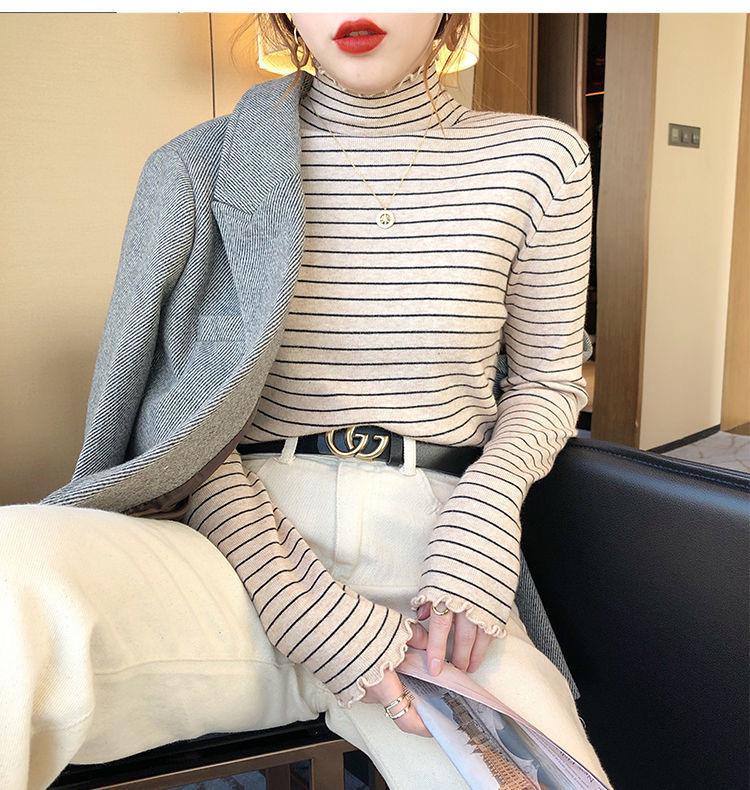 | Camiseta de algodón noble de cuello alto medio a rayas de manga larga para mujer, nueva para otoño e invierno, ins, ajustada, con borde de oreja de madera, top interior |