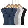 Camiseta de manga corta plisada con cuello levantado y ombligo sexy europea y americana nueva de verano 2024 para mujer