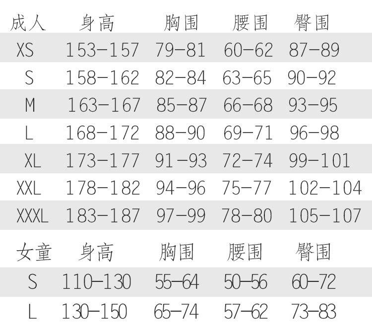 S, M, L, XL, XXL, XXXL, Children's 110, Children's 120, Children's 130, Children's 140, Children's 150