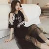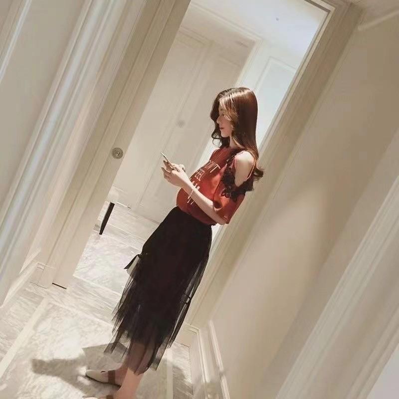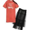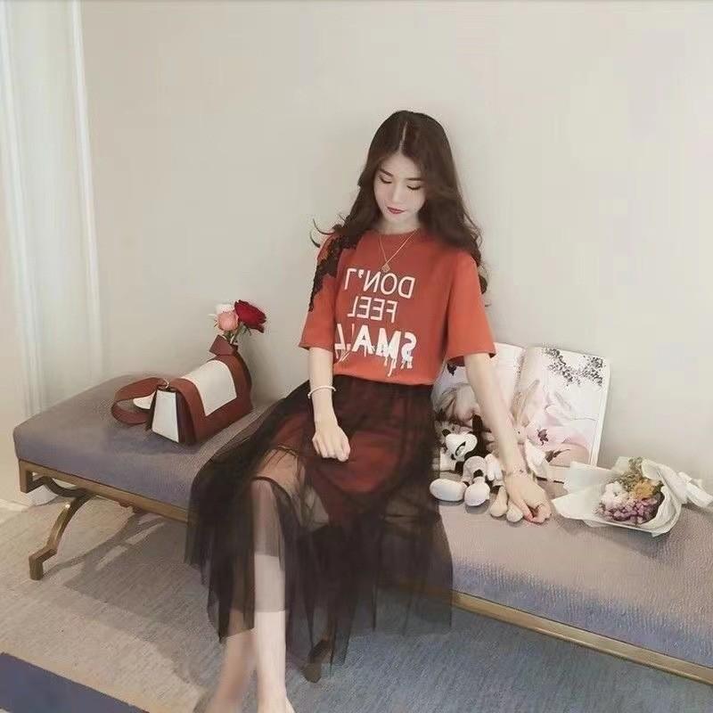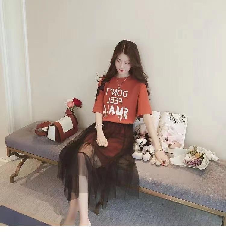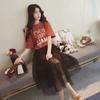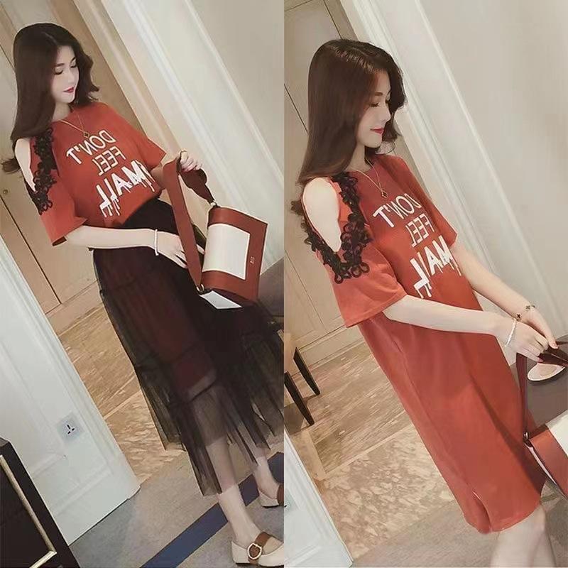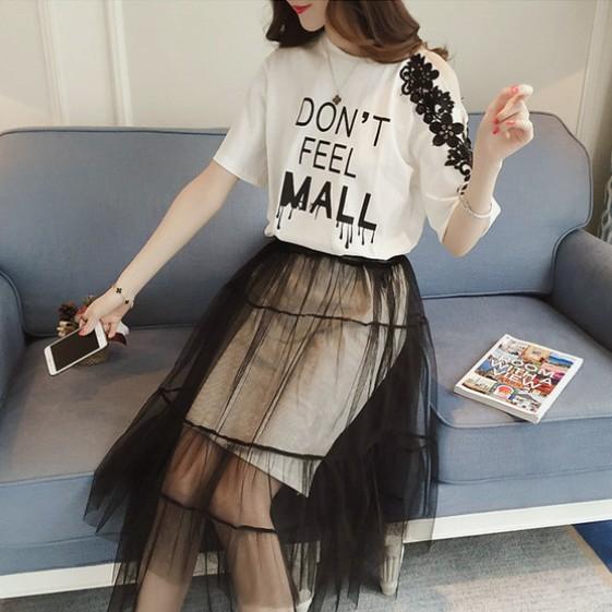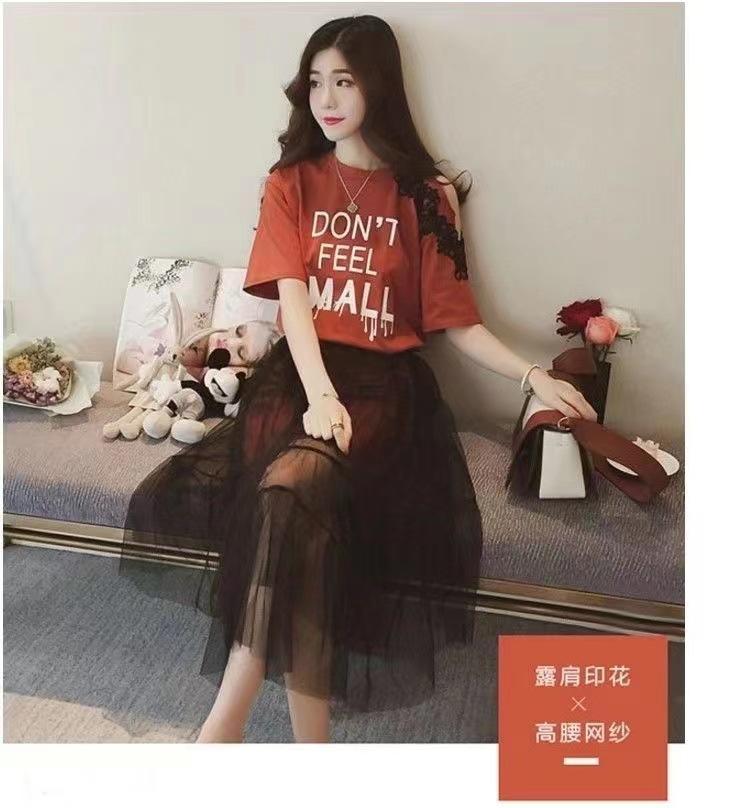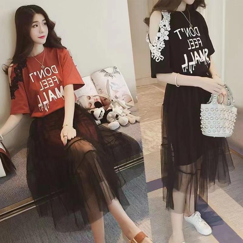 Falda de Traje Estilo Coreano para Mujer Verano Nuevo Talla Grande Vestido Camiseta de Media Manga con Hombros Descubiertos para Mujer Falda de Malla Conjunto de Dos Piezas