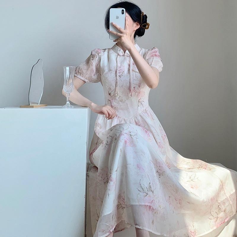 Compra Vestido cheongsam elegante de manga corta con estampado floral de estilo francés para mujer, novedad de verano 2024, estilo nacional, con hebilla vintage modificada al por mayor en Joom.pro