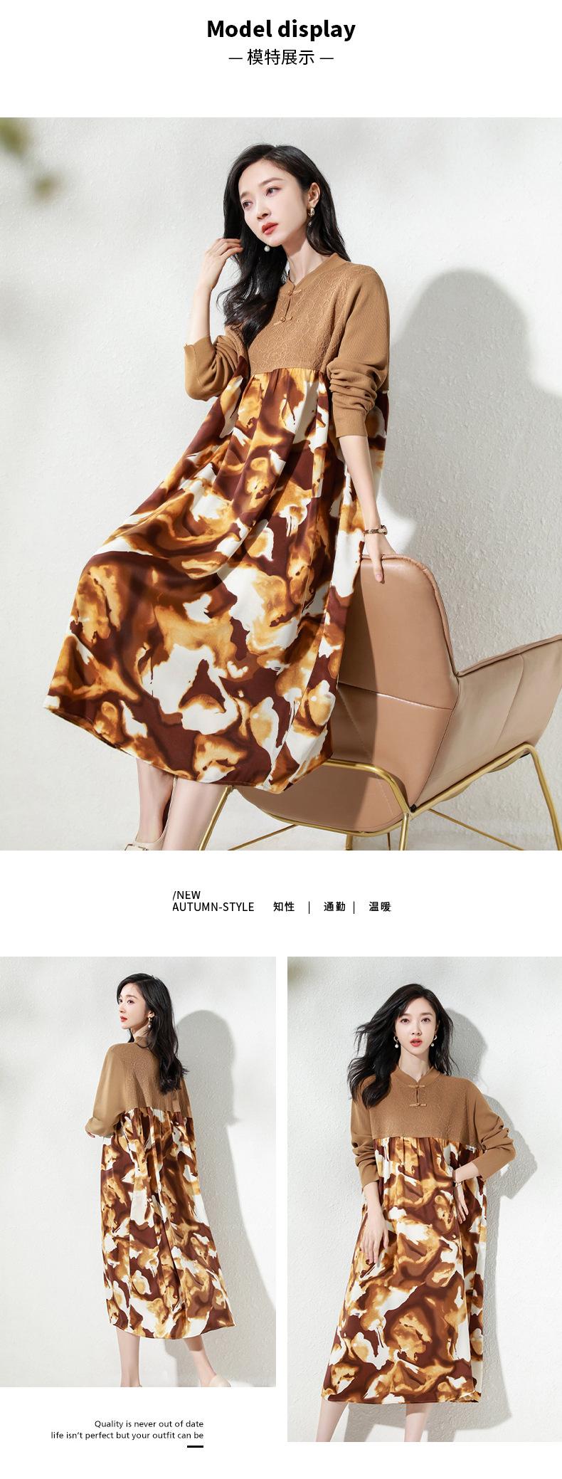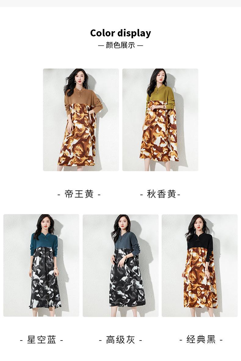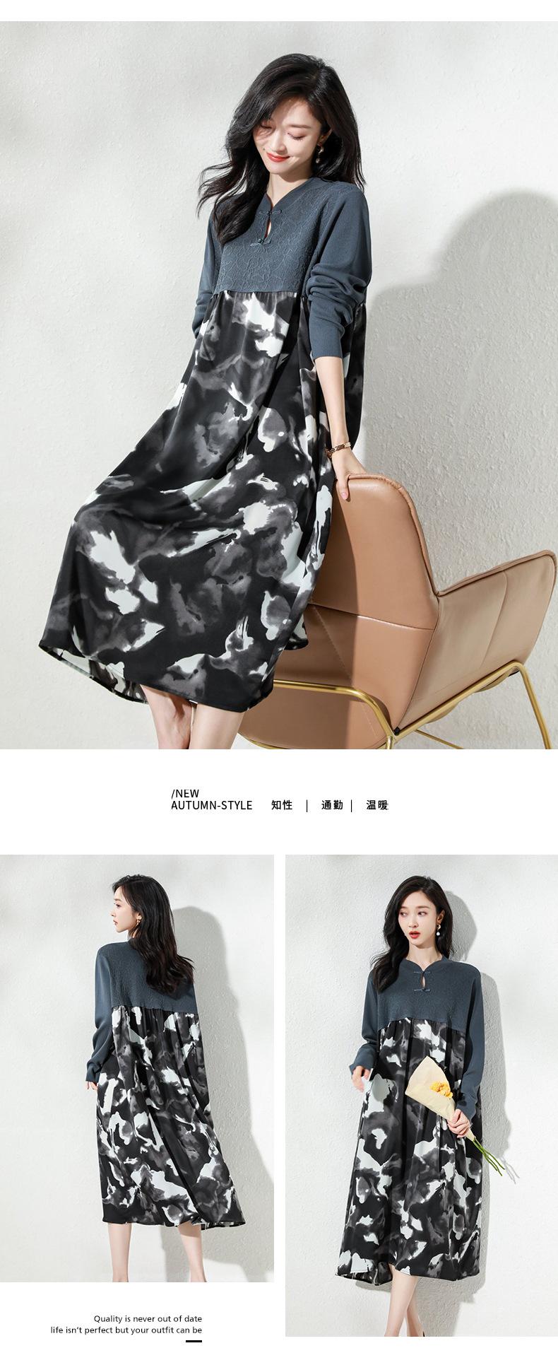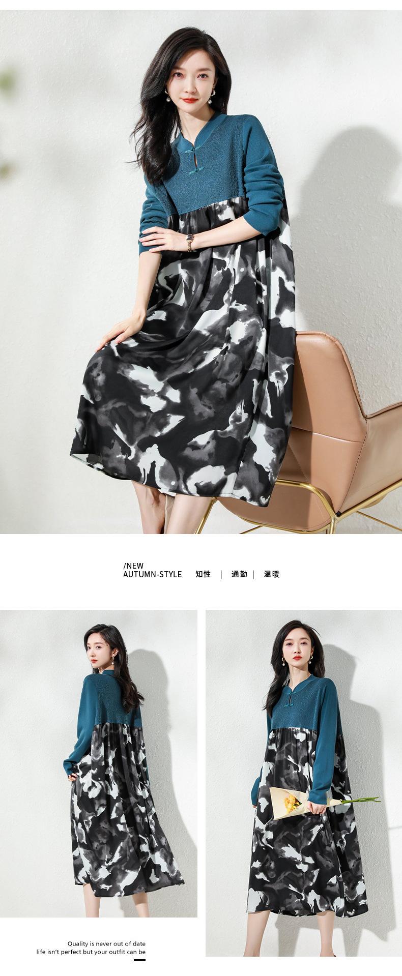 Nuevo vestido de manga larga con hebilla de estilo chino, primavera y verano 2024, nuevo diseño de color contrastante, falda de punto con costura de longitud media