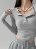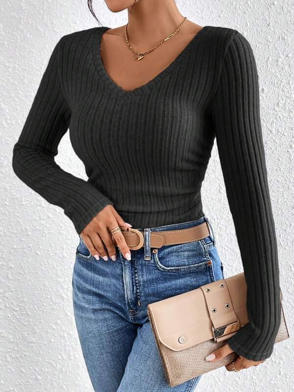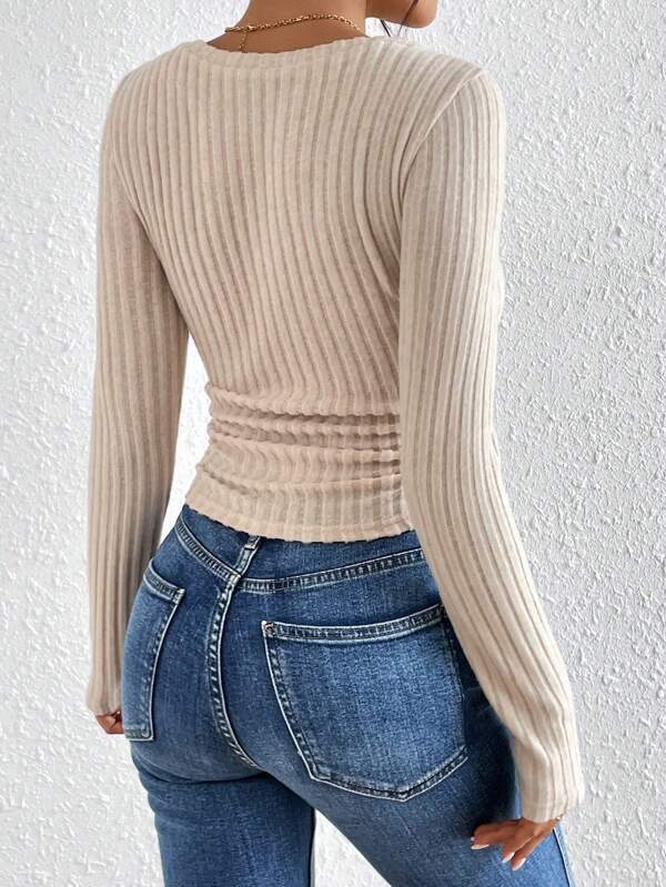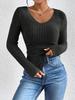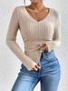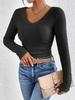 Amazon 2023 Otoño Europeo y Americano Versátil Color Sólido Cuello en V Fruncido Lateral Manga Larga Acanalada Cepillada Camiseta para Mujer, Corte Ajustado