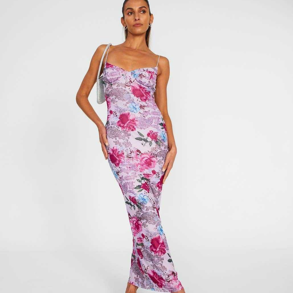 Vestido Sexy de Tirantes Estilo Europeo y Americano 2025 Estampado Tirantes Ajustados Sin Mangas Espalda Hermosa Falda Jersey Cintura Media Sin Regulaciones