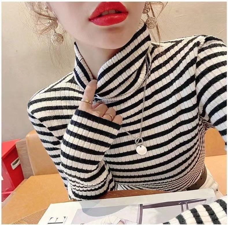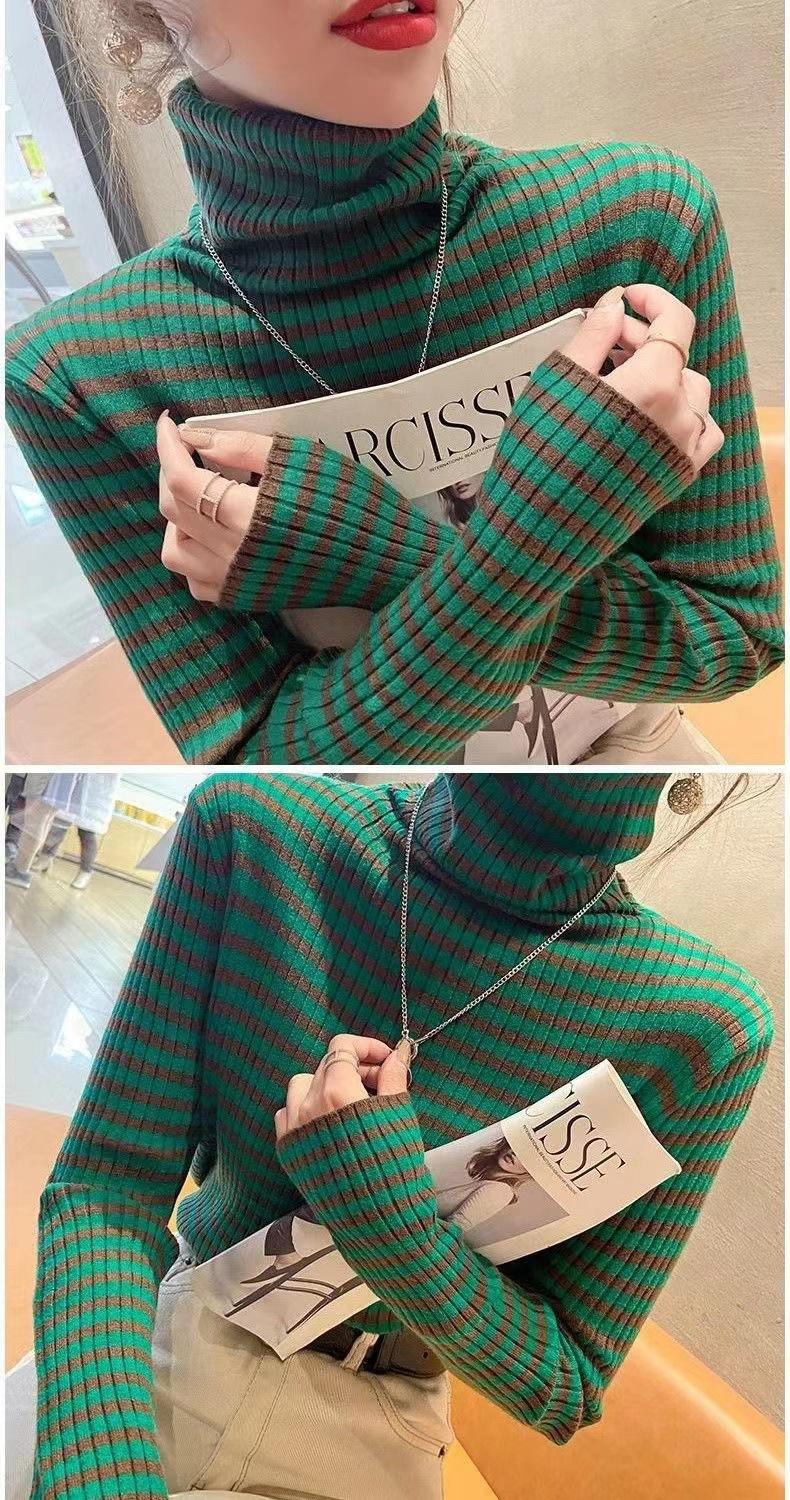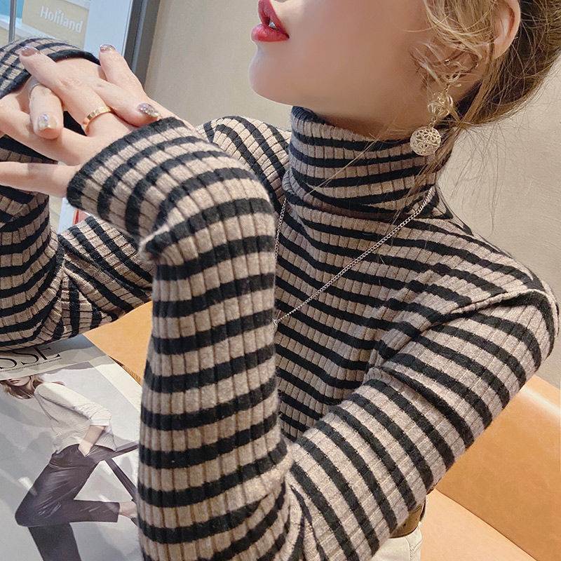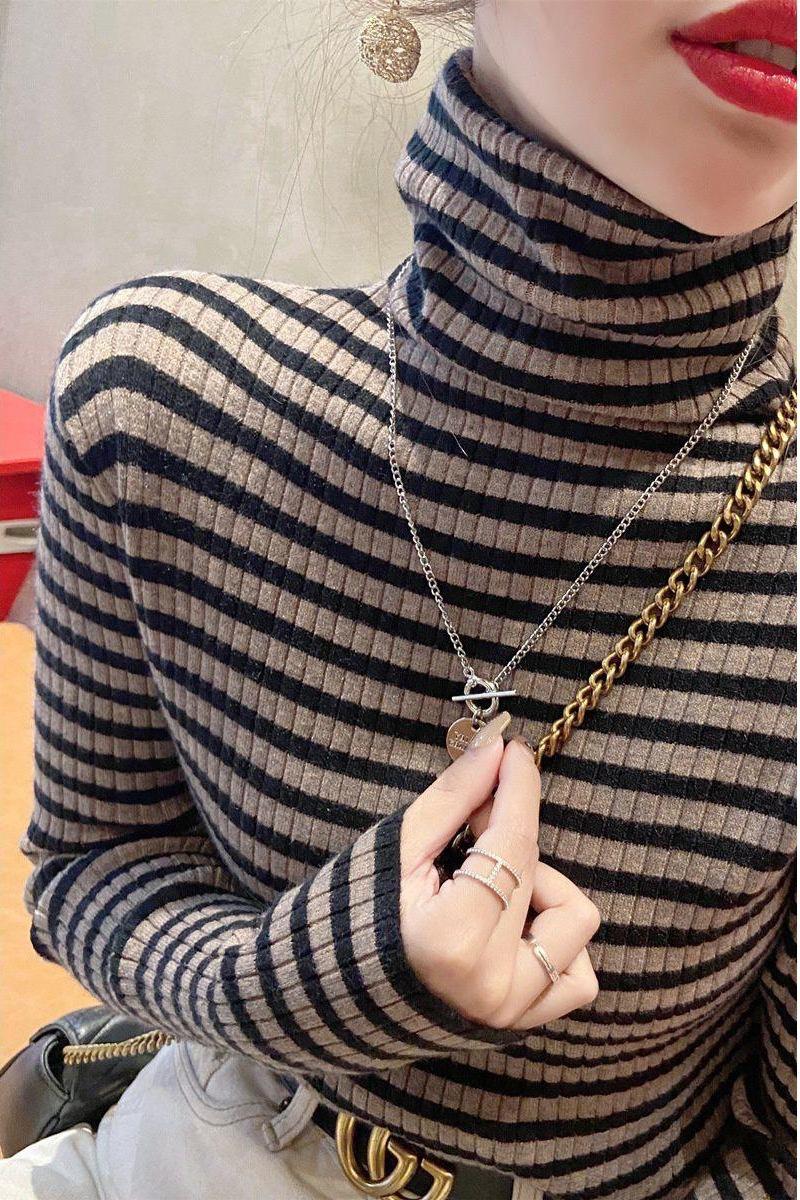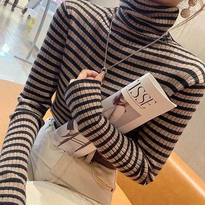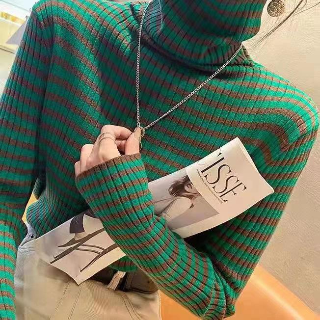 Camiseta Básica de Cuello Alto a Rayas para Mujer Nueva Primavera y Otoño 2023 Versátil Ajustada Adelgazante Suéter de Cuello Alto Top Interior