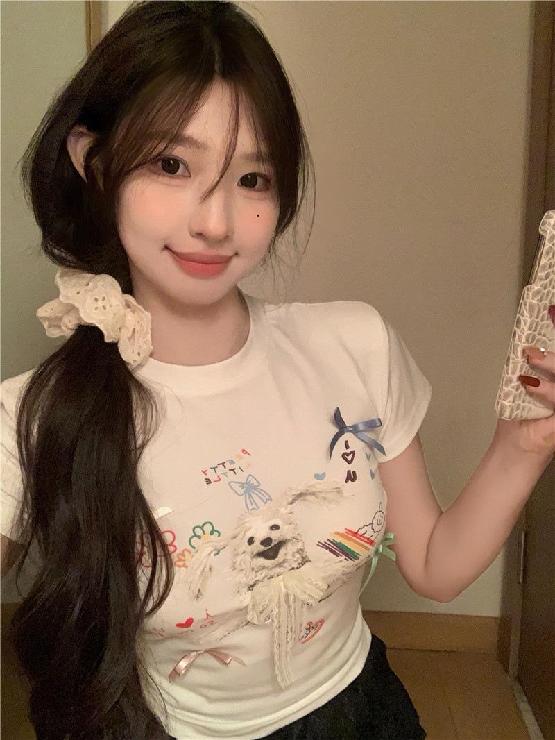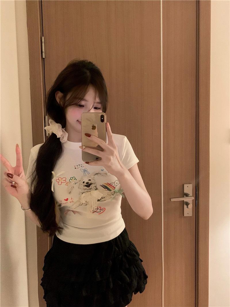 Compra Camiseta de manga corta estampada de verano con cabello lacio de fuente de fábrica en stock para mujer, top corto ajustado a la moda que combina con todo. al por mayor en Joom.pro