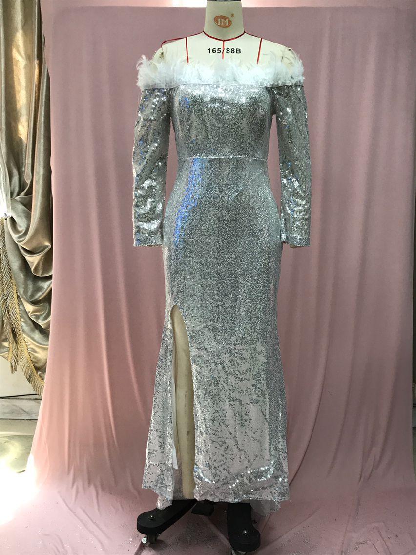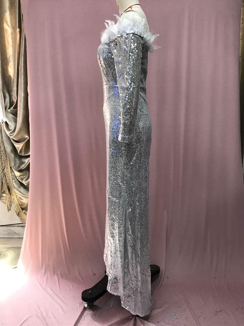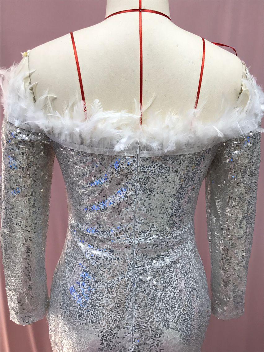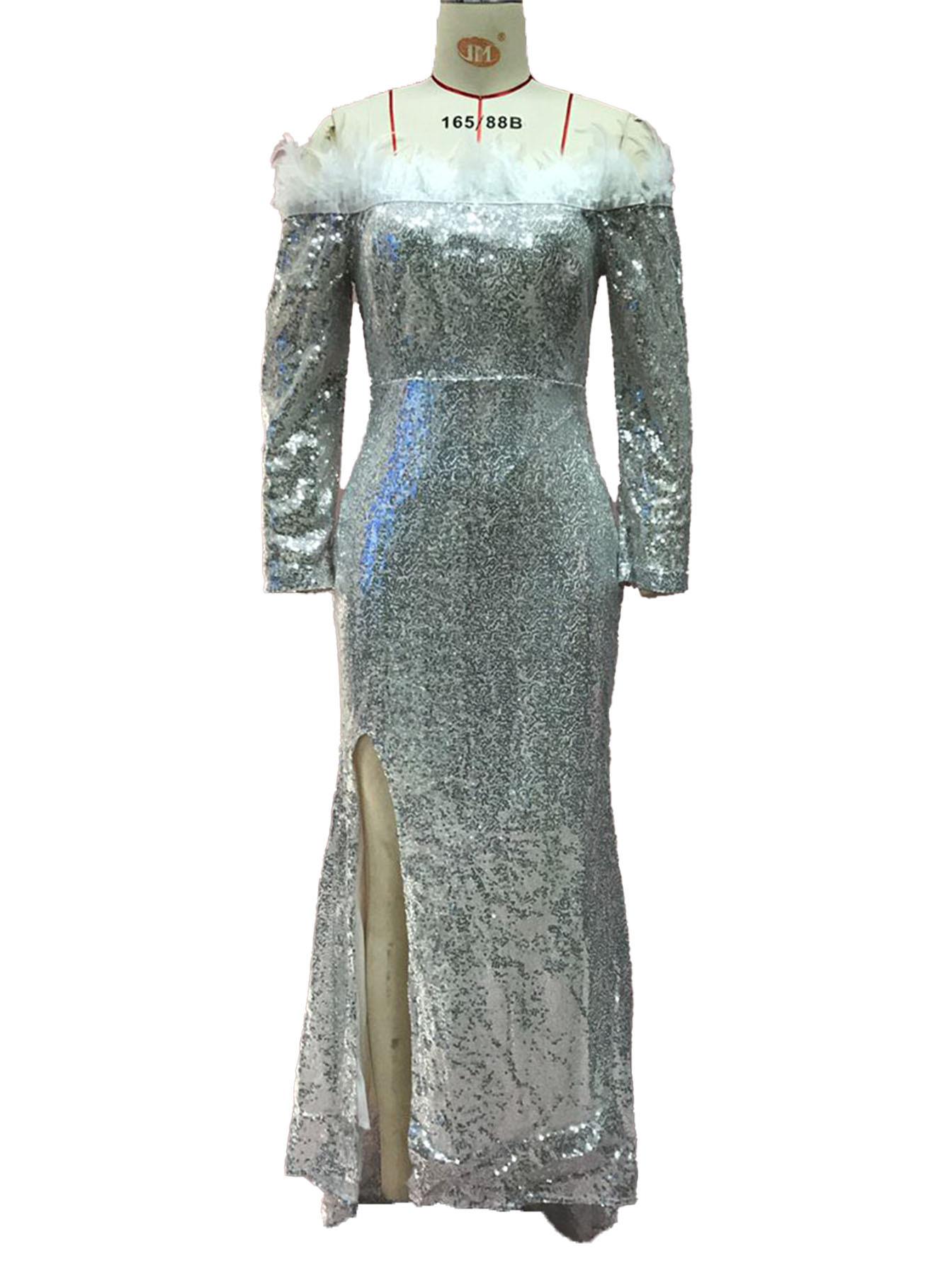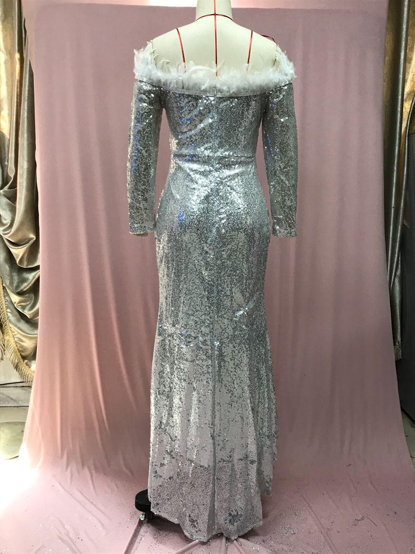 2025 Nuevo Vestido de Moda Transfronteriza Europea y Americana Ebay Sexy con Plumas Espolvoreadas de Oro, Abertura, Cubre Caderas, Banquete, Vestido de Noche