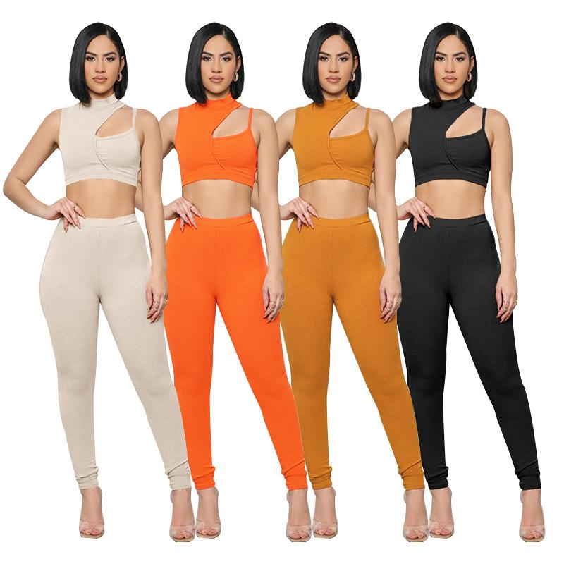 Tops sin mangas con un solo hombro, de color sólido, de primavera y verano, transfronterizos, europeos y americanos, para mujeres, pantalones que dejan al descubierto el ombligo, trajes casuales de moda |