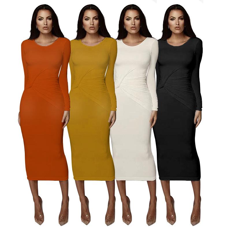 Vestido plisado de manga larga ajustado de longitud media con ajuste ceñido hasta la cadera de color sólido nuevo para primavera y otoño de Europa y América transfronteriza |