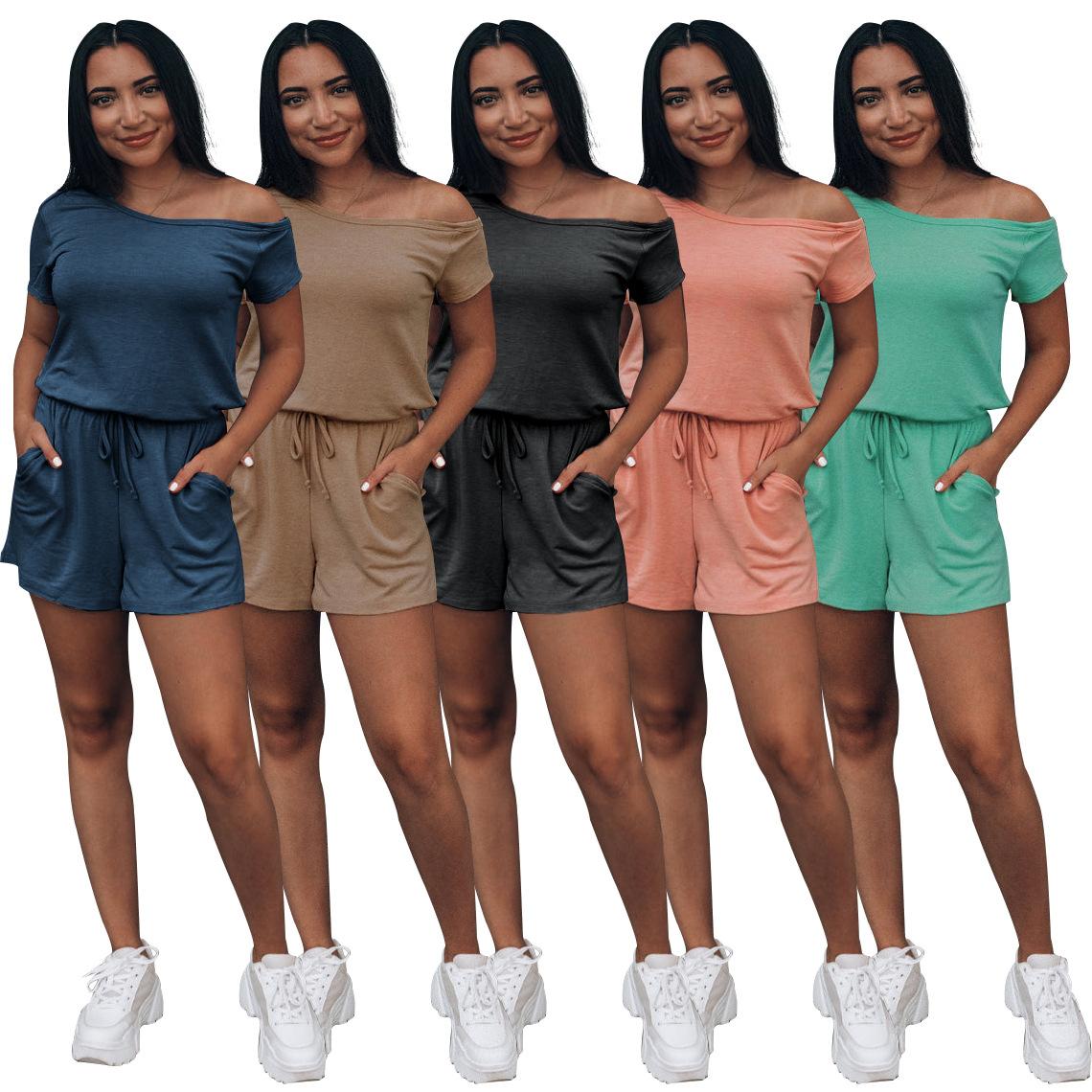 Mono holgado de manga corta con hombros descubiertos y color sólido versátil para mujer, estilo urbano, de verano, de nueva moda europea y americana transfronteriza |