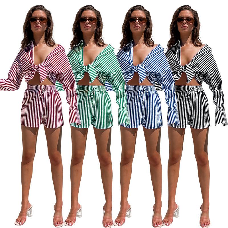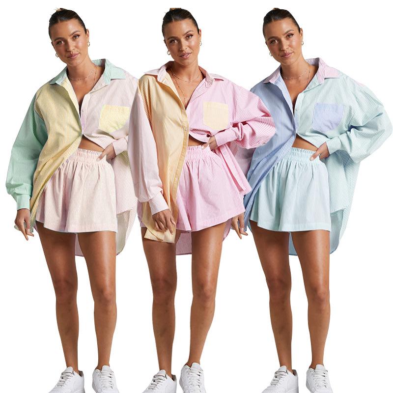 Ropa transfronteriza para mujeres europeas y americanas, camisa de manga larga a rayas de un solo pecho con combinación de colores, traje de dos piezas, traje corto informal de moda |