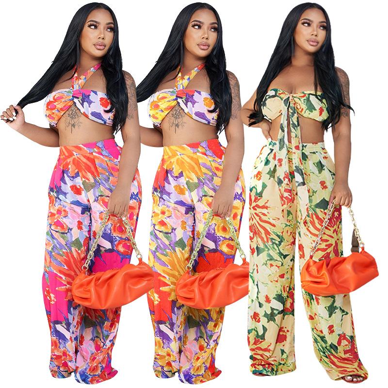 Conjunto de dos piezas de ropa de mujer con cuello halter y pecho estampado de nueva moda transfronteriza europea y americana, pantalones casuales sexys, traje de primavera y verano |