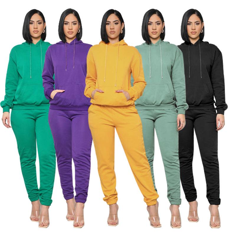 Sudadera de manga larga con capucha y cordón con bolsillo de parche de color sólido europeo y americano nueva primavera y otoño, ropa de mujer, pantalones cónicos, traje casual de moda |