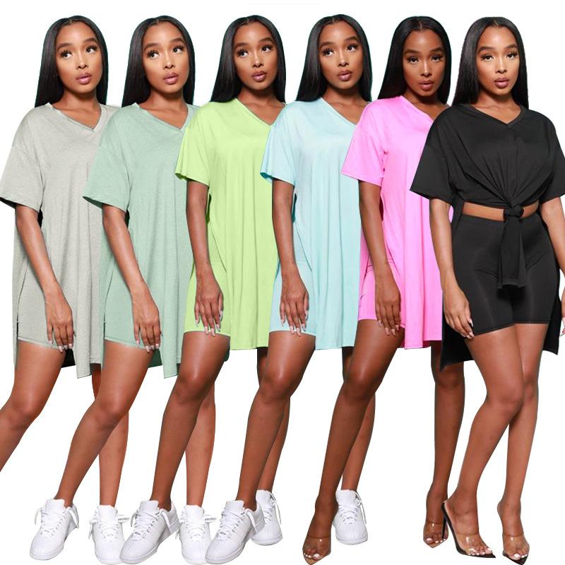 Nuevos trajes de dos piezas de pantalones cortos para mujer de verano transfronterizos europeos y americanos, modernos e informales, de color sólido, con cuello en V, manga corta y abertura en la parte superior. |