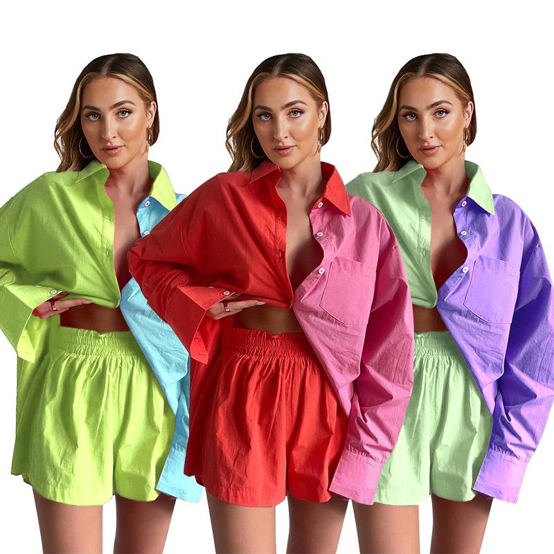 Traje de dos piezas de primavera y verano europeo y americano con costuras de color sólido, camisa de solapa de manga larga de un solo pecho, pantalones cortos, traje casual de moda holgado |