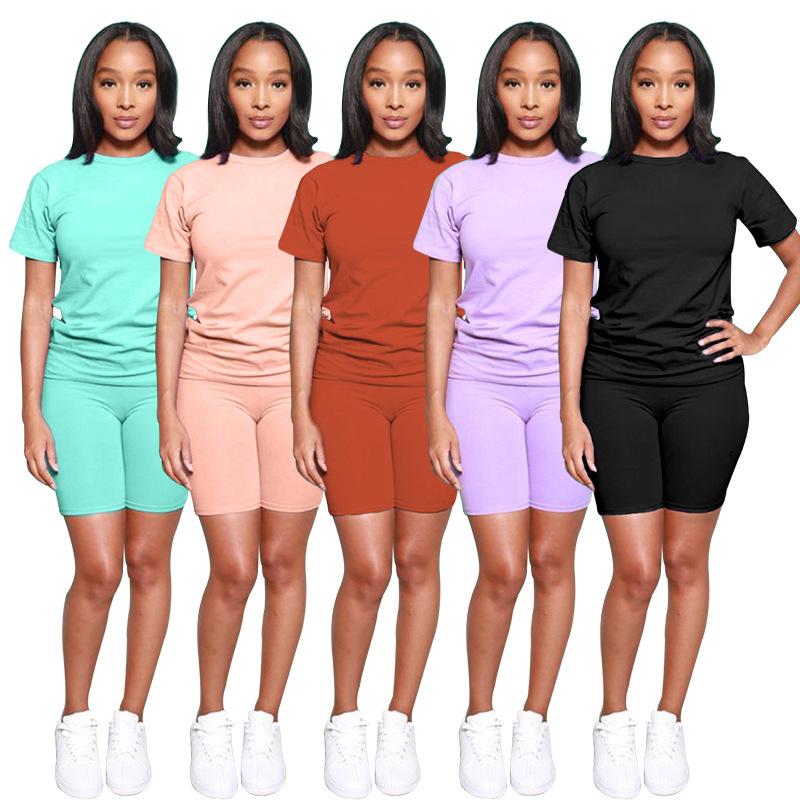 Traje de dos piezas con cuello redondo y manga corta de color liso de verano europeo y americano transfronterizo, pantalones cortos casuales urbanos, traje de moda para mujer |