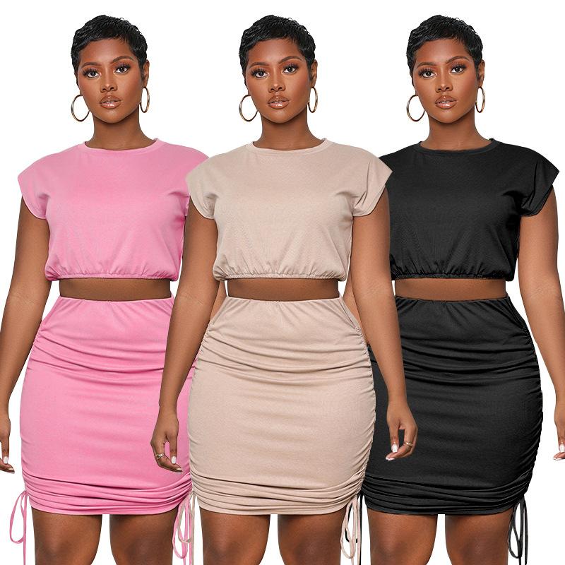 Recién llegado, jersey de cuello redondo de color sólido de verano transfronterizo europeo y americano, falda plisada con cordón para mujer, traje informal de moda |