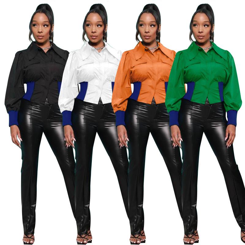 Camisa de manga larga con costuras en la cintura, cárdigan de un solo pecho, de color sólido, con solapa informal, nueva moda transfronteriza europea y americana para primavera y otoño para mujer |