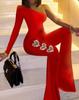 2023 Ropa de mujer de comercio exterior europea y americana elegante hombro oblicuo manga única pedrería calado color sólido ajustado mono