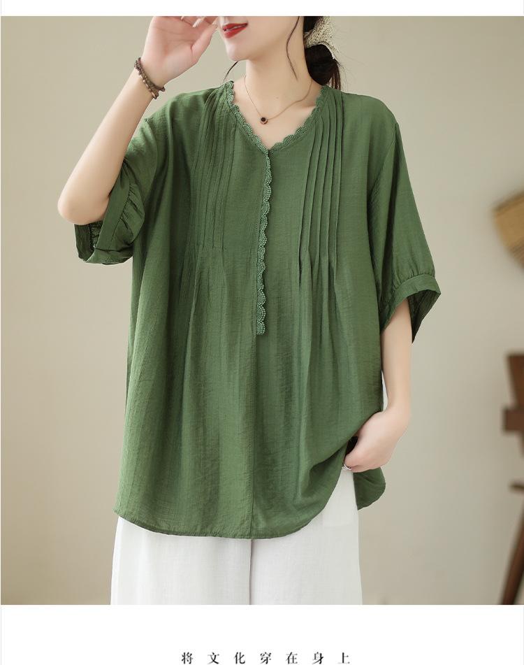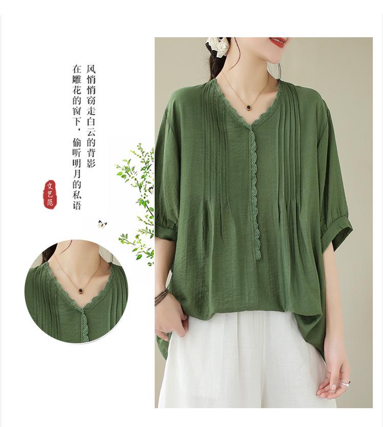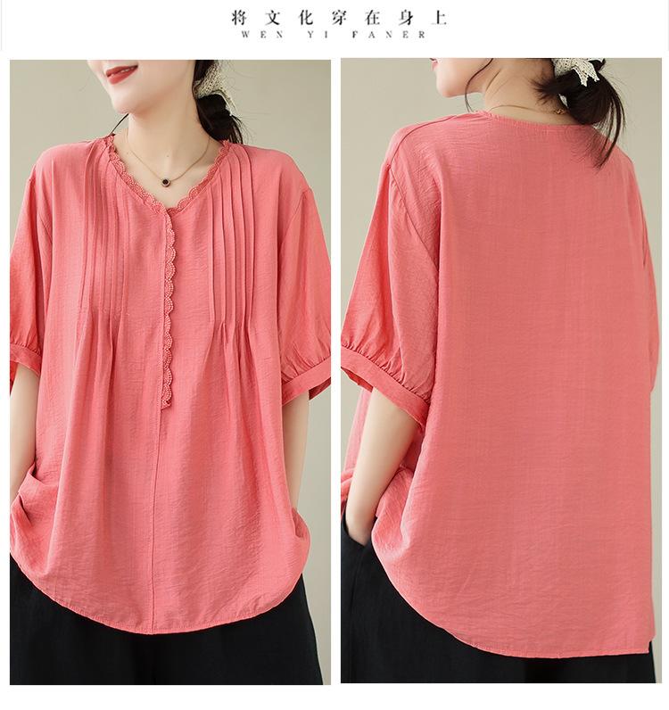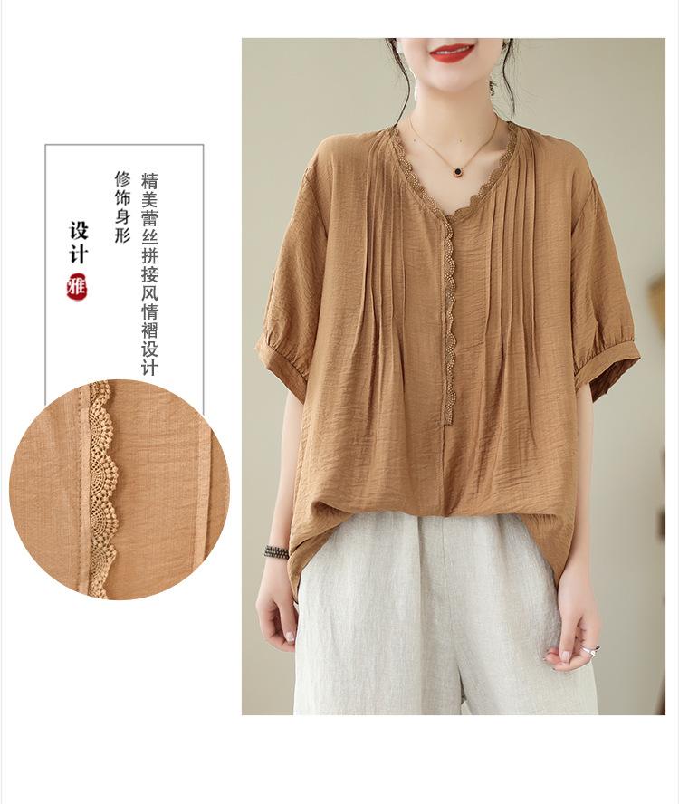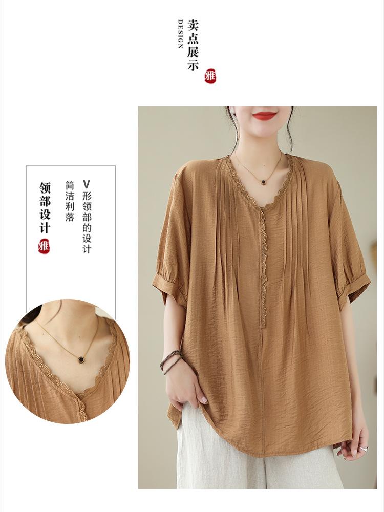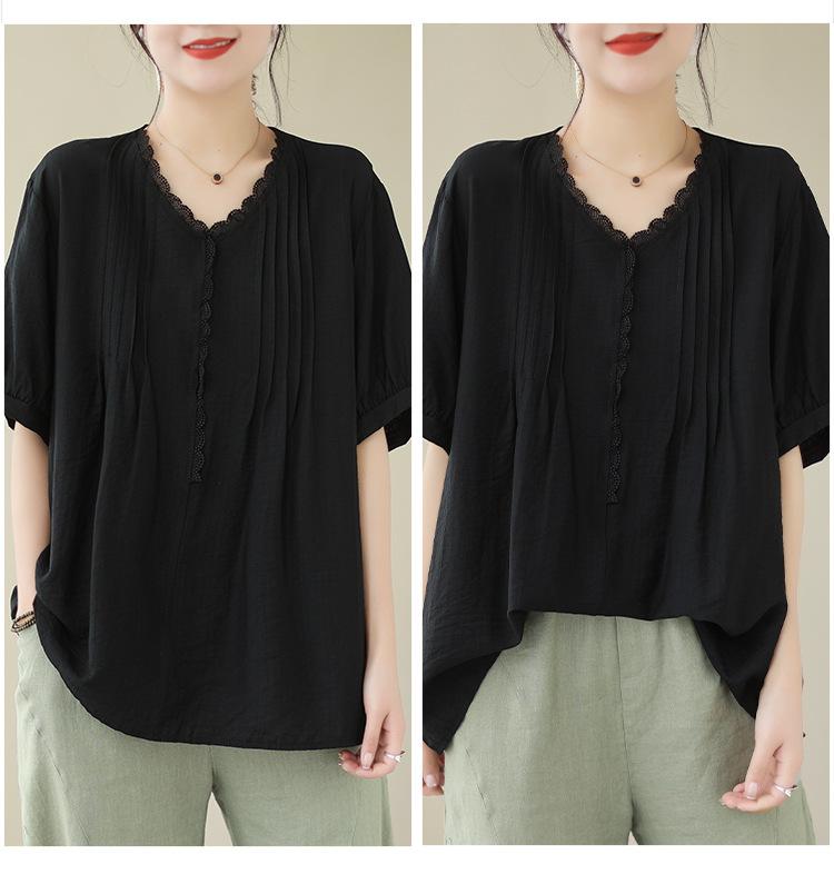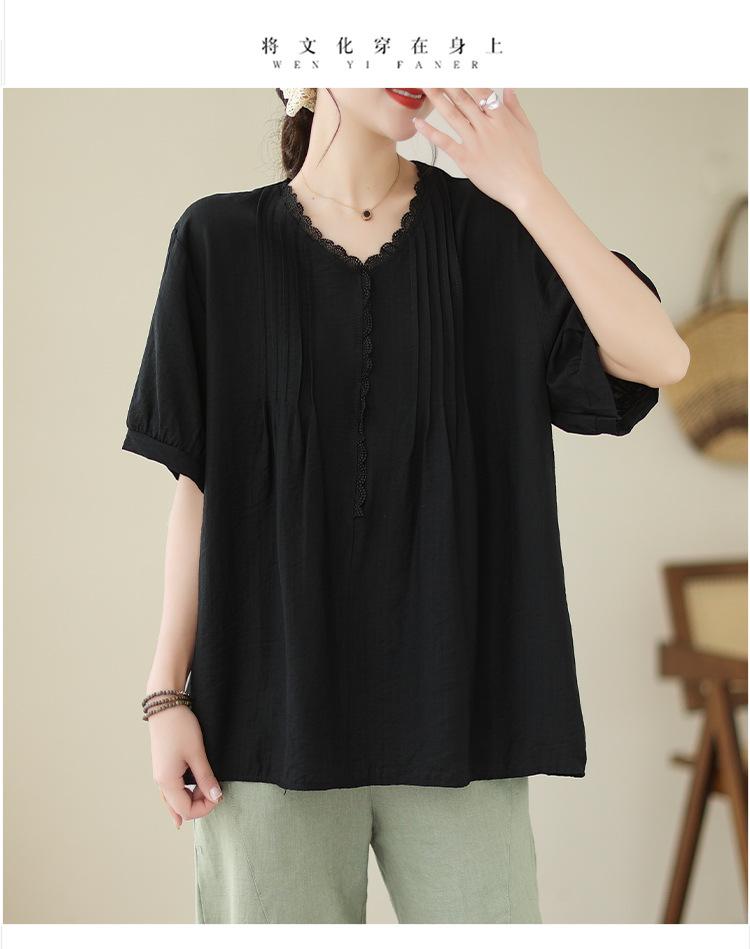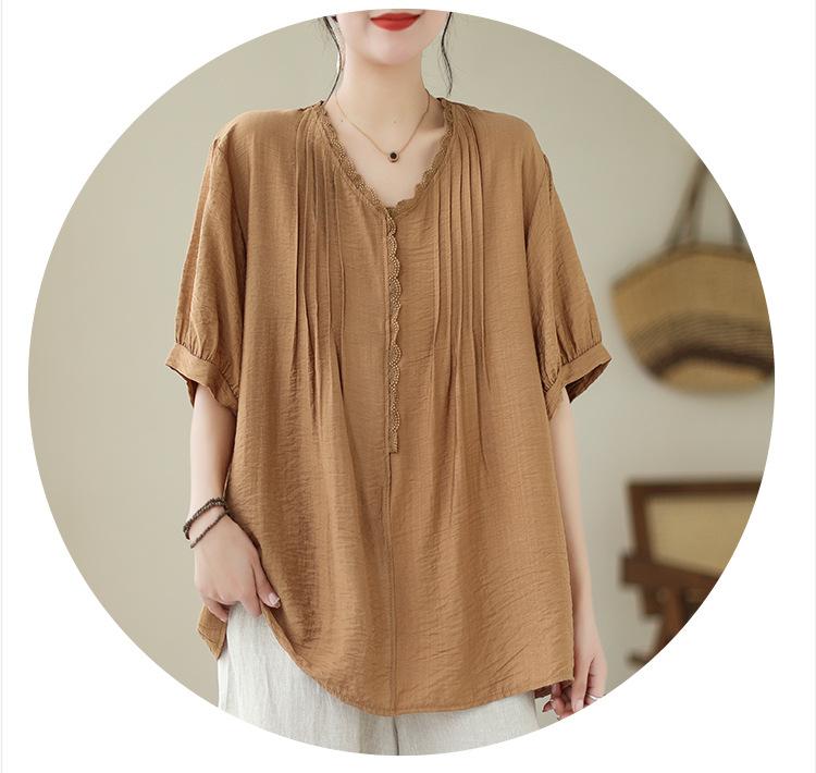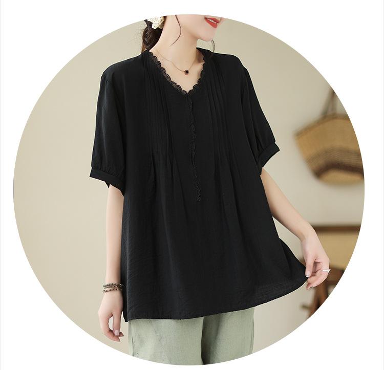 Camisa de encaje artístico con cuello en V para mujer, de verano, talla grande, holgada, informal, de color sólido, elegante, de manga corta, para chica gordita