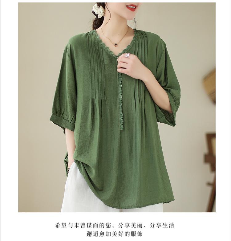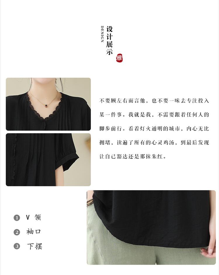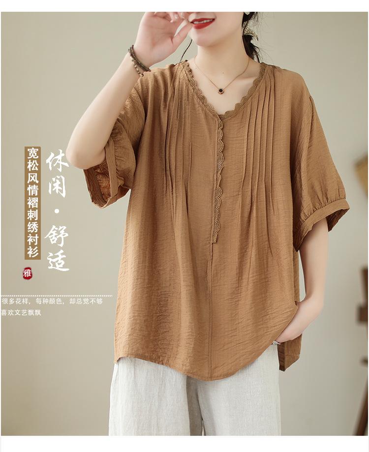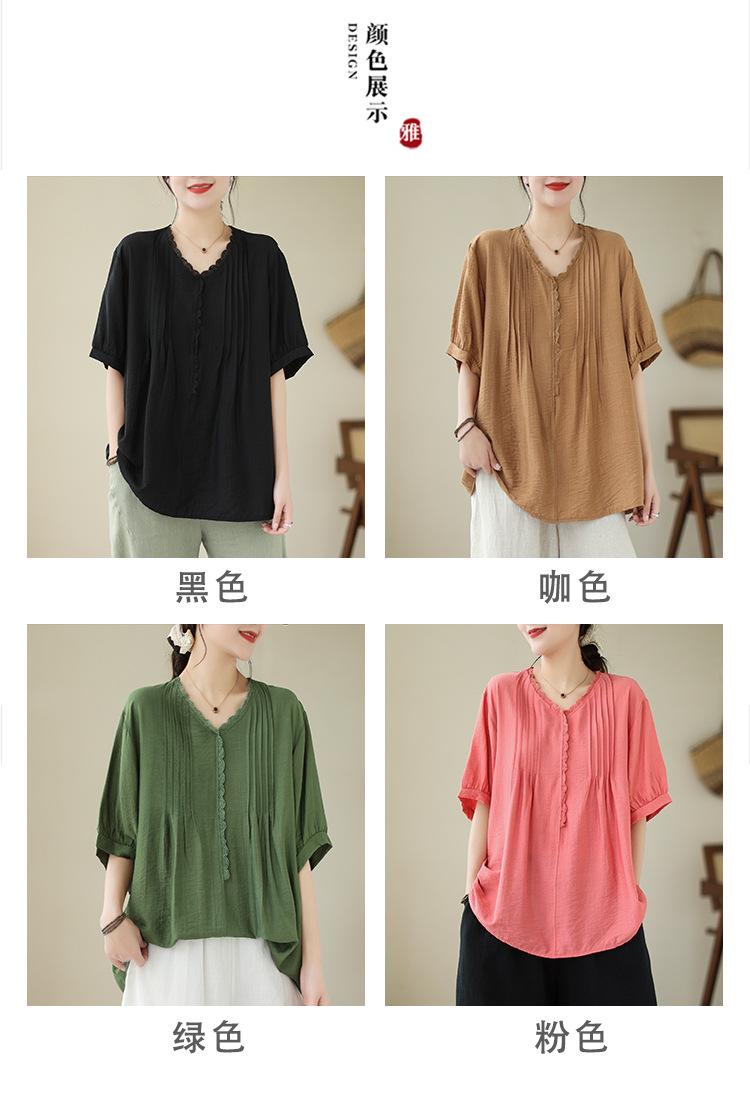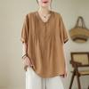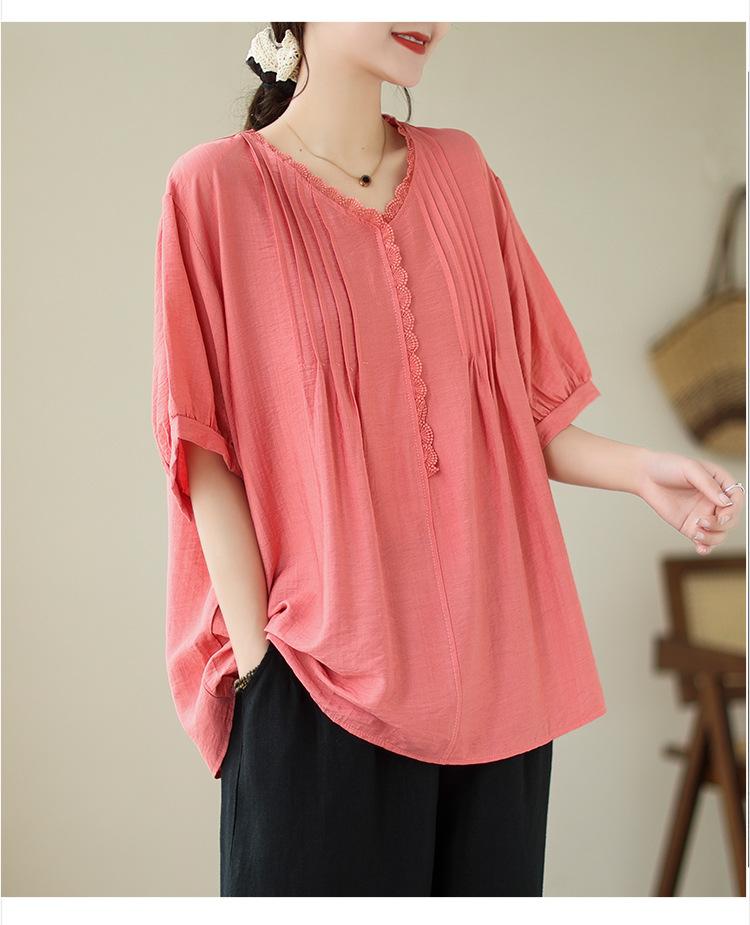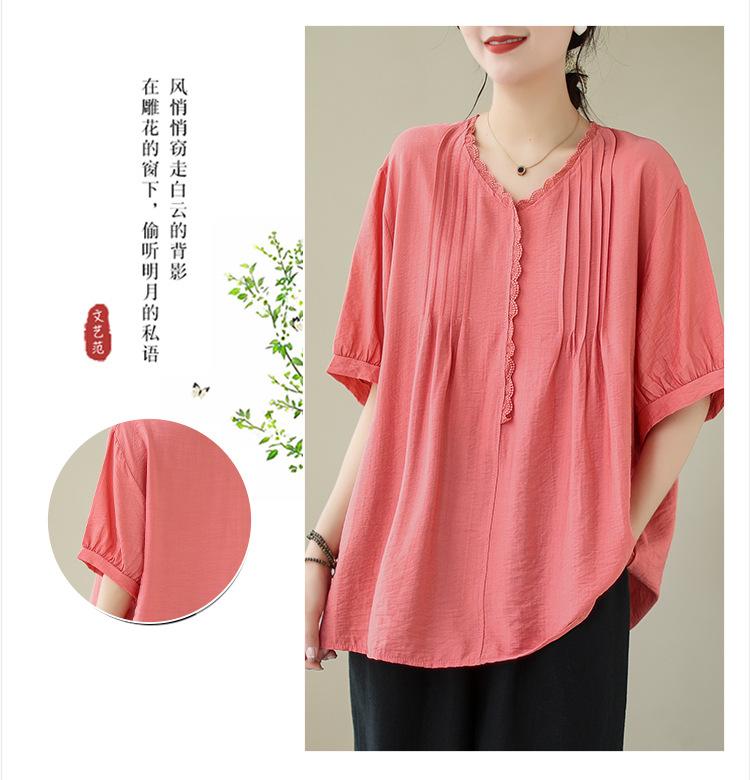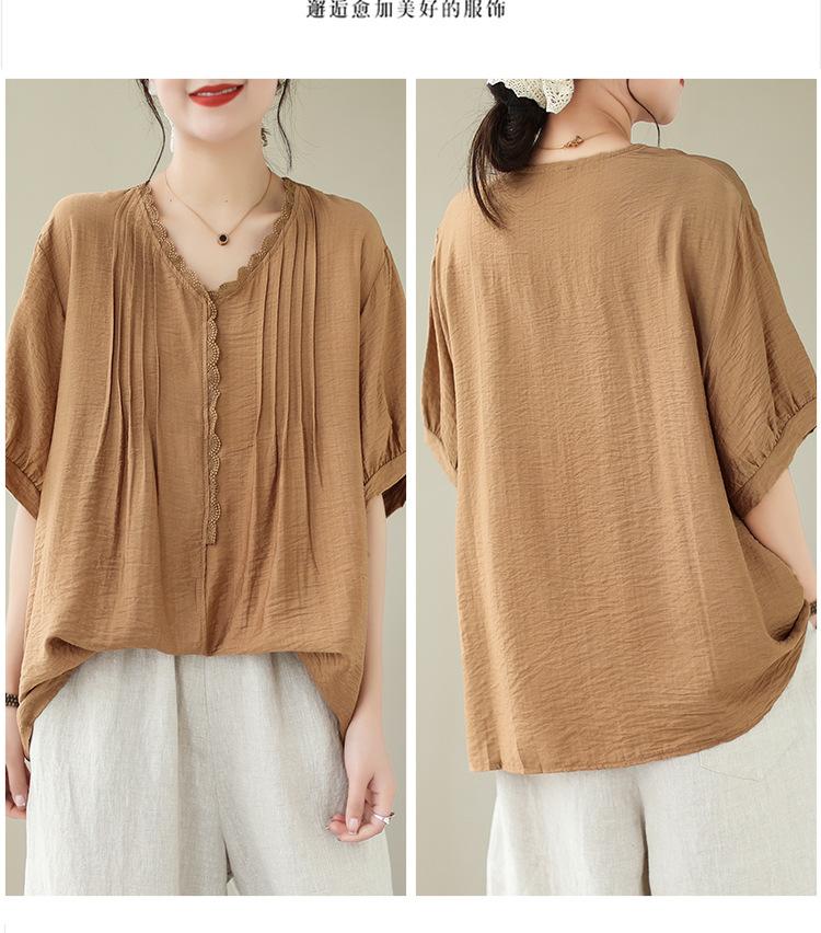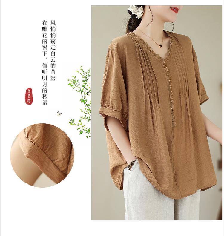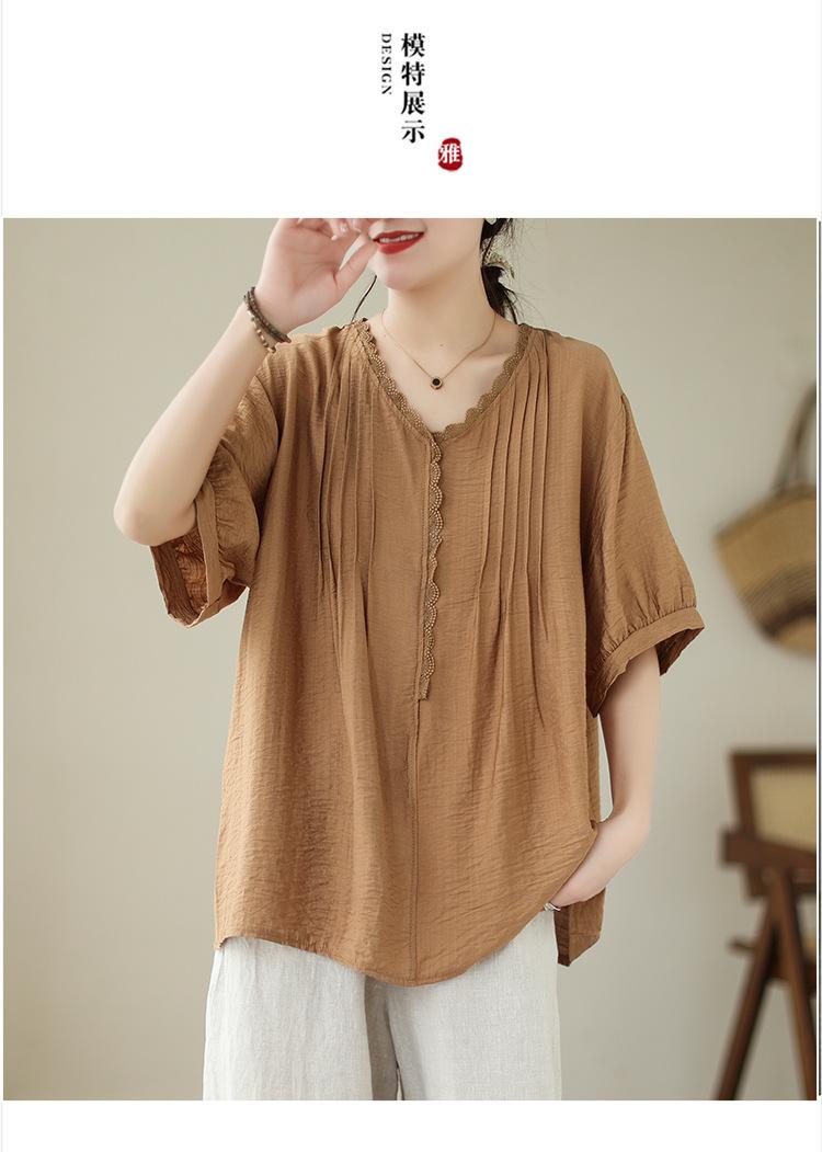 Camisa de encaje artístico con cuello en V para mujer, de verano, talla grande, holgada, informal, de color sólido, elegante, de manga corta, para chica gordita