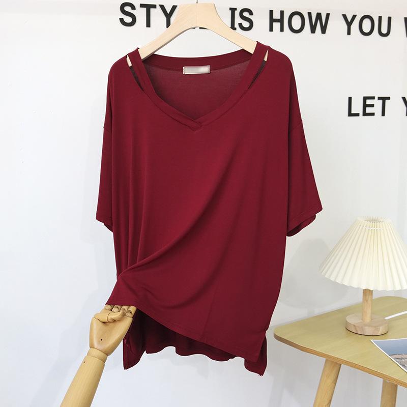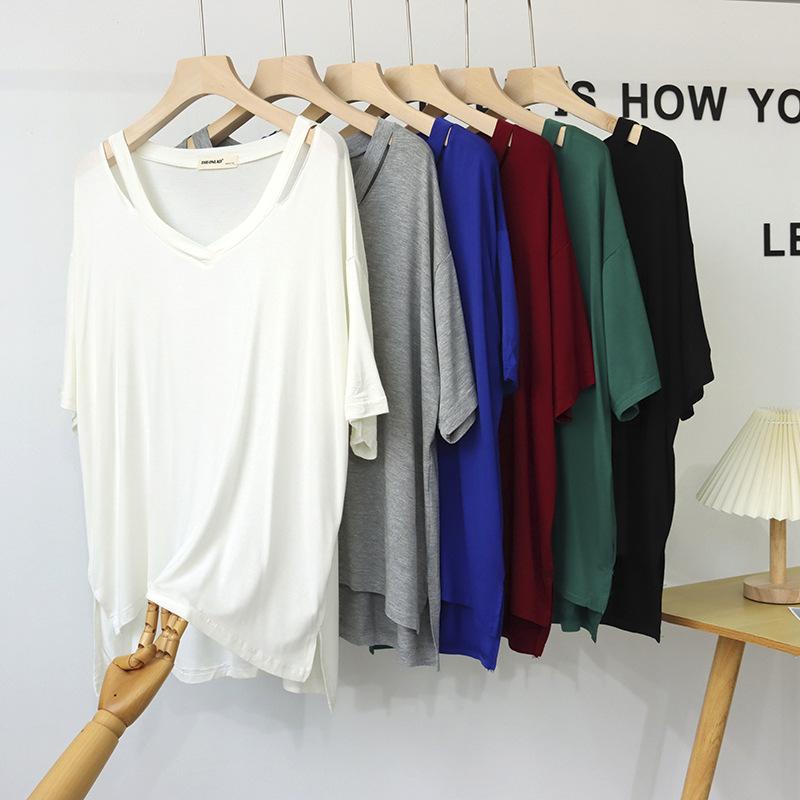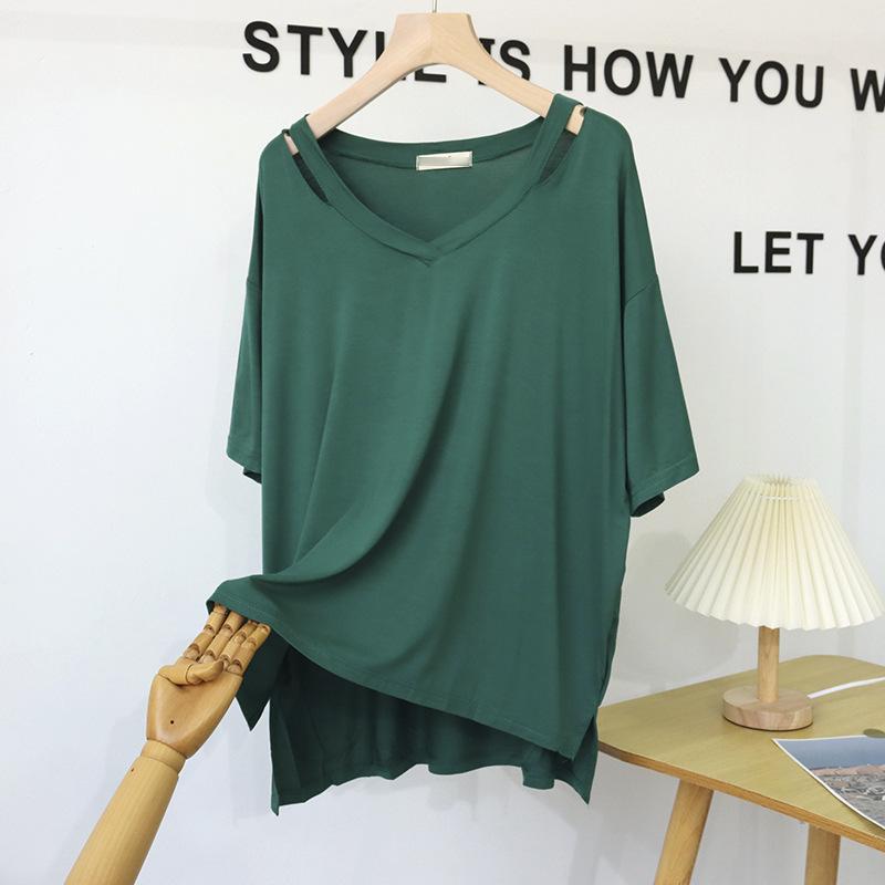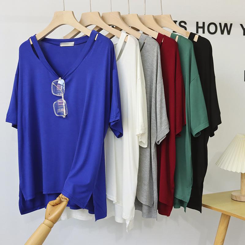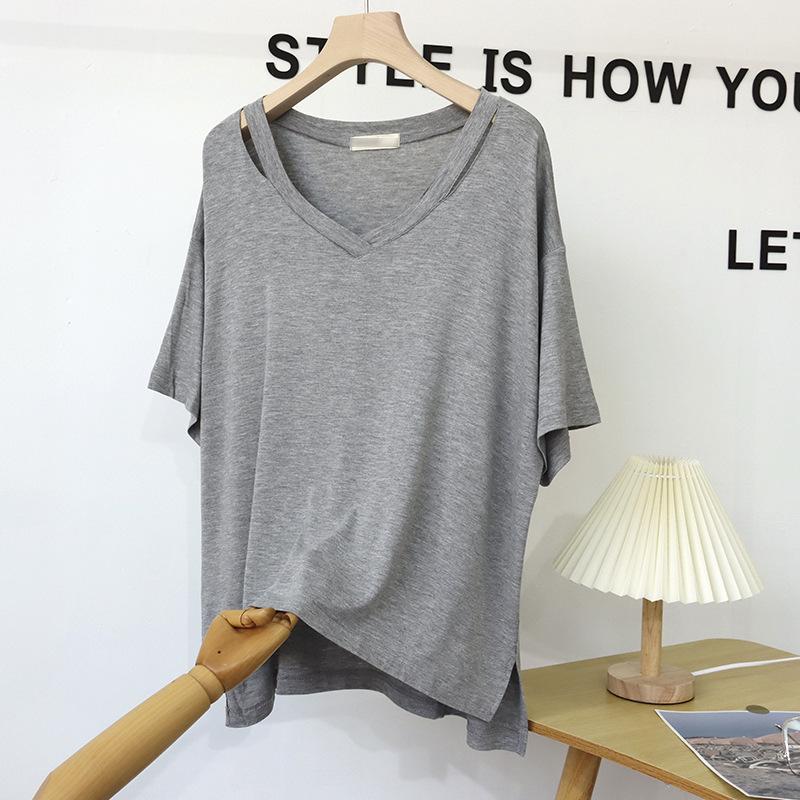 Camiseta modal con escote en V y hombros descubiertos para mujer, de manga corta, de verano, de estilo occidental, de moda, holgada, adelgazante y cubierta de piel.