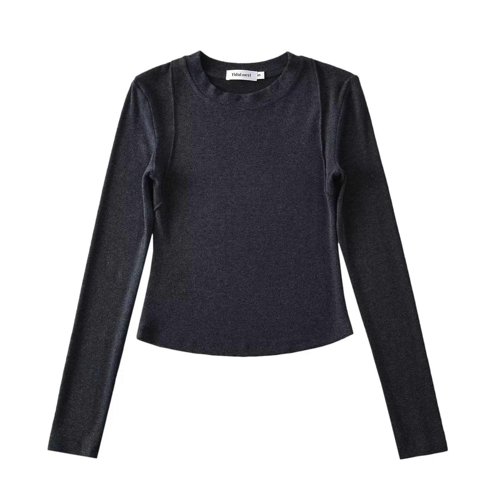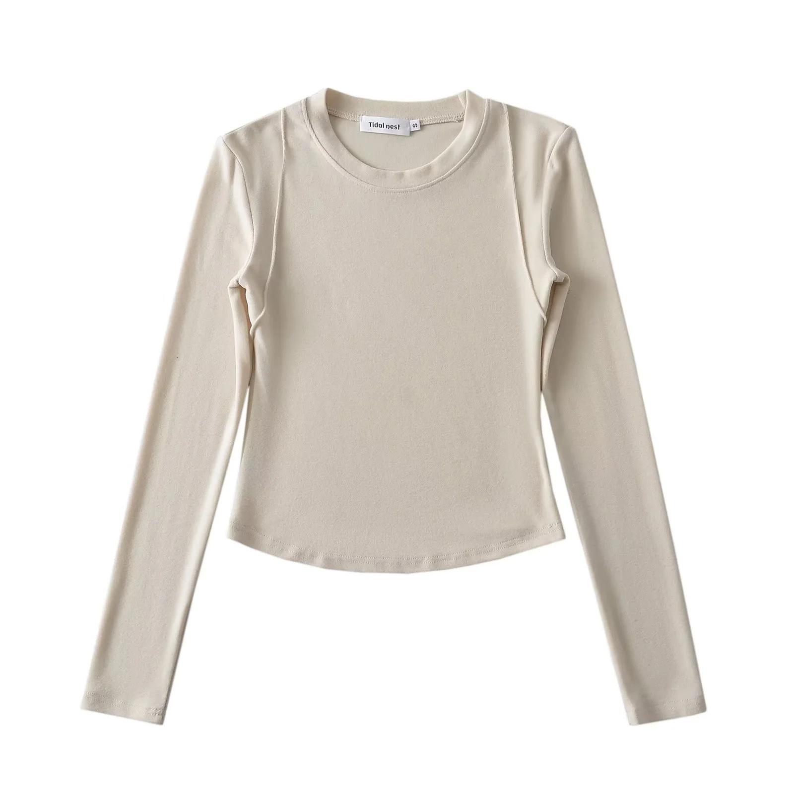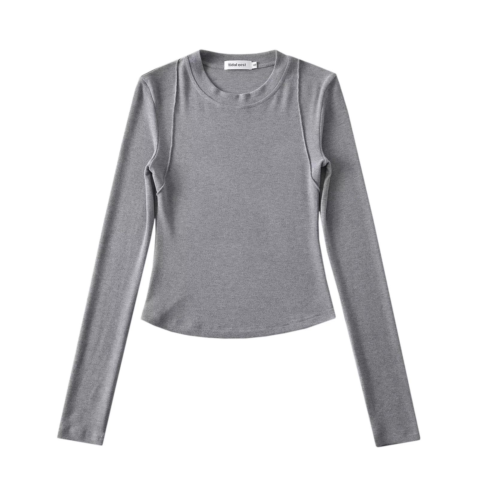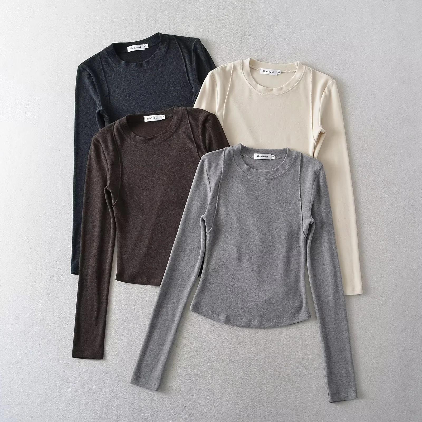 Compra Camiseta de manga larga para chica sexy europea y americana, top de cintura ajustada para mujer, otoño e invierno 2023, nueva camisa de cintura alta con costuras de cuello redondo y parte inferior corta al por mayor en Joom.pro