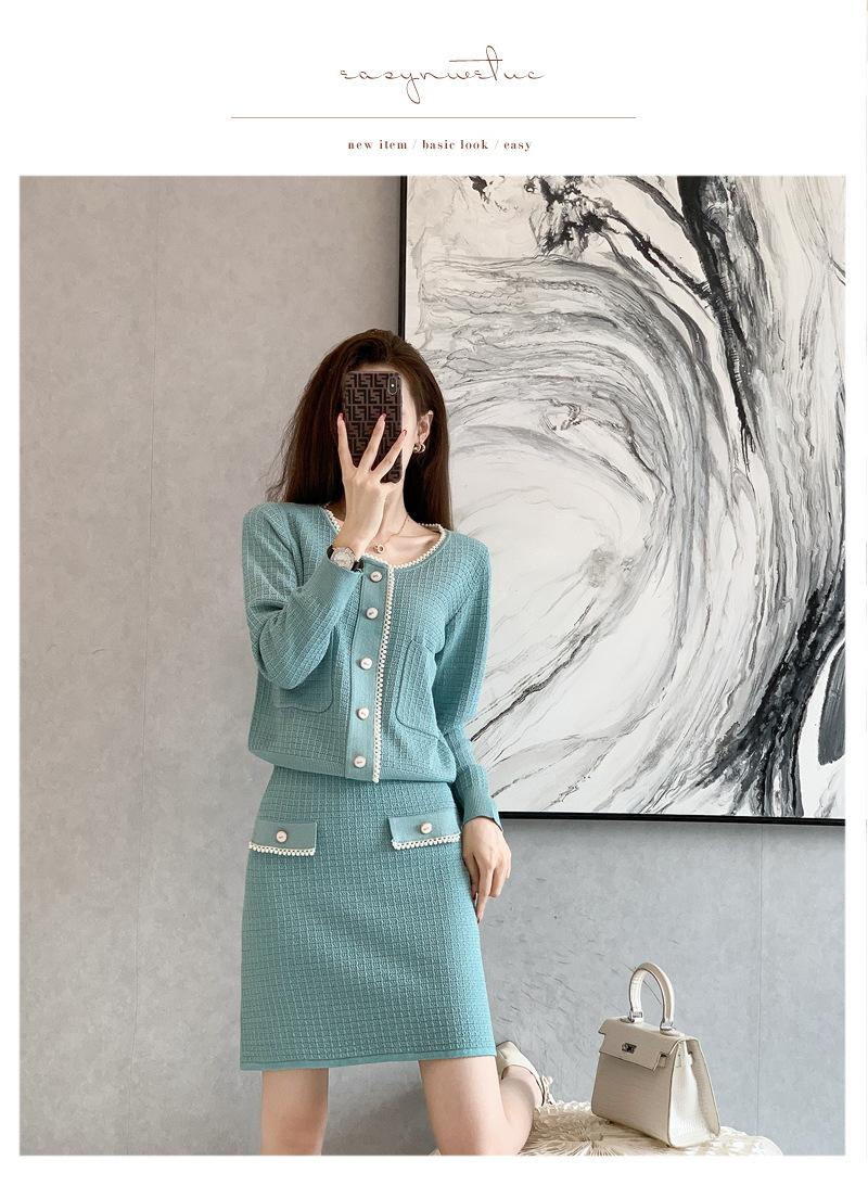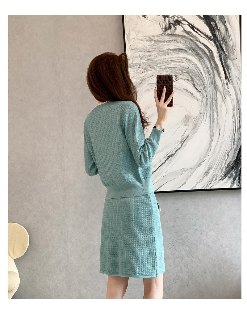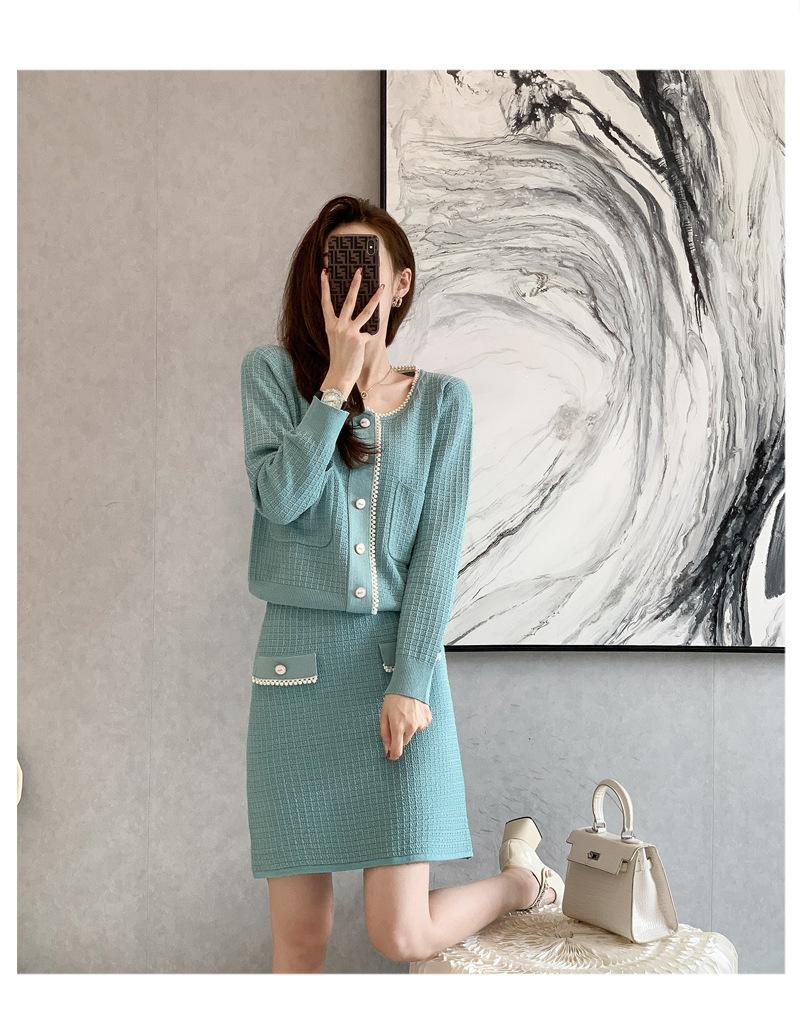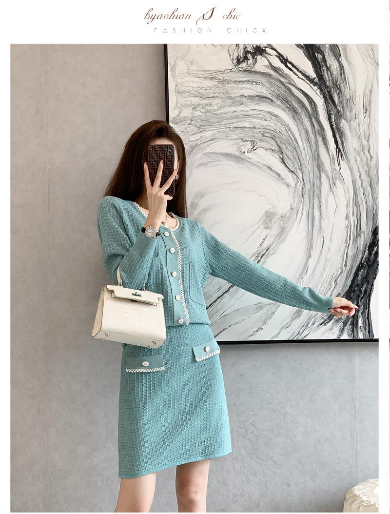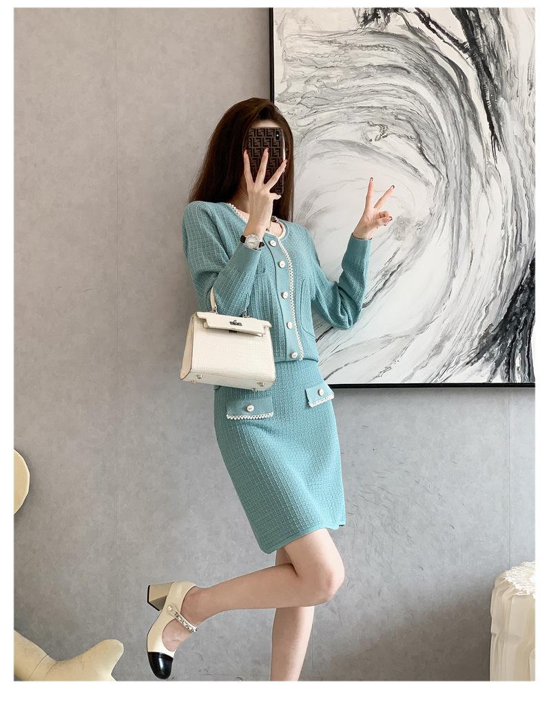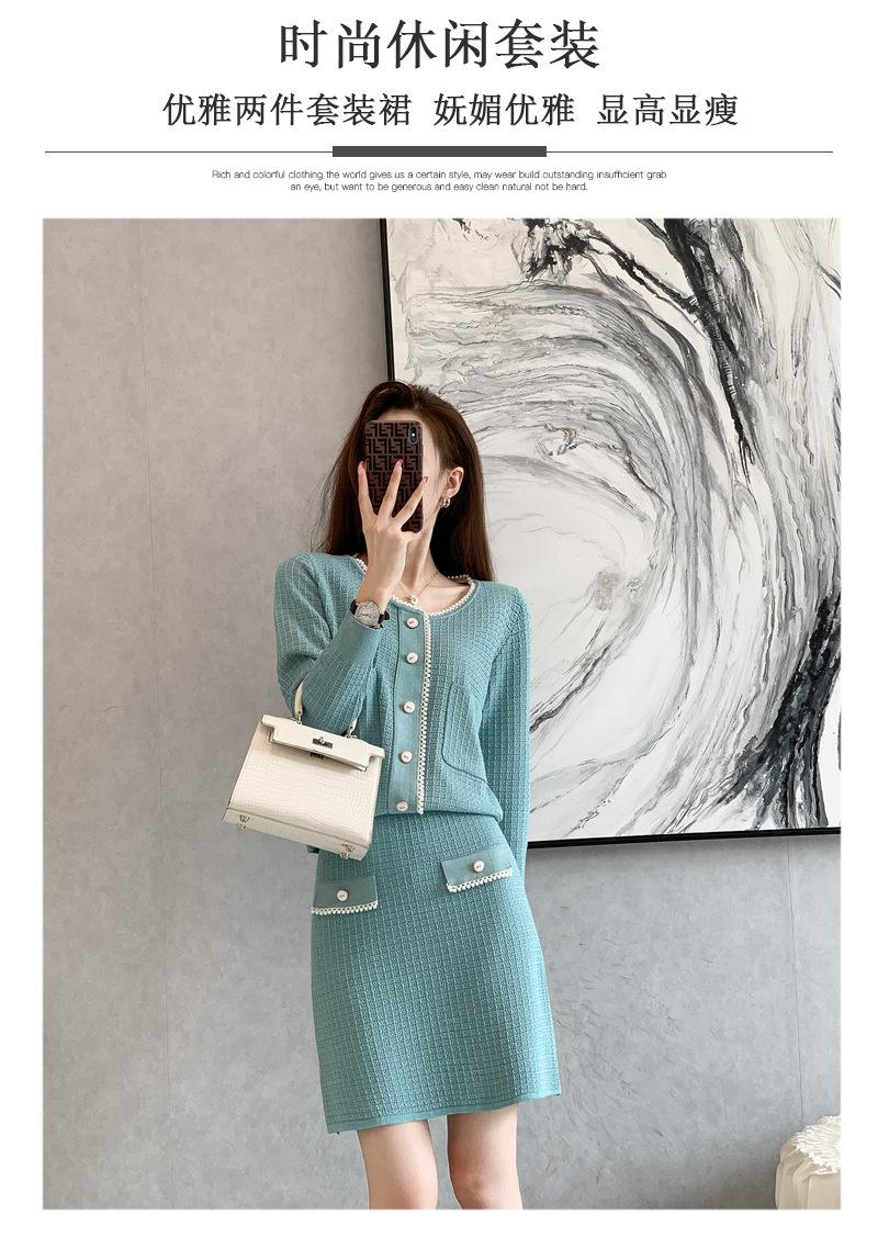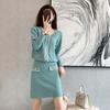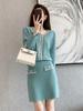 Ropa de Otoño 2024 Nuevo Estilo Estilo Francés para Mujer Vestido de Traje de Punto de Dos Piezas Azul de Manga Larga con Cintura Corte A